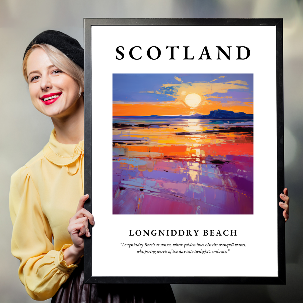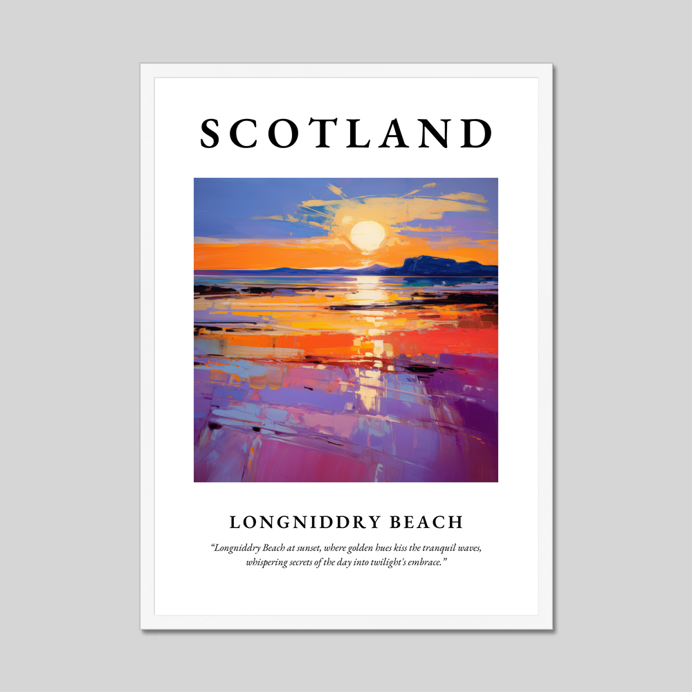 The poster reveals the word "SCOTLAND" in commanding typography, leading your eyes to the mesmerising painting of Longniddry Beach. The artwork bursts with vivid colours, where golden yellows and fiery oranges meet serene lilacs and deep blues, creating a dynamic interplay of light and shadow. Below the painting, a poetic quote captures the enchantment of the scene: “Longniddry Beach at sunset, where golden hues kiss the tranquil waves, whispering secrets of the day into twilight's embrace.” This thoughtfully crafted piece transports you to a place where the beauty of nature meets the expressive power of abstract art.