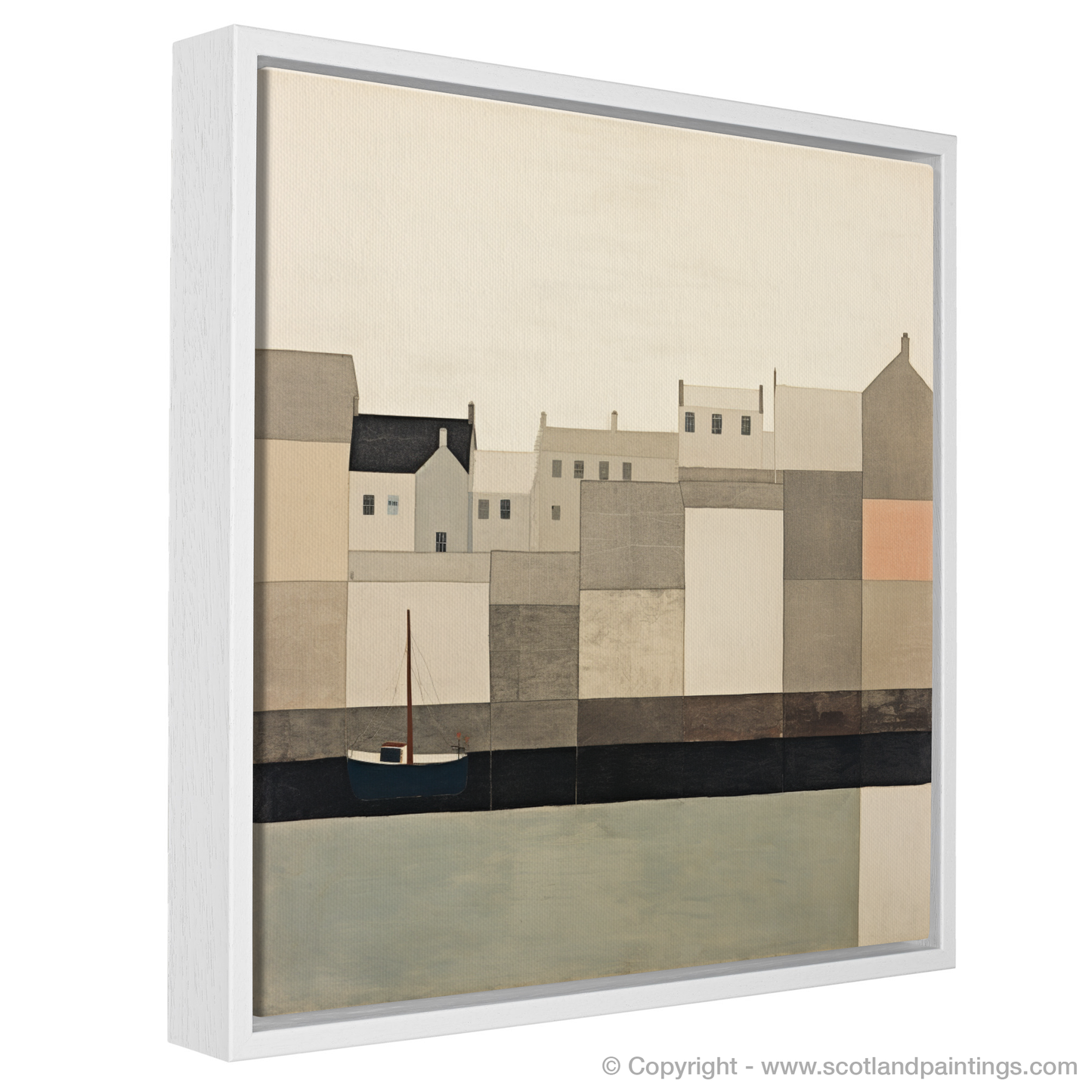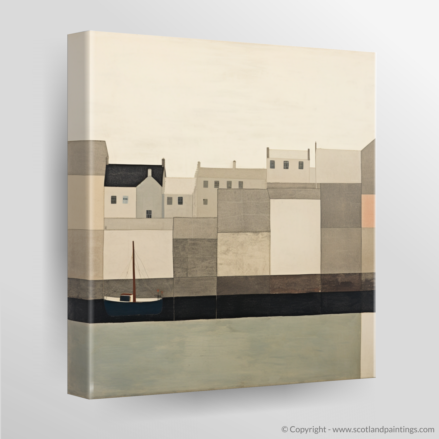 The piece presents a stylised version of the quaint harbour, where the essence of the traditional architecture is captured in an array of simplified, interlocking shapes. Soft whites, subtle greys, and gentle beiges dominate the composition, interspersed with occasional hints of pale blue and an understated blush accent, conveying both a timeless quality and a contemporary edge.