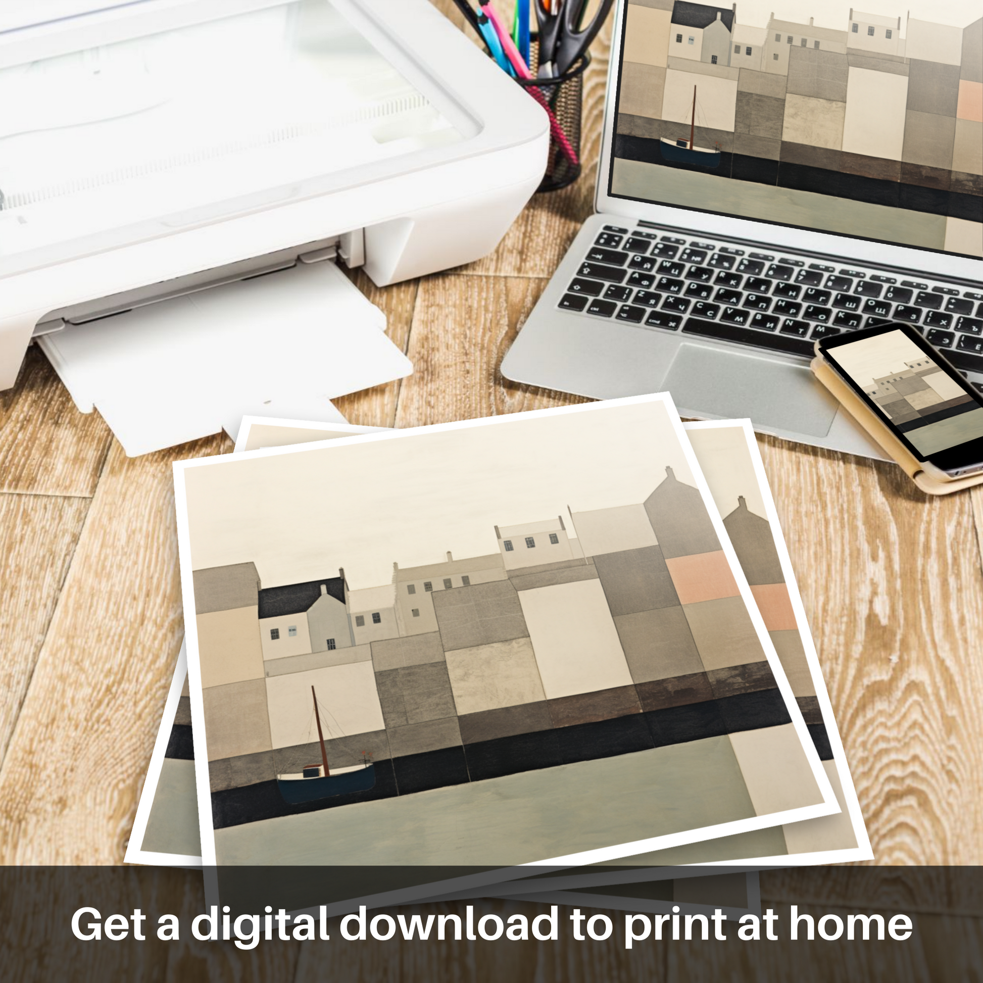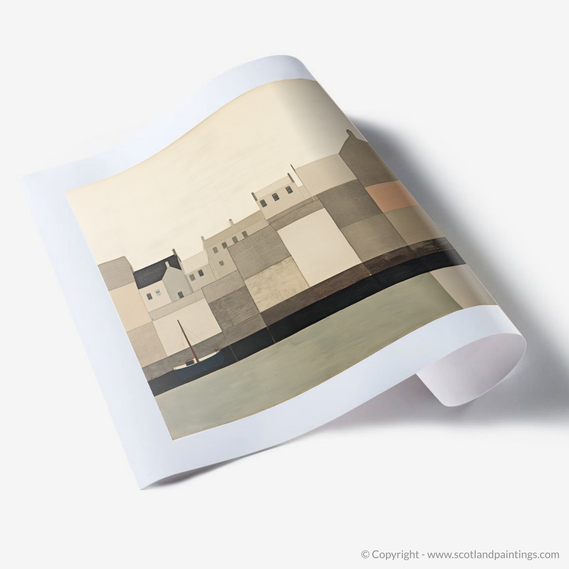 Immerse yourself in the tranquil beauty of a unique Scottish vista with our abstract interpretation of St Monans Harbour, a charming highlight from our 'Scottish Harbours' collection. This evocative print conjures the serenity and mystique of Fife's coastal gem through a tapestry of muted earthy tones and geometrical forms.