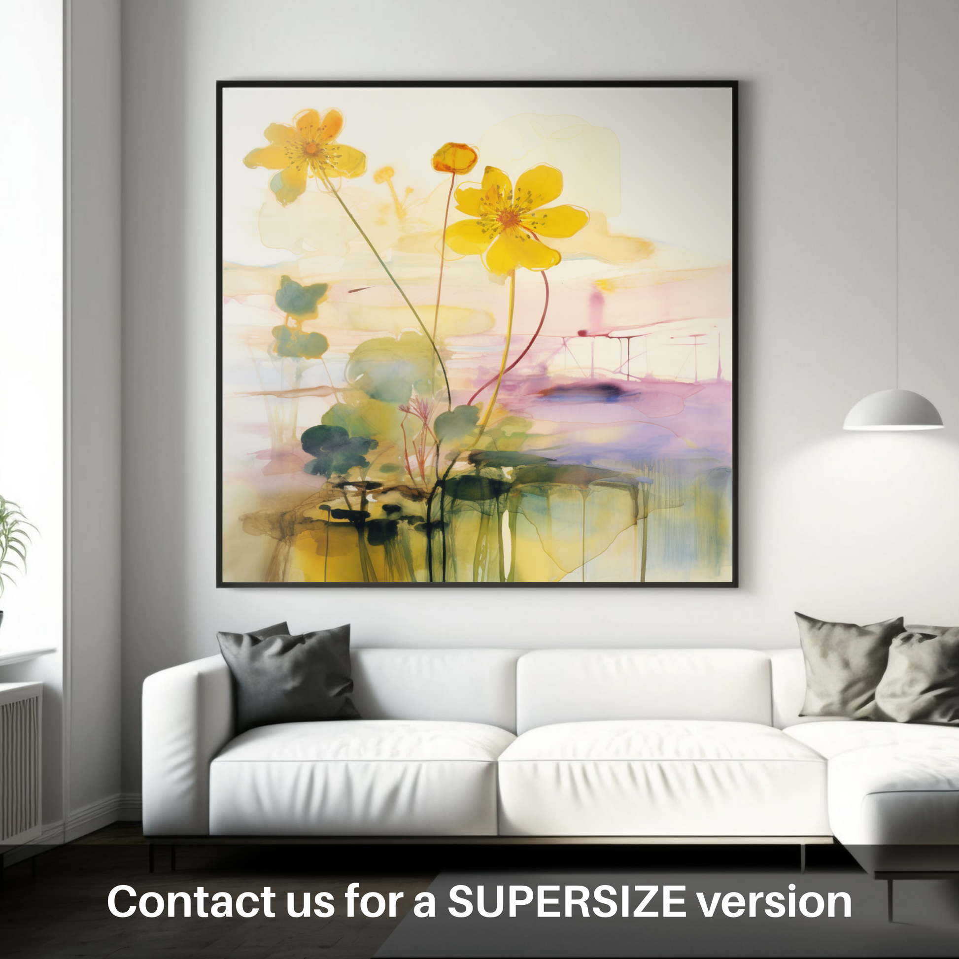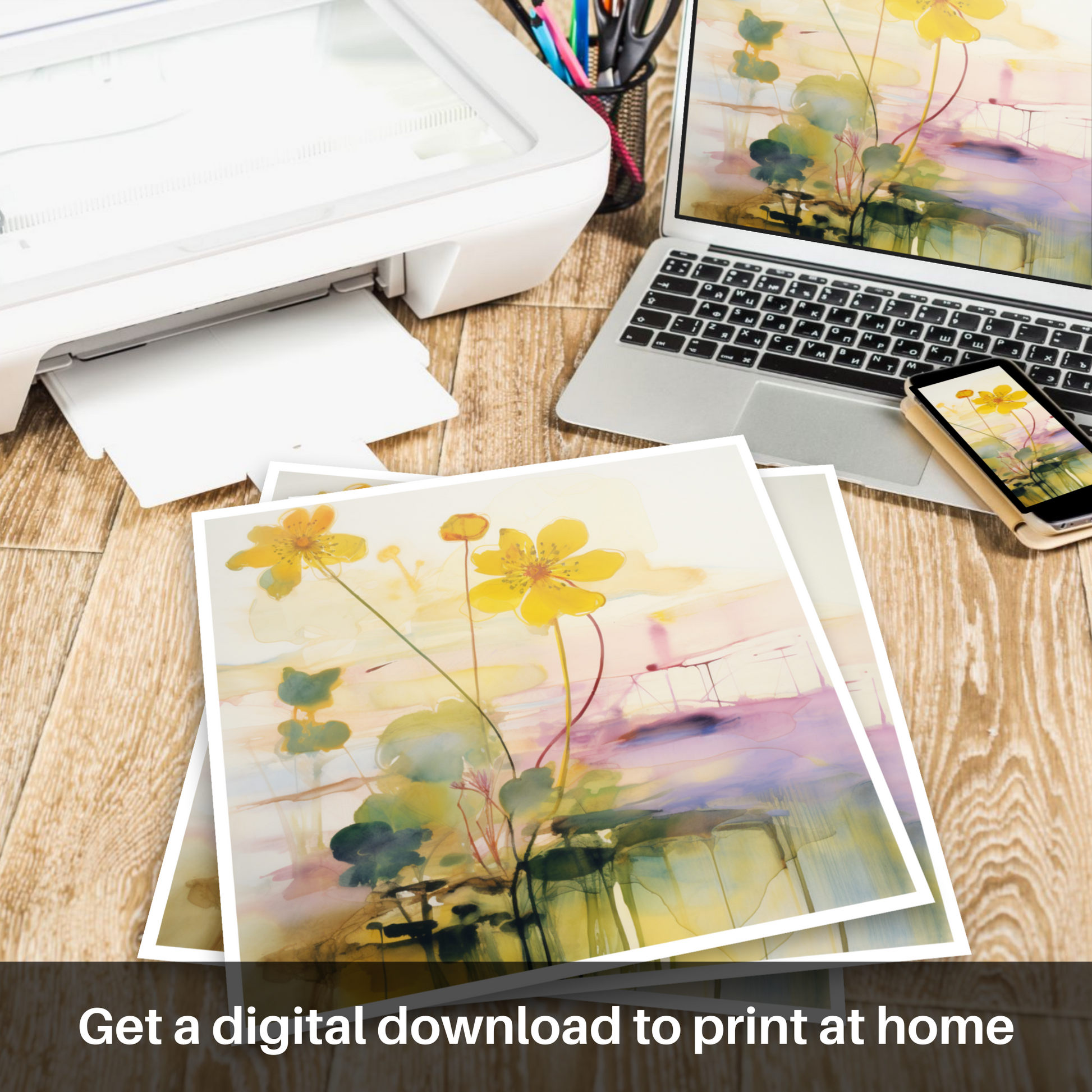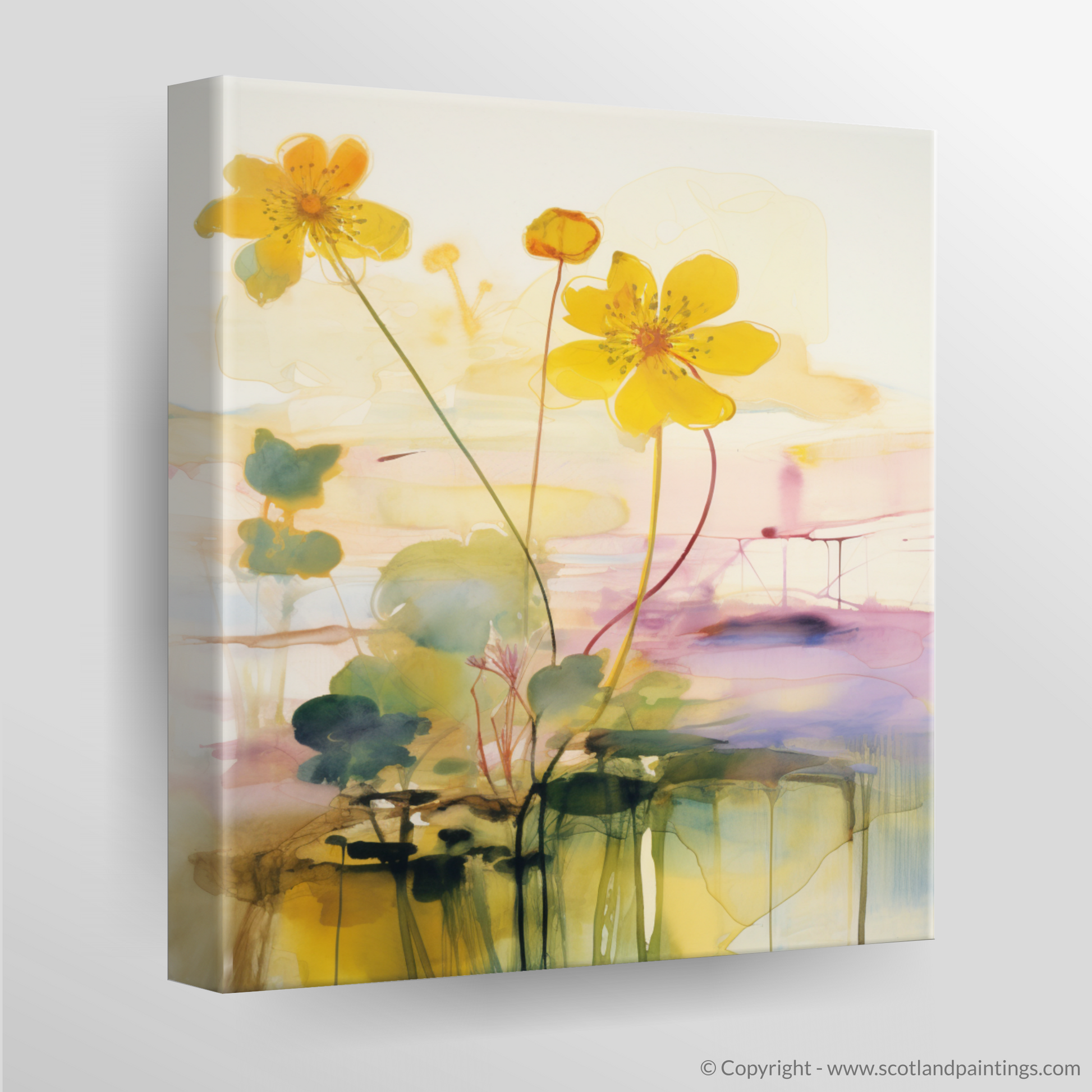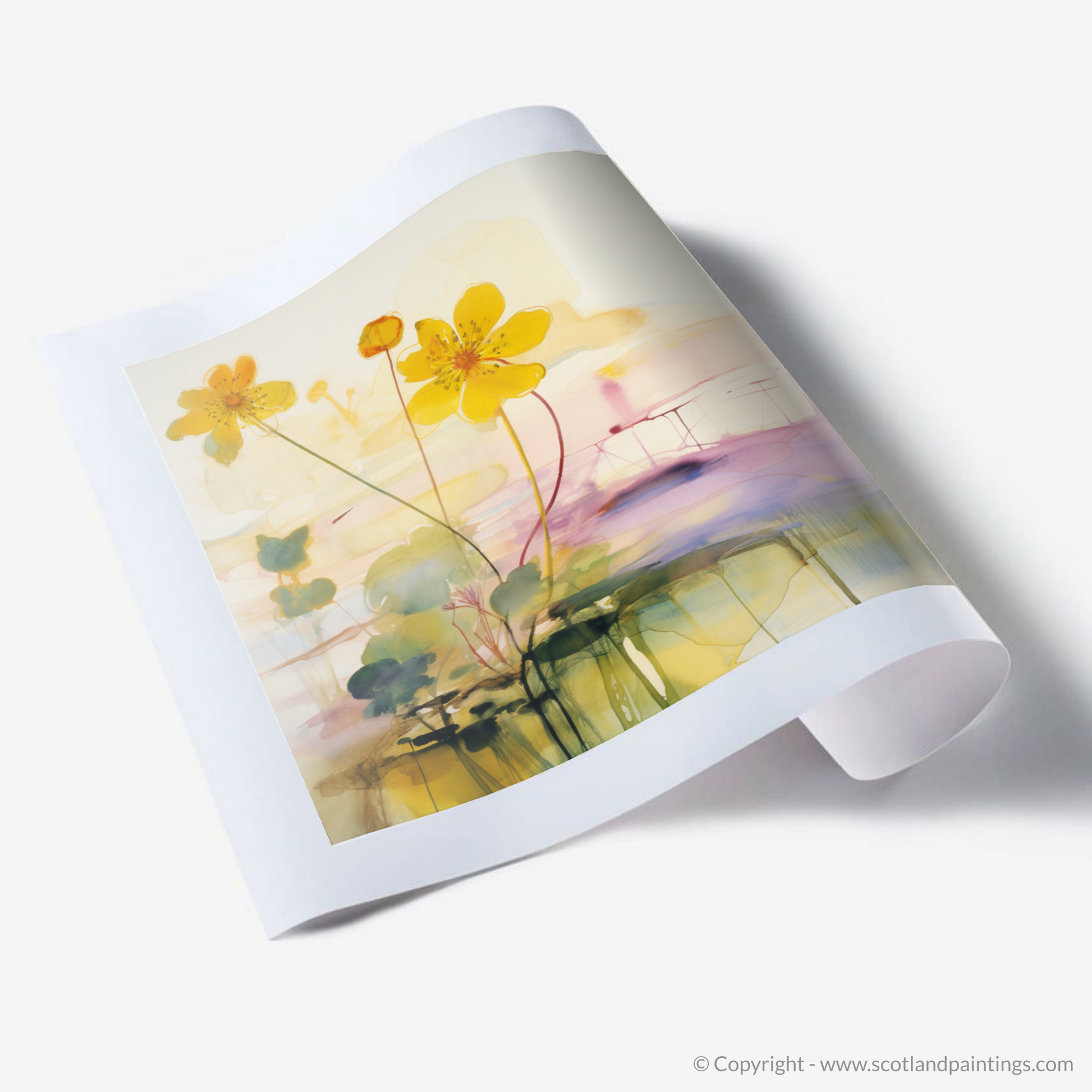 Immerse yourself in the lush wetlands of Caithness with this evocative abstract portrayal featuring the vibrant hues and ethereal beauty of its native flora. Wisps of water avens, whispers of lady's smock, and the sunny vibrancy of marsh marigold merge in a dreamlike tableau, transporting the viewer to a serene Scottish landscape.