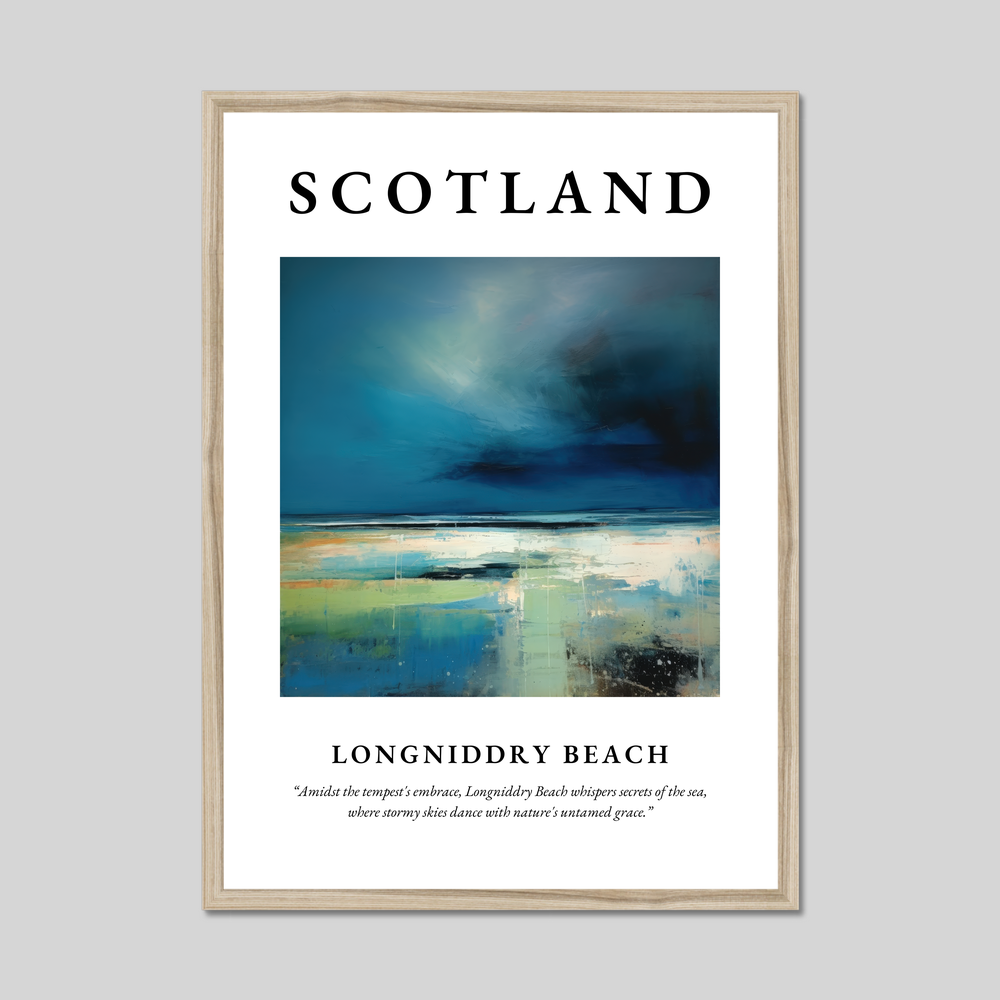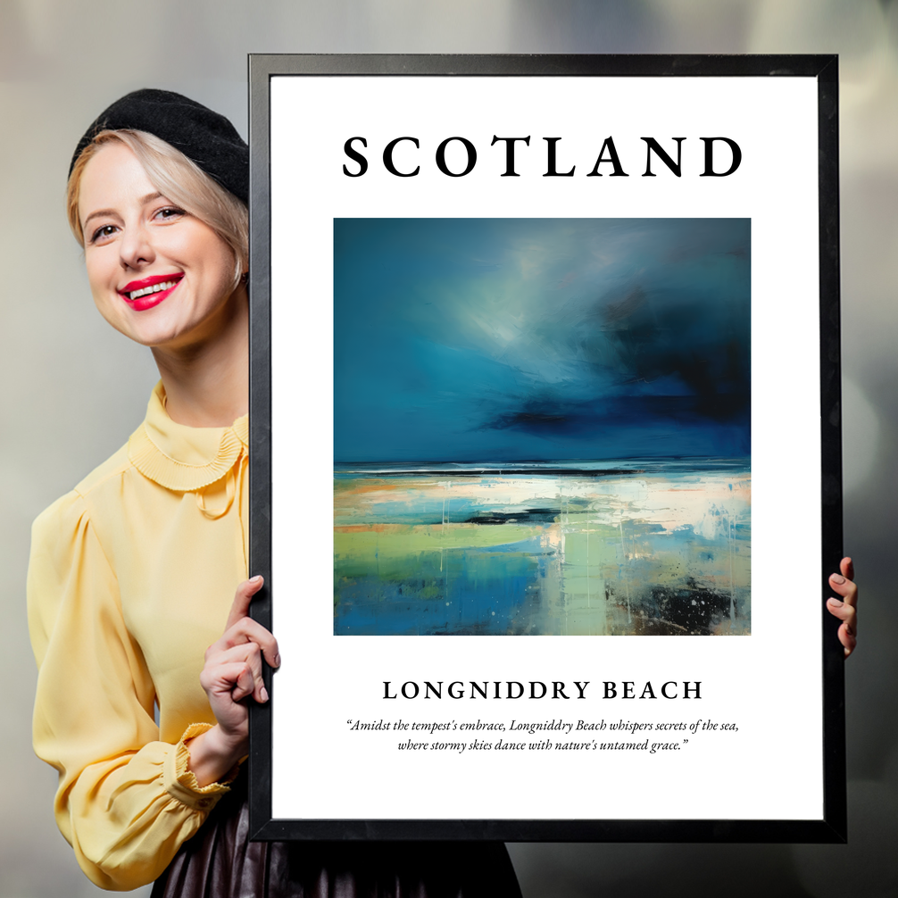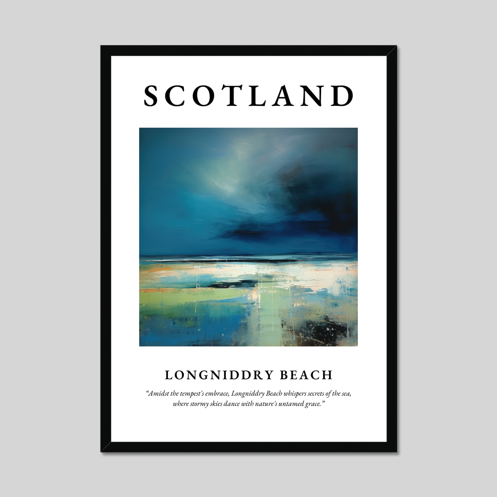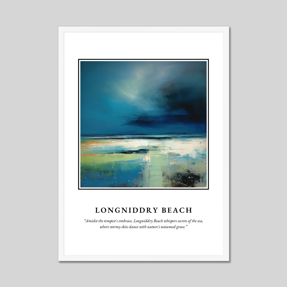At the top, “SCOTLAND” demands your attention, setting the stage for an awe-inspiring portrayal of Longniddry Beach. Below, in understated elegance, lies the poetic line: “Amidst the tempest's embrace, Longniddry Beach whispers secrets of the sea, where stormy skies dance with nature's untamed grace.” These words encapsulate the spirit of the scene, reflecting the untamed and ethereal nature of coastal Scotland.