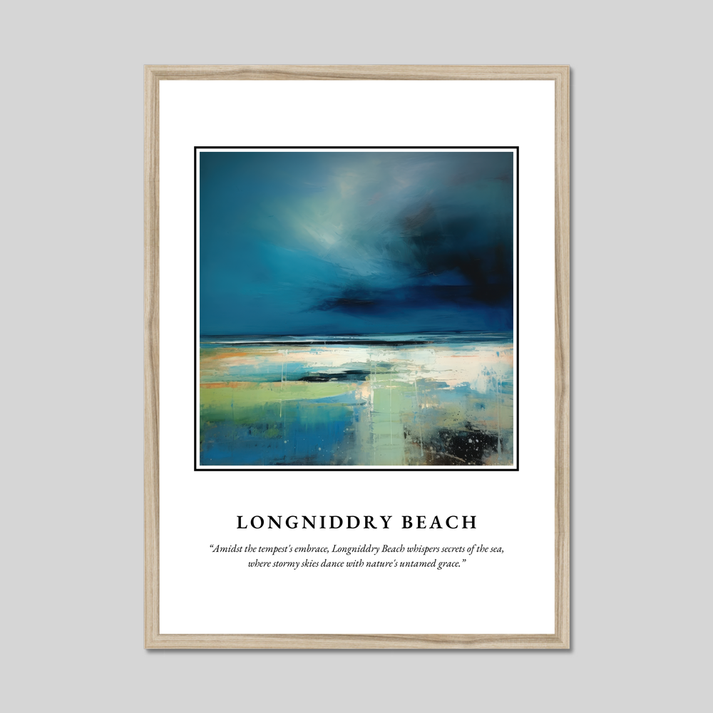 Elevate the ambiance of your space with our striking 50cm x 70cm framed poster print, a vibrant tribute to Scotland’s captivating coastlines. This substantial poster, available in black, white, or a natural wood-effect frame, offers a commanding presence, perfect for art enthusiasts or those with a deep connection to Scotland. Gracefully capturing the soulful essence of Longniddry Beach, this abstract masterpiece invites you to contemplate its wild beauty through a spectrum of colours and dynamic forms.