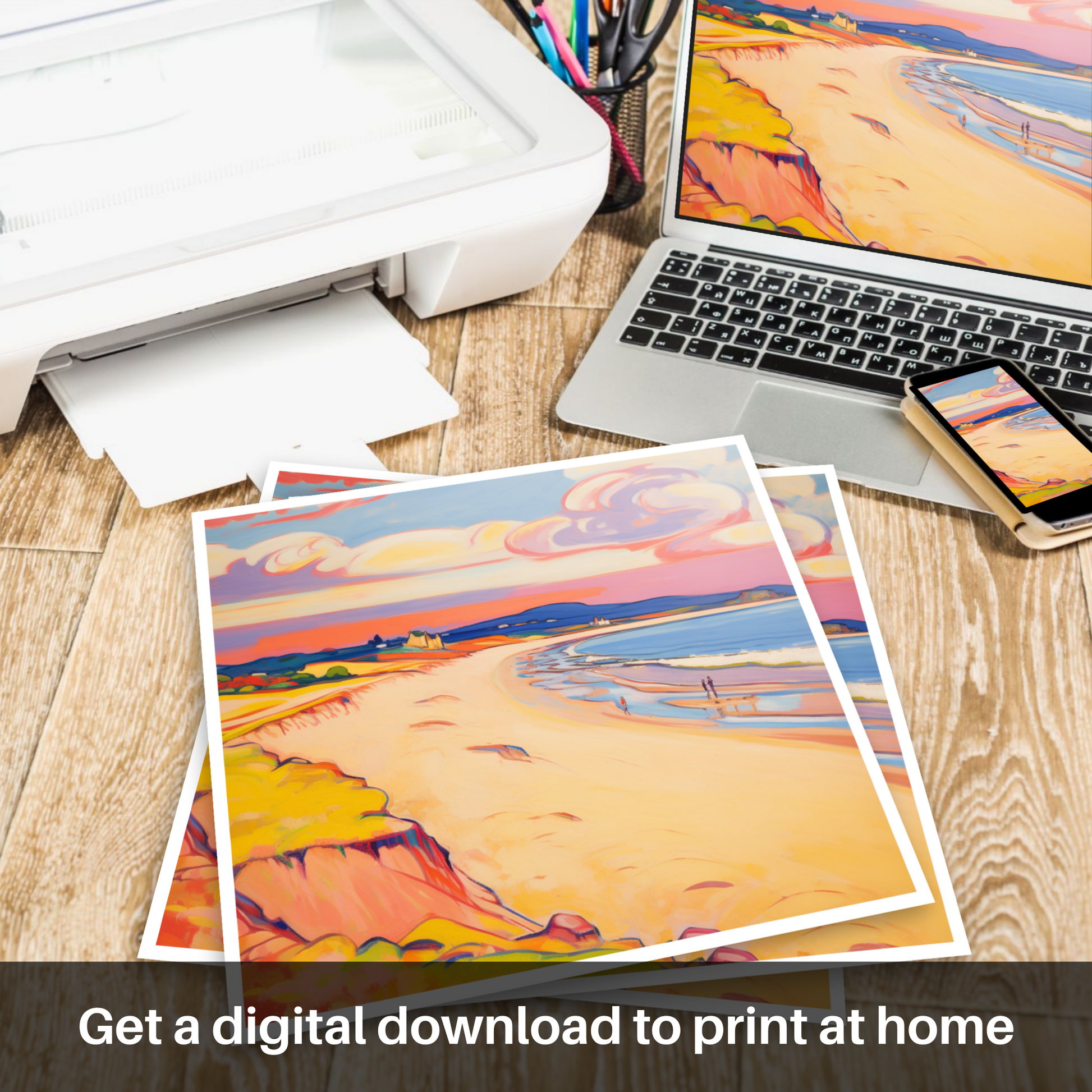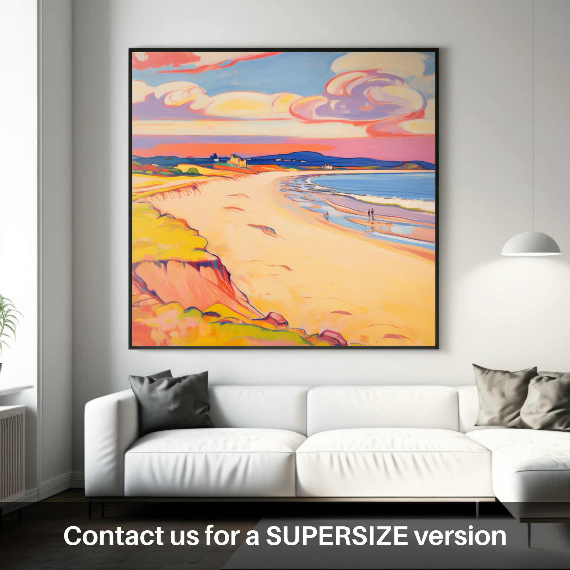 Immerse yourself in the vibrant embrace of Gullane Beach as it's bathed in the rich, warm hues of the golden hour. This striking print is a vivid portrayal of the serene Scottish shoreline, depicted through the bold and emotive lens of Fauvism - where color is unshackled from reality to evoke the feeling of the scene rather than its exactitude.