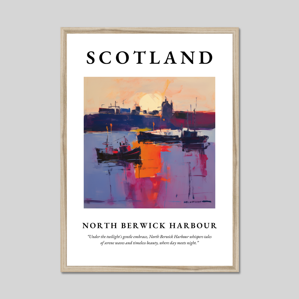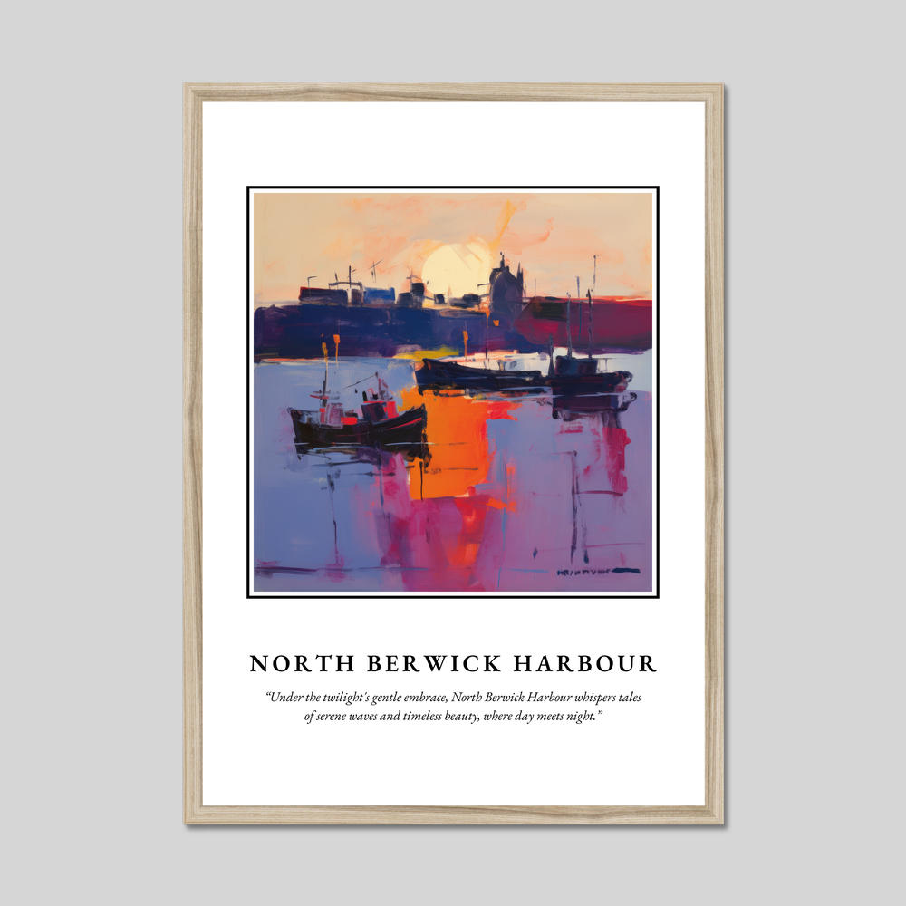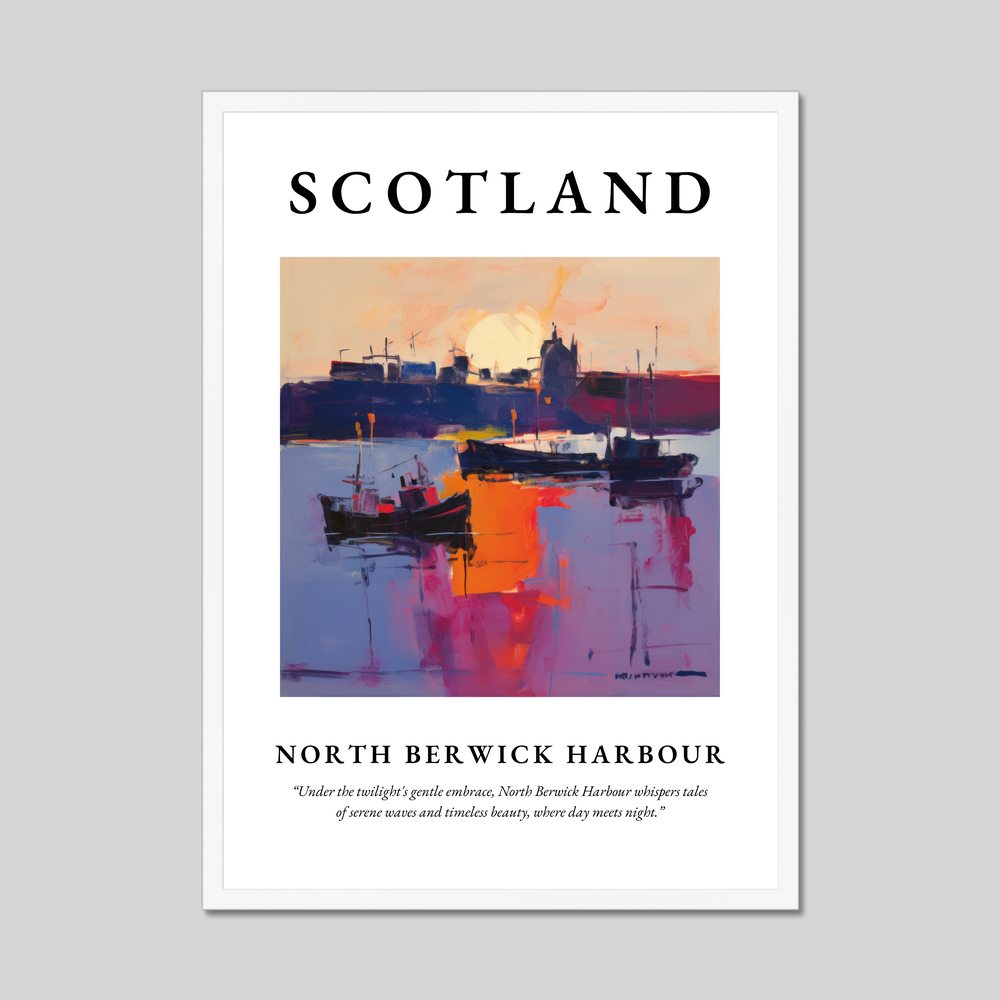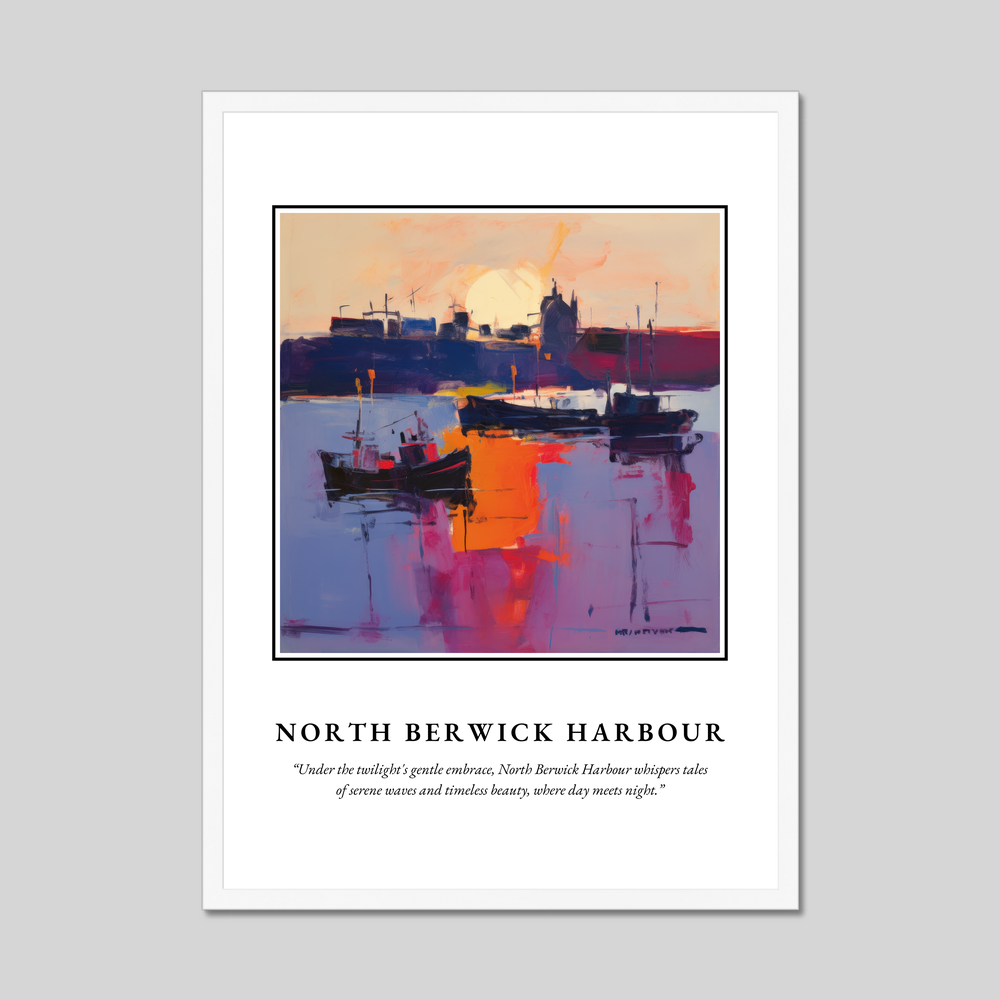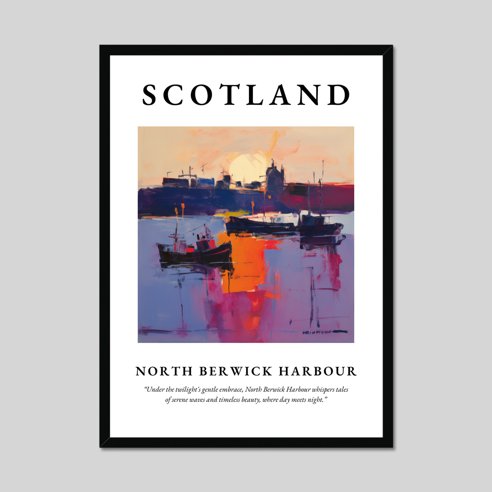 Featuring the word “SCOTLAND” in bold lettering, this poster draws your attention to the heart of the piece—a breathtaking painting of North Berwick Harbour. Executed in the evocative style of Abstract Expressionism, the artwork swathes the harbour in vibrant hues, resonating with the tranquil emotions and timeless tales of twilight. Beneath the painting, the poetic quote whispers, “Under the twilight's gentle embrace, North Berwick Harbour whispers tales of serene waves and timeless beauty, where day meets night.”