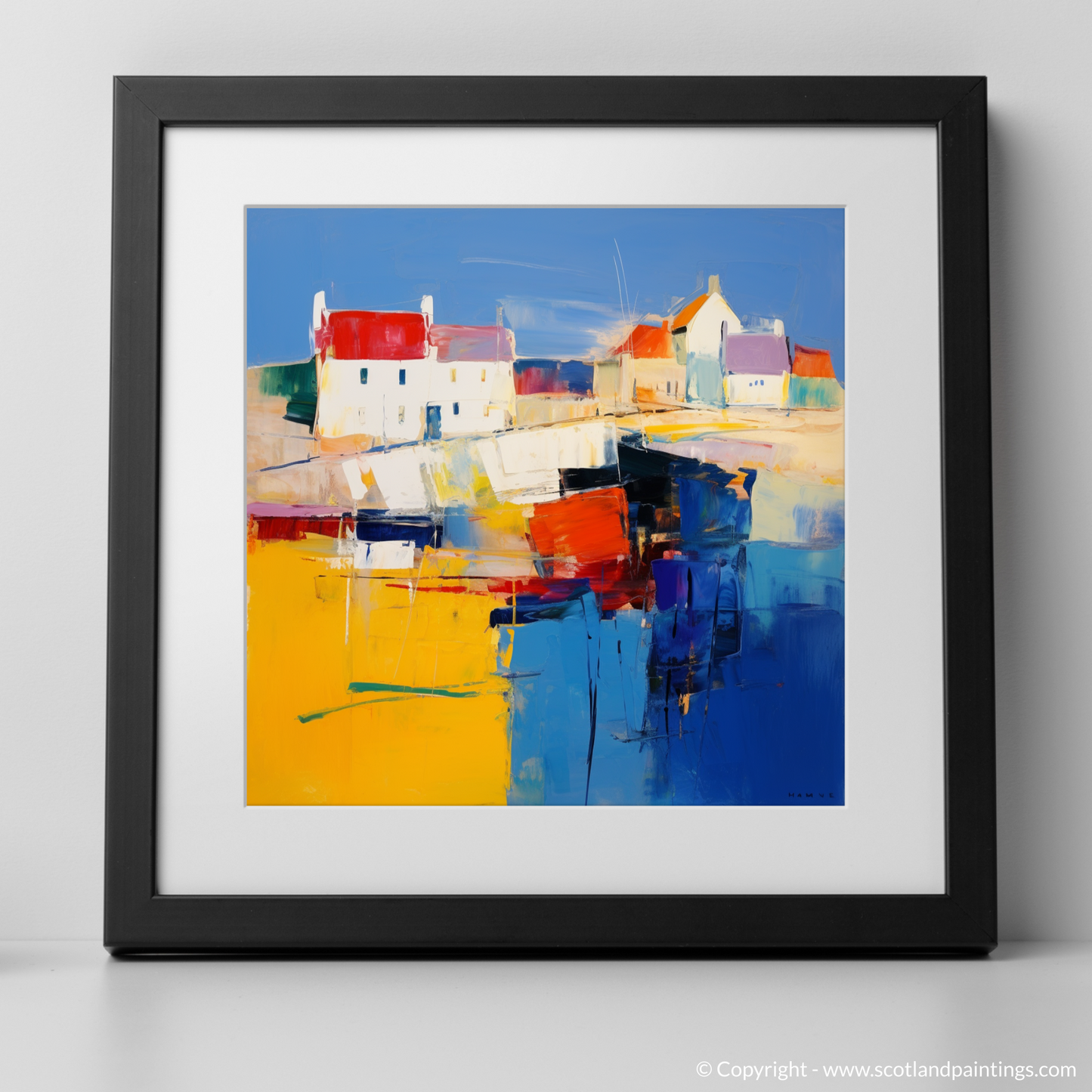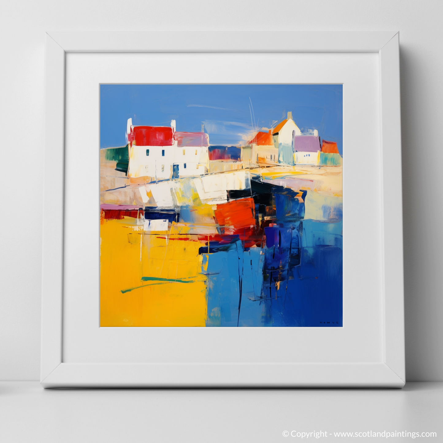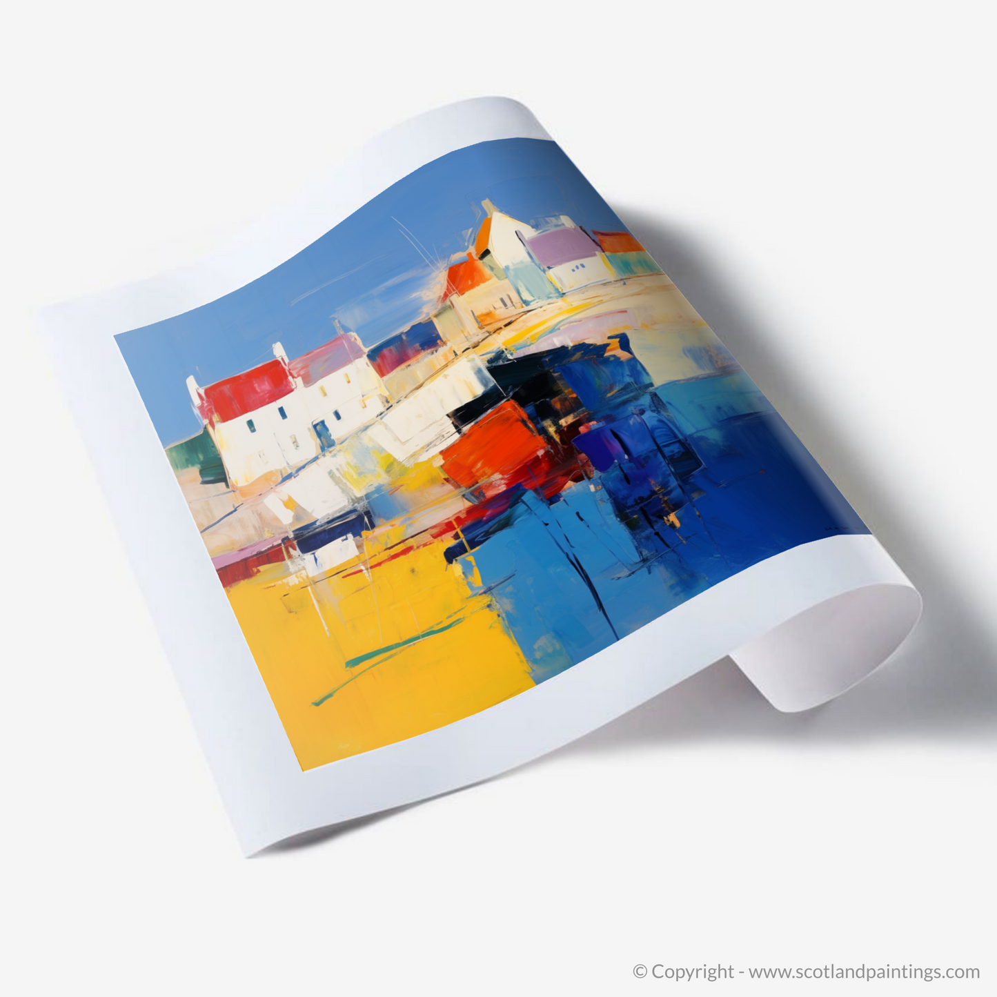 The scape in this print features bold strokes and a masterful use of colour to depict the quaint architecture synonymous with Scottish coastal towns. Buildings in a palette of whites, reds, and gentle pastels hint at the charming cottages that line this storied harbour. Their geometric forms are softened by the abstract style, turning familiar structures into intriguing shapes that dance across the canvas.