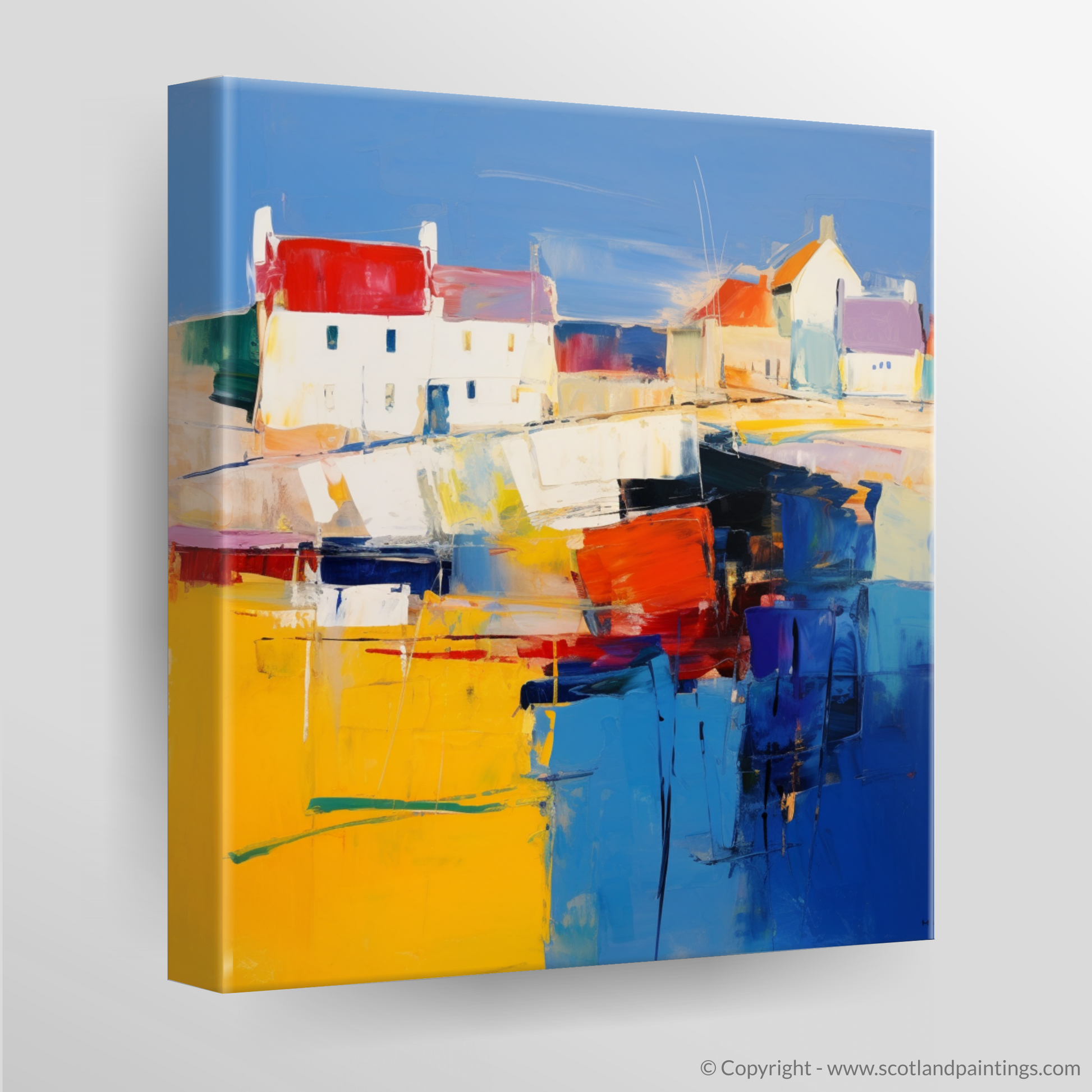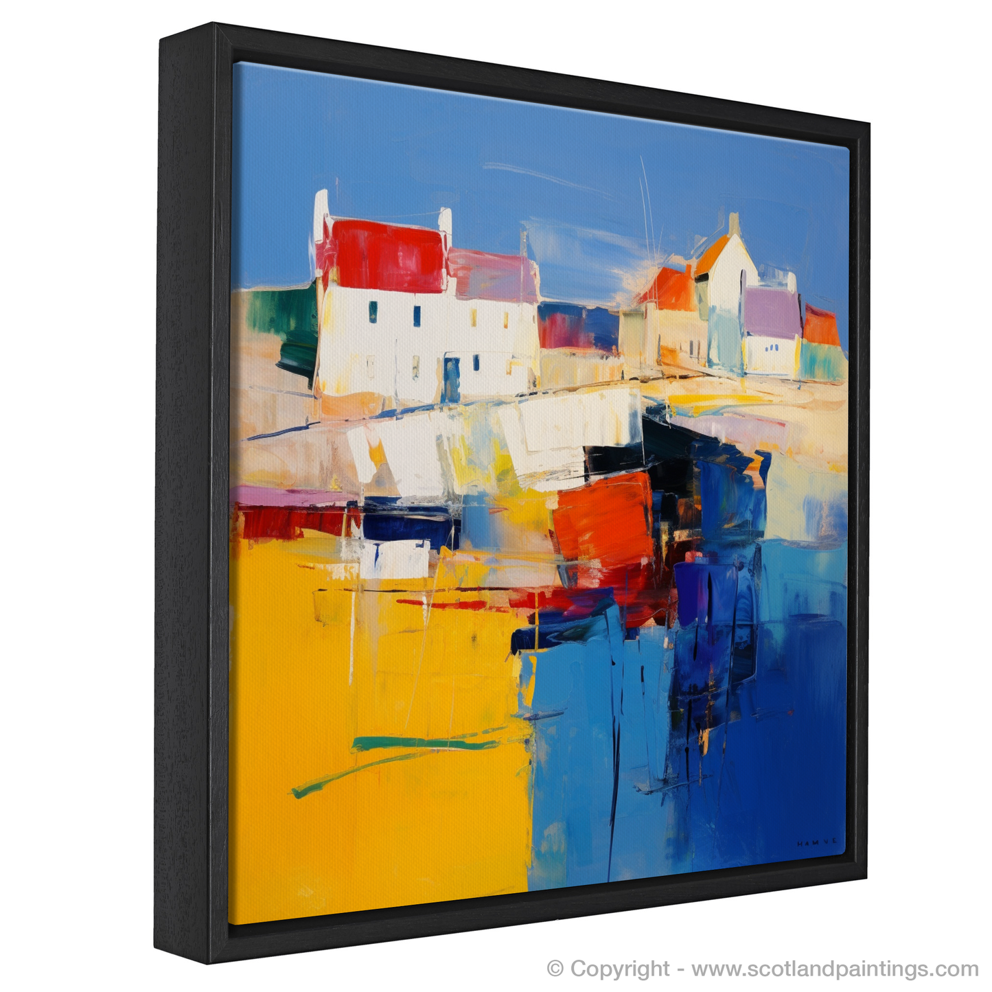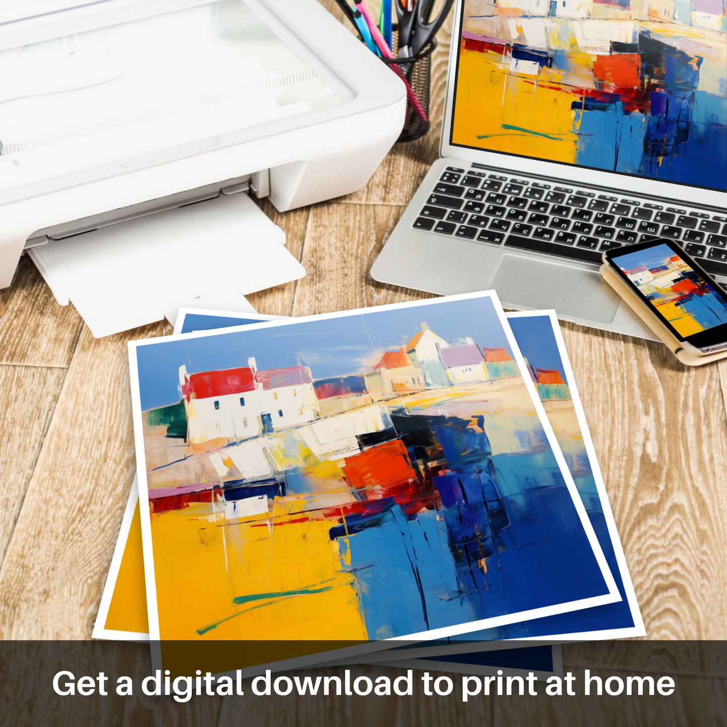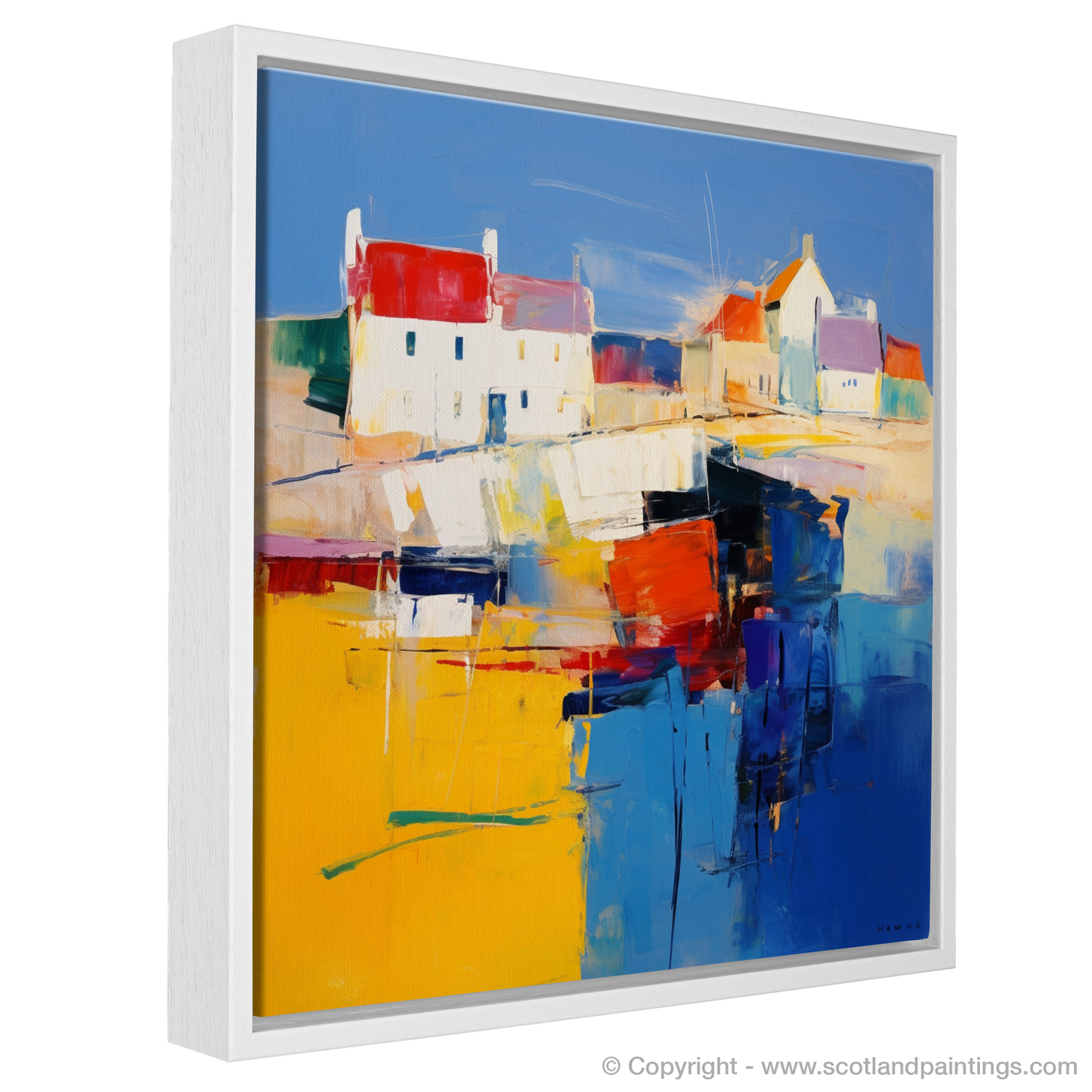 The scape in this print features bold strokes and a masterful use of colour to depict the quaint architecture synonymous with Scottish coastal towns. Buildings in a palette of whites, reds, and gentle pastels hint at the charming cottages that line this storied harbour. Their geometric forms are softened by the abstract style, turning familiar structures into intriguing shapes that dance across the canvas.