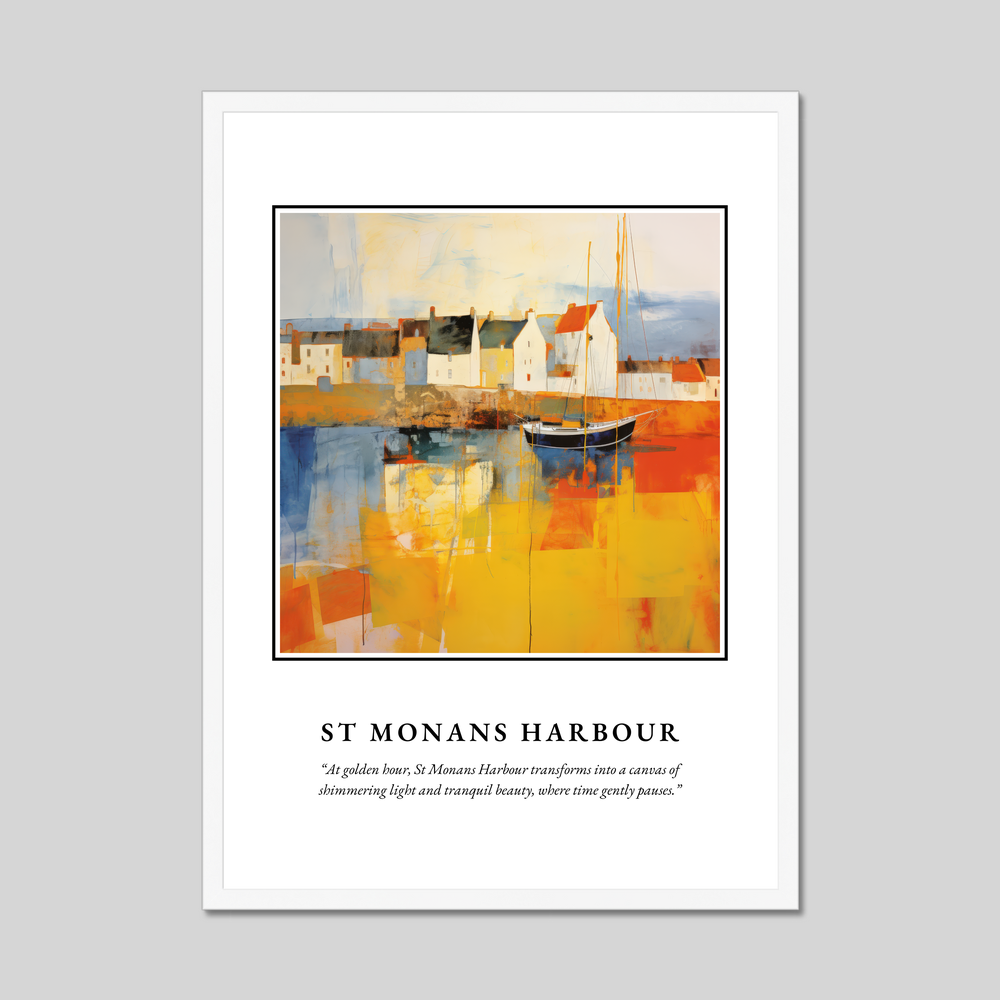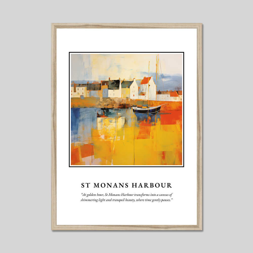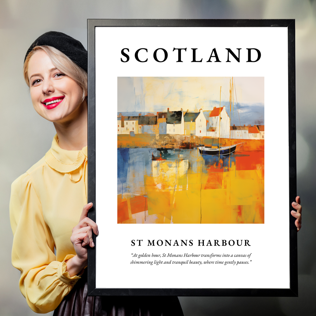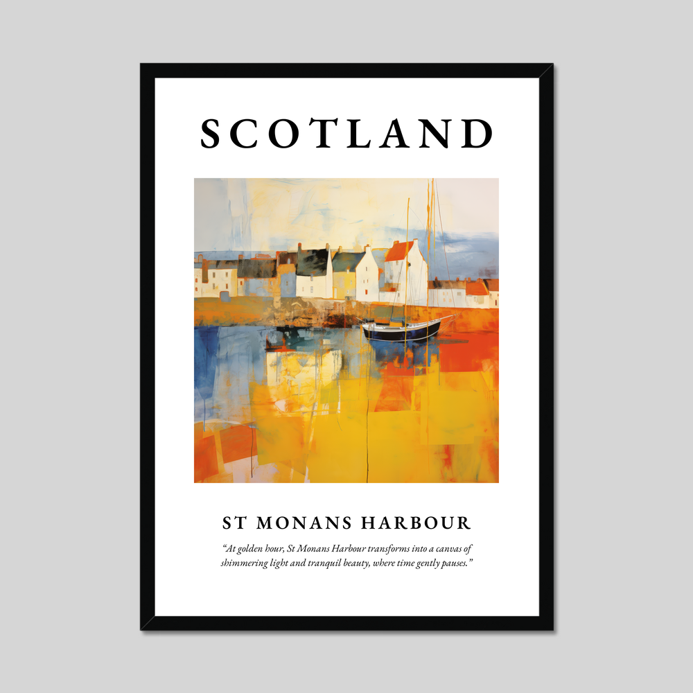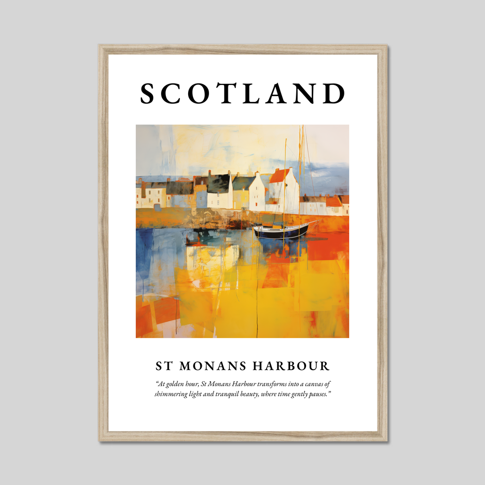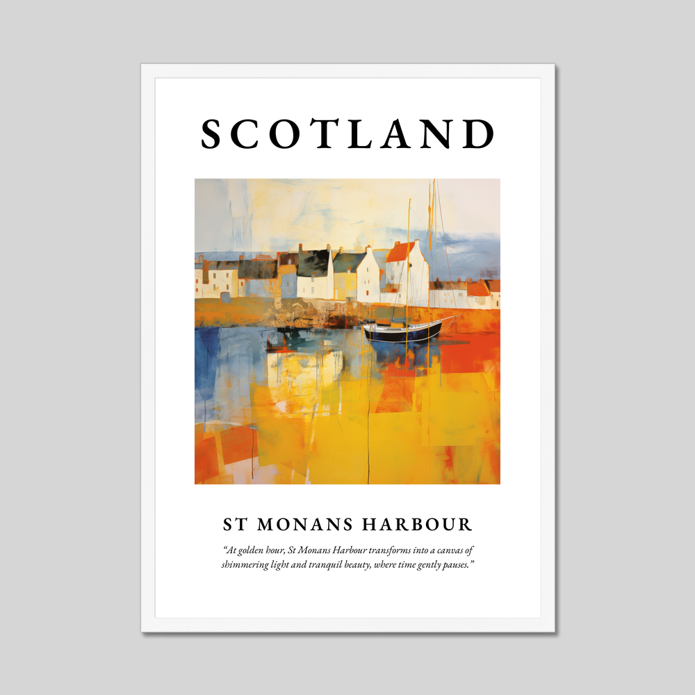 At first glance, the bold "SCOTLAND" heading captures your attention, drawing you into the heart of the harbour scene below. The abstract painting beautifully encapsulates the essence of St Monans Harbour, where hues of amber and azure interplay seamlessly. The artistry evokes a sense of tranquillity, a place where time feels gently paused, perfectly reflected in the accompanying quote, “At golden hour, St Monans Harbour transforms into a canvas of shimmering light and tranquil beauty, where time gently pauses.”