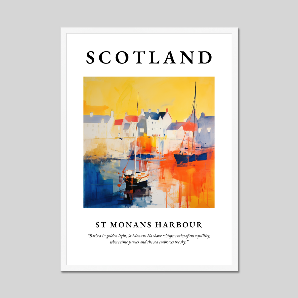 Visitors to St Monans are enchanted by its quiet streets, colourful houses, and the gentle sound of waves lapping at the harbour walls. The vivid hues and dynamic composition of this painting capture these elements, making this poster not just a visual delight but a heartfelt homage to one of Scotland’s coastal gems. Transform your space with a piece that speaks to the heart of Scotland’s maritime legacy and artistic soul.