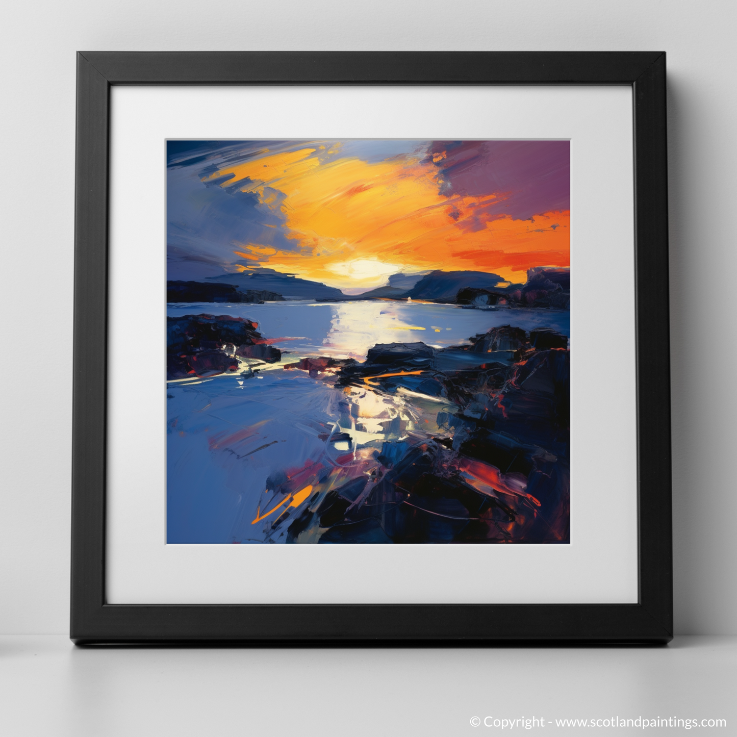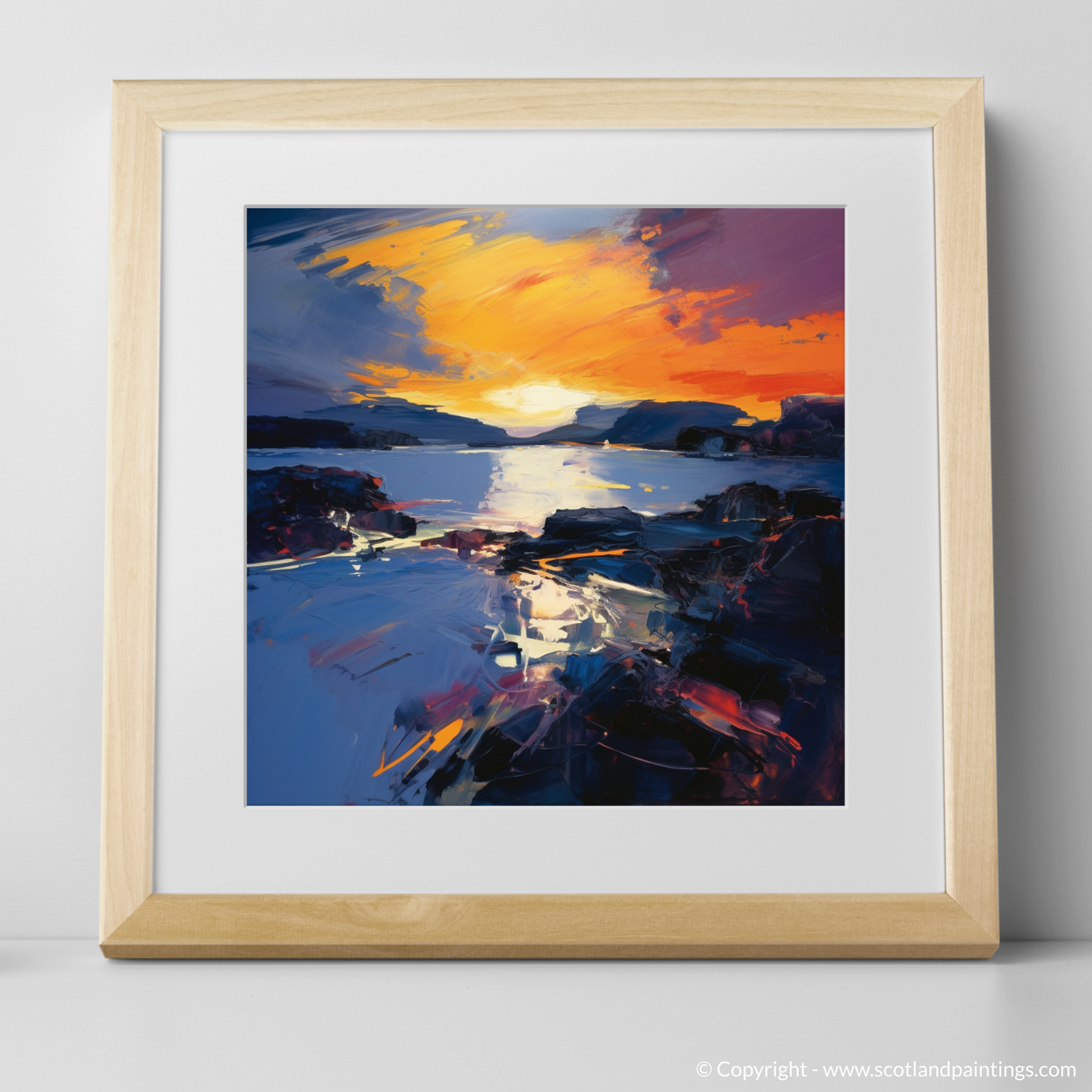 Awash with the vivid hues of a dusky sky, this stirring abstract expressionist piece captures the essence of Easdale Sound as daylight wanes. Dominated by an expanse of fiery oranges and calming yellows, the print sets aglow the heavens, which in turn reflect their splendour onto the tranquil waters below. Bold strokes and dynamic swashes of colour suggest movement and raw emotion, encapsulating the unpredictable beauty native to Scottish coves.