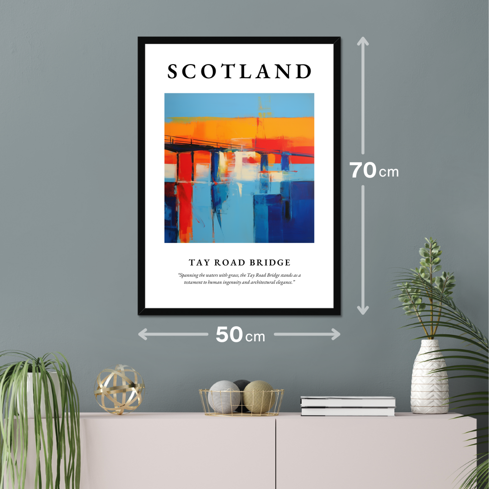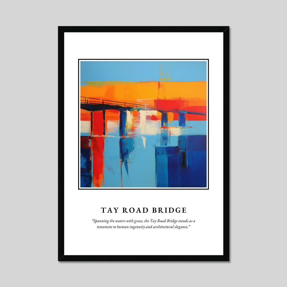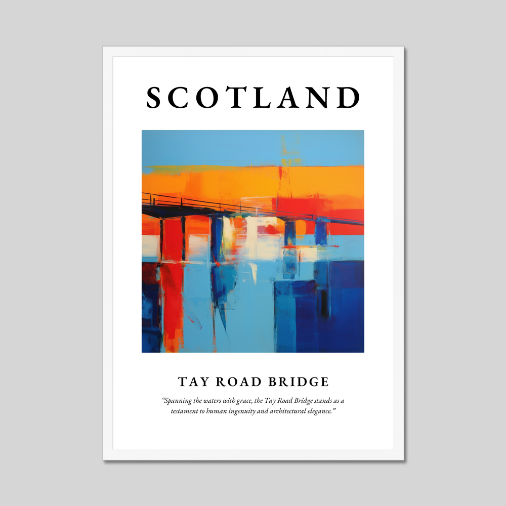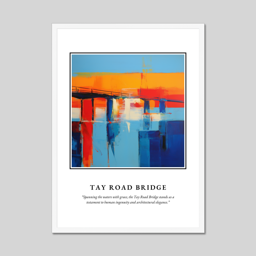 The Tay Road Bridge itself is a marvel of modern engineering, spanning the River Tay and connecting Dundee to Newport-on-Tay. Completed in the late 1960s, this vital transportation link has long been celebrated for its sleek lines and impressive functionality. The abstract art in this poster echoes the bridge's real-life dynamics, capturing its spirit and prominence against the Scottish landscape.