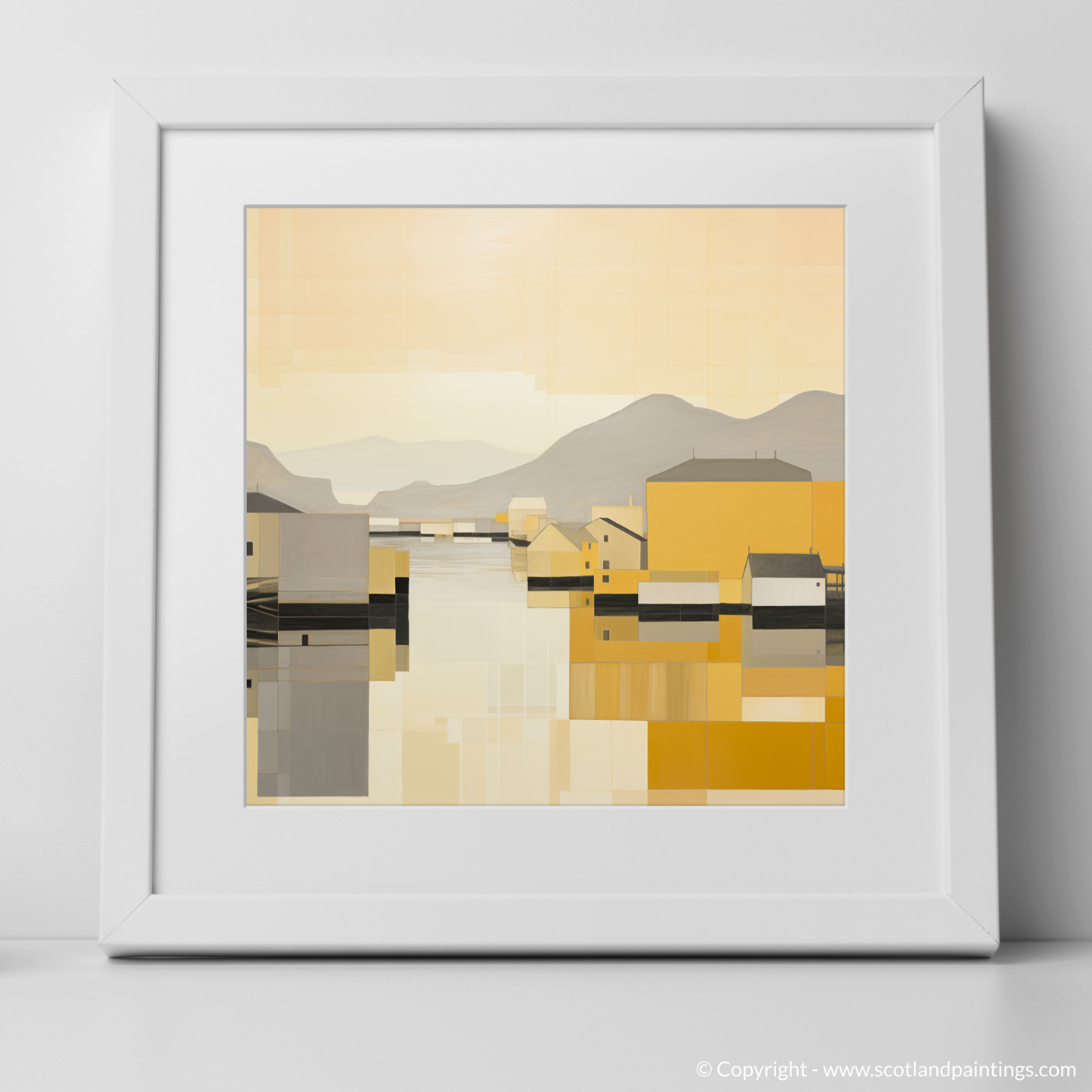 In this unique piece, stark contrasts between the golden yellows and muted grey-tones evoke the interplay of sunlight and shadow, mirroring the daily life that thrives within the harbour's embrace. The reflection of the structures on the rippling water adds to the impression of a landscape in gentle motion, inviting the viewer to reflect on the ever-changing moods of the Scottish coast.
