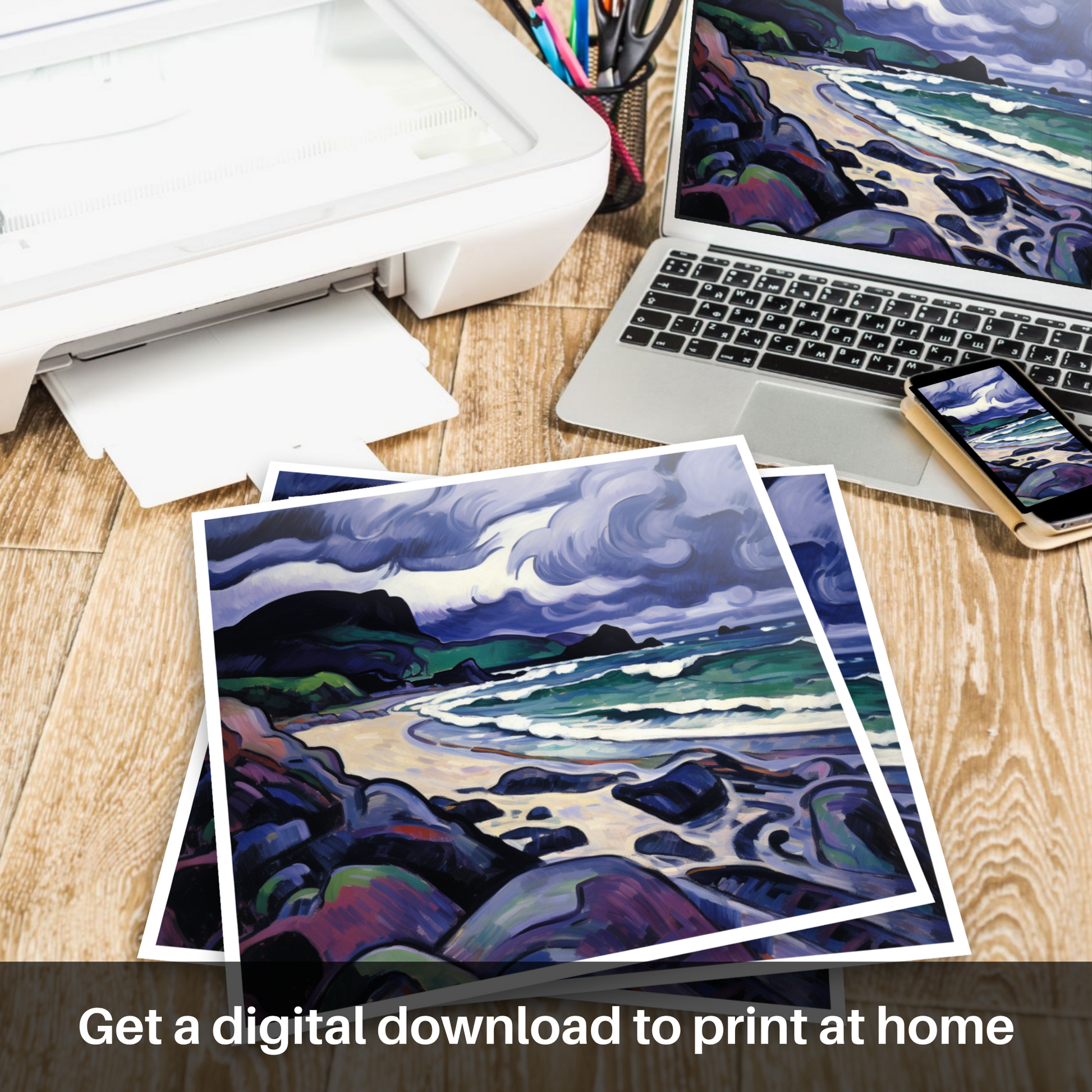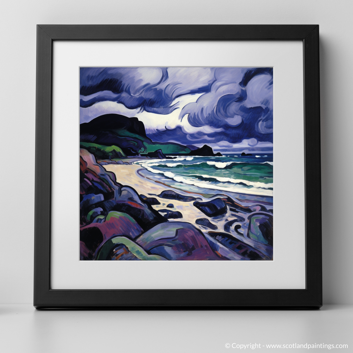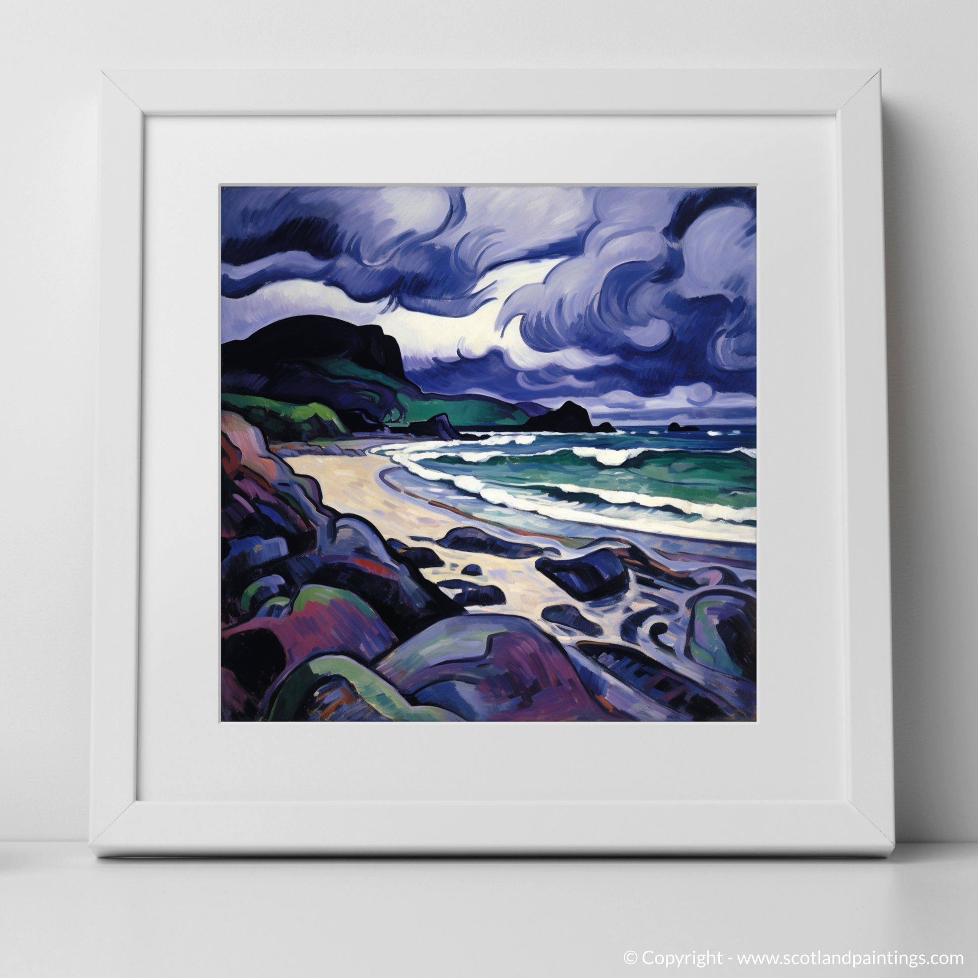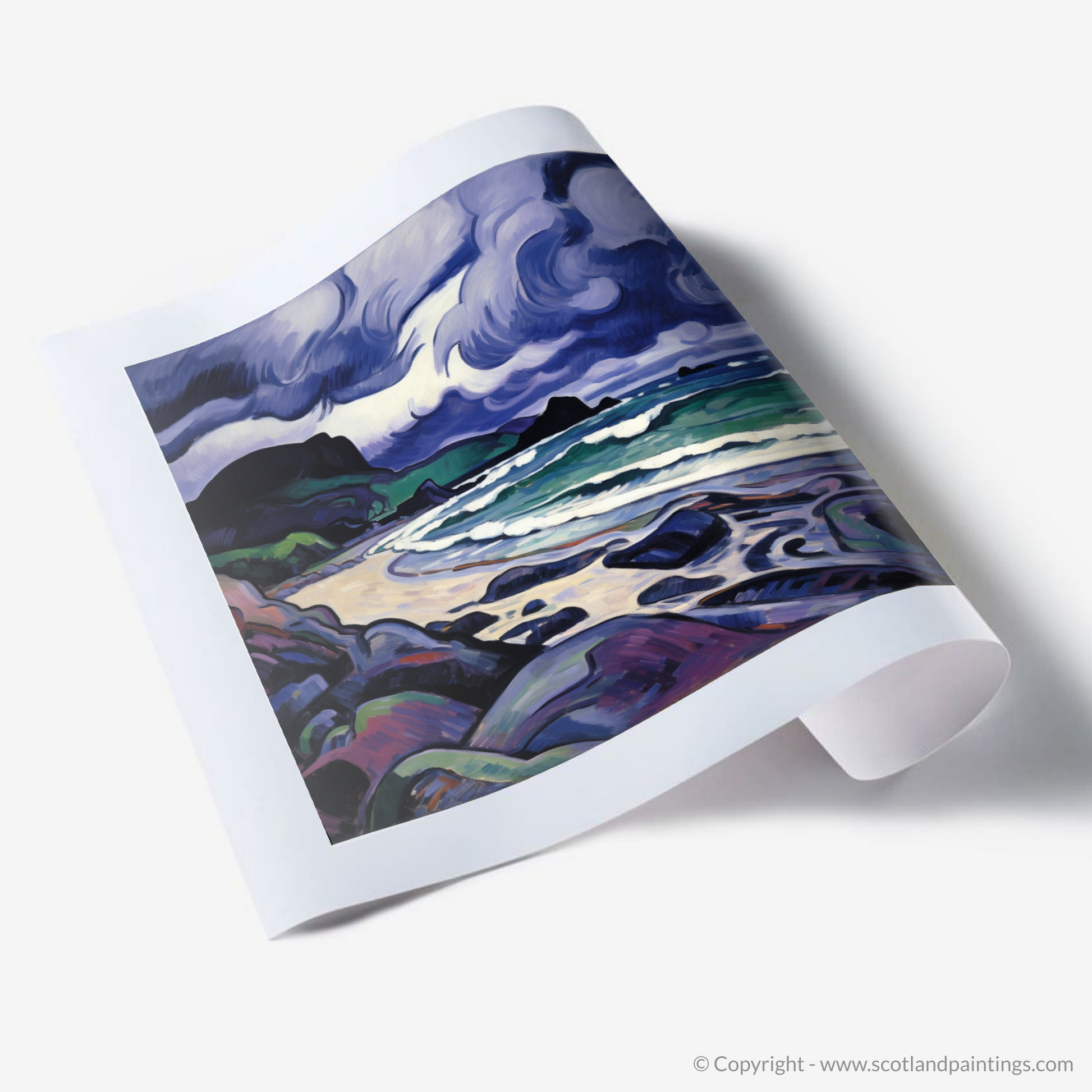 Embrace the electrifying essence of the Scottish coast with this dynamic print, enveloping the viewer in the raw energy of Kiloran Bay under a tempestuous sky. The artwork captures the scene with a Fauvist's unruly zest, vibrant colours clashing and complementing to evoke the drama of the landscape.