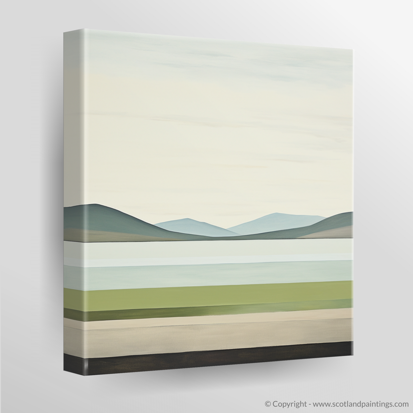 A symphony of muted hues, the piece features a harmonious composition of horizontal bands that echo the loch's horizon. The blend of soft greys, soothing whites, and subtle earth tones are interspersed with a verdant streak, reminiscent of the lush greenery that adorns the Highland landscape.