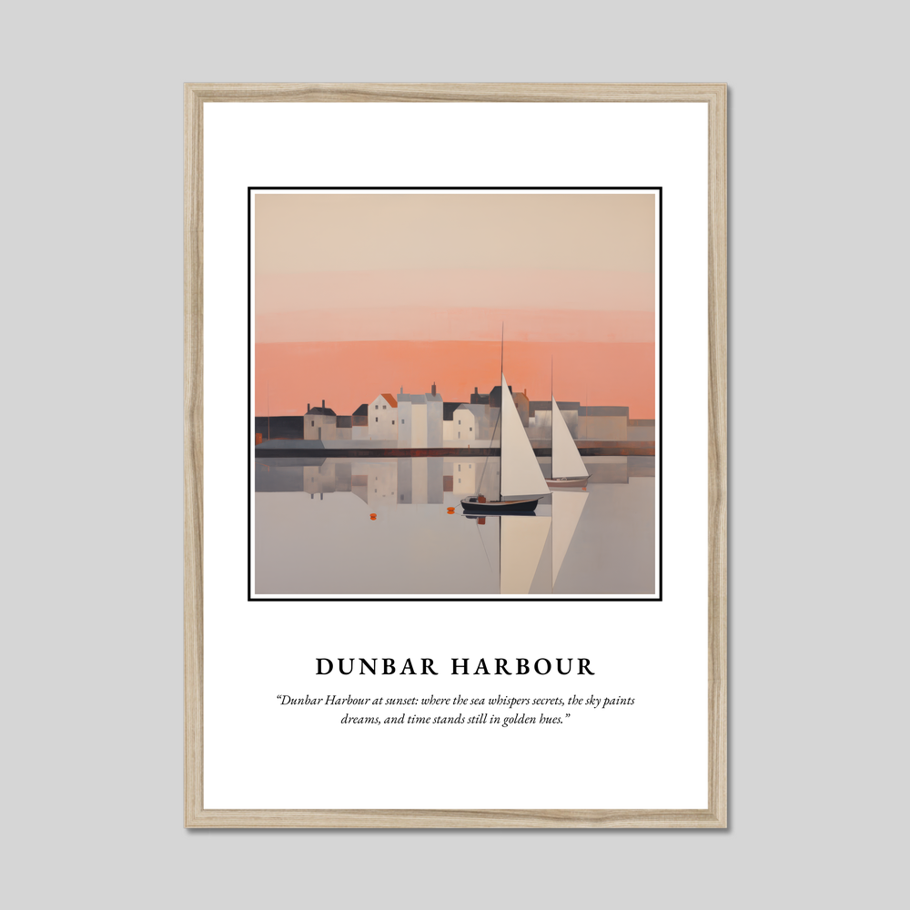 Below the artwork, the evocative quote, "Dunbar Harbour at sunset: where the sea whispers secrets, the sky paints dreams, and time stands still in golden hues," invites you to lose yourself in the moment. It's an ideal showpiece for anyone enchanted by coastal beauty or the abstract art movement.