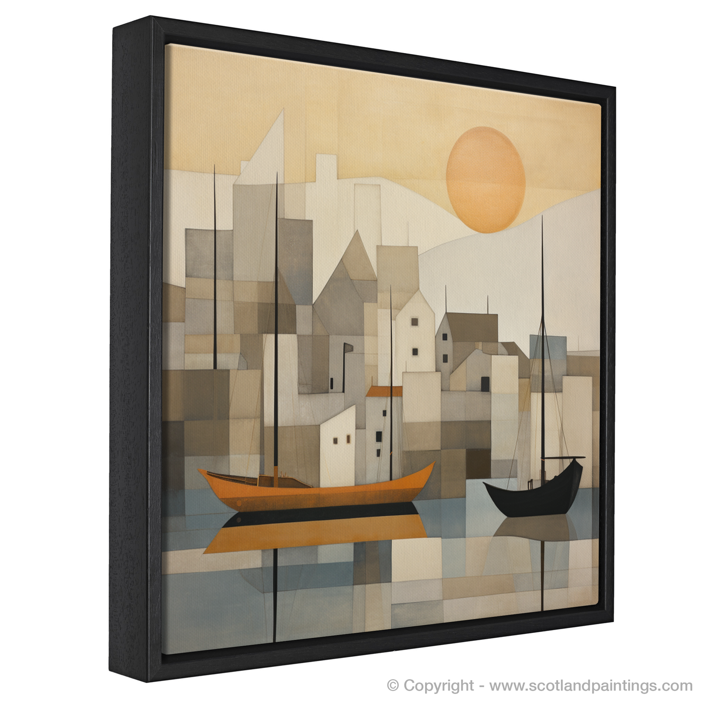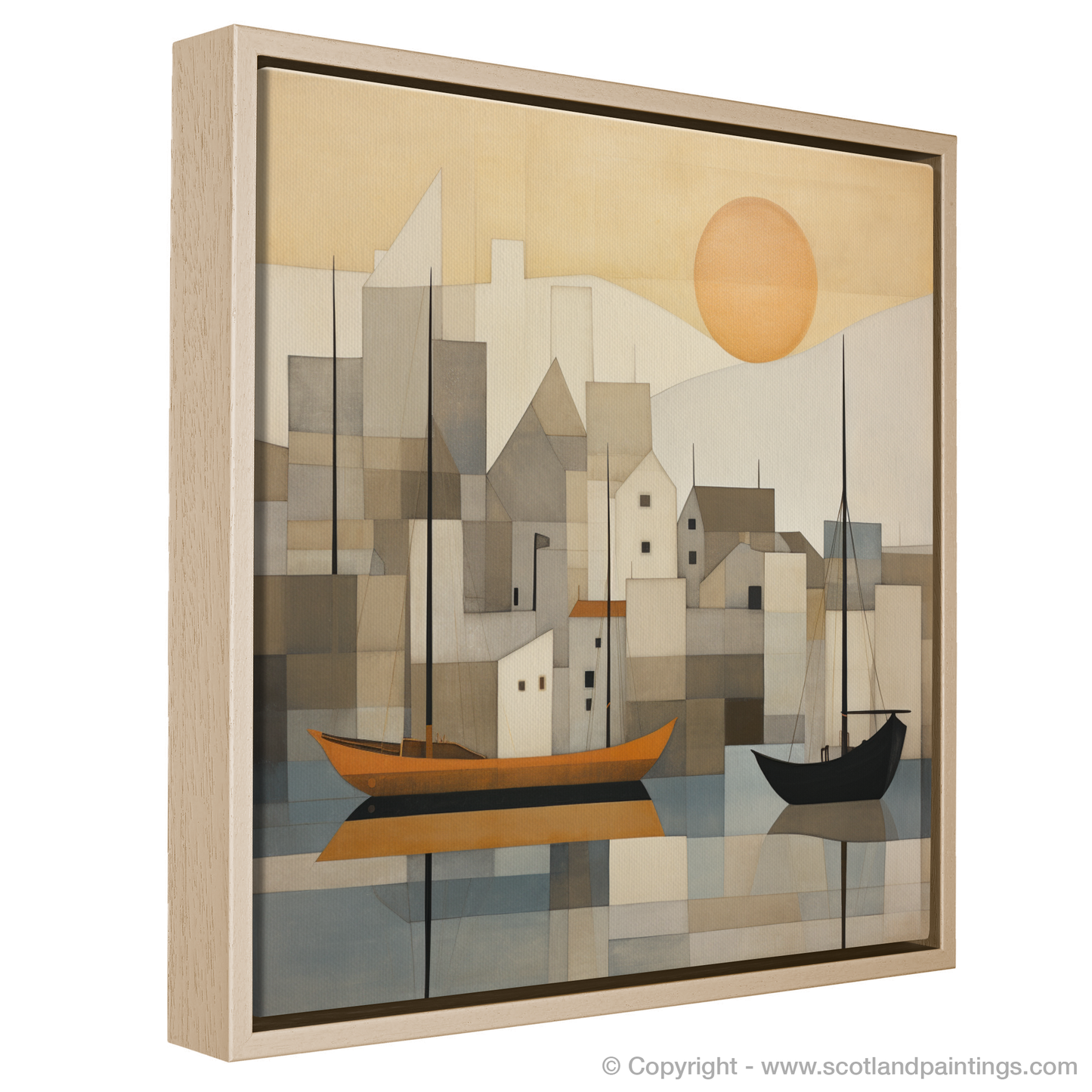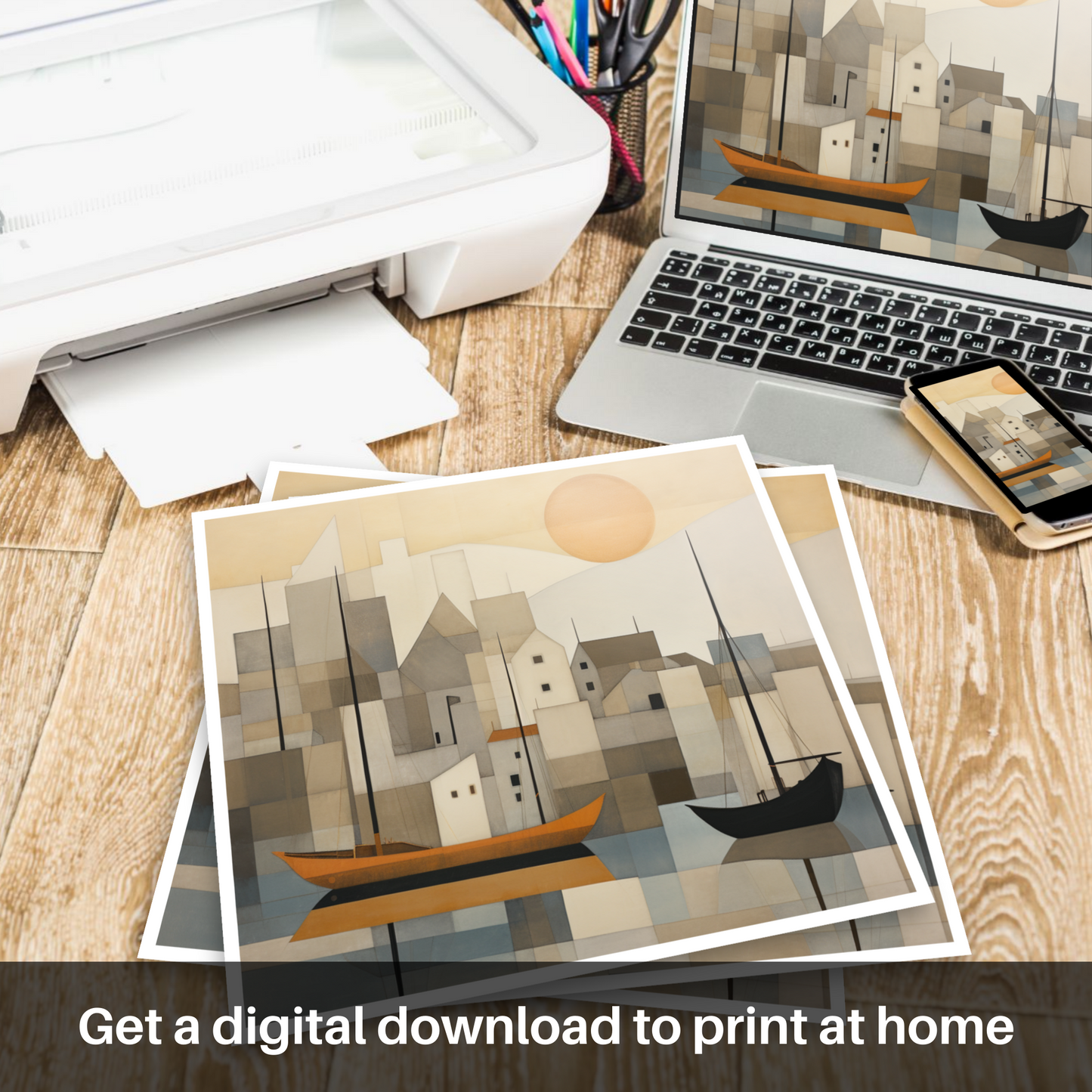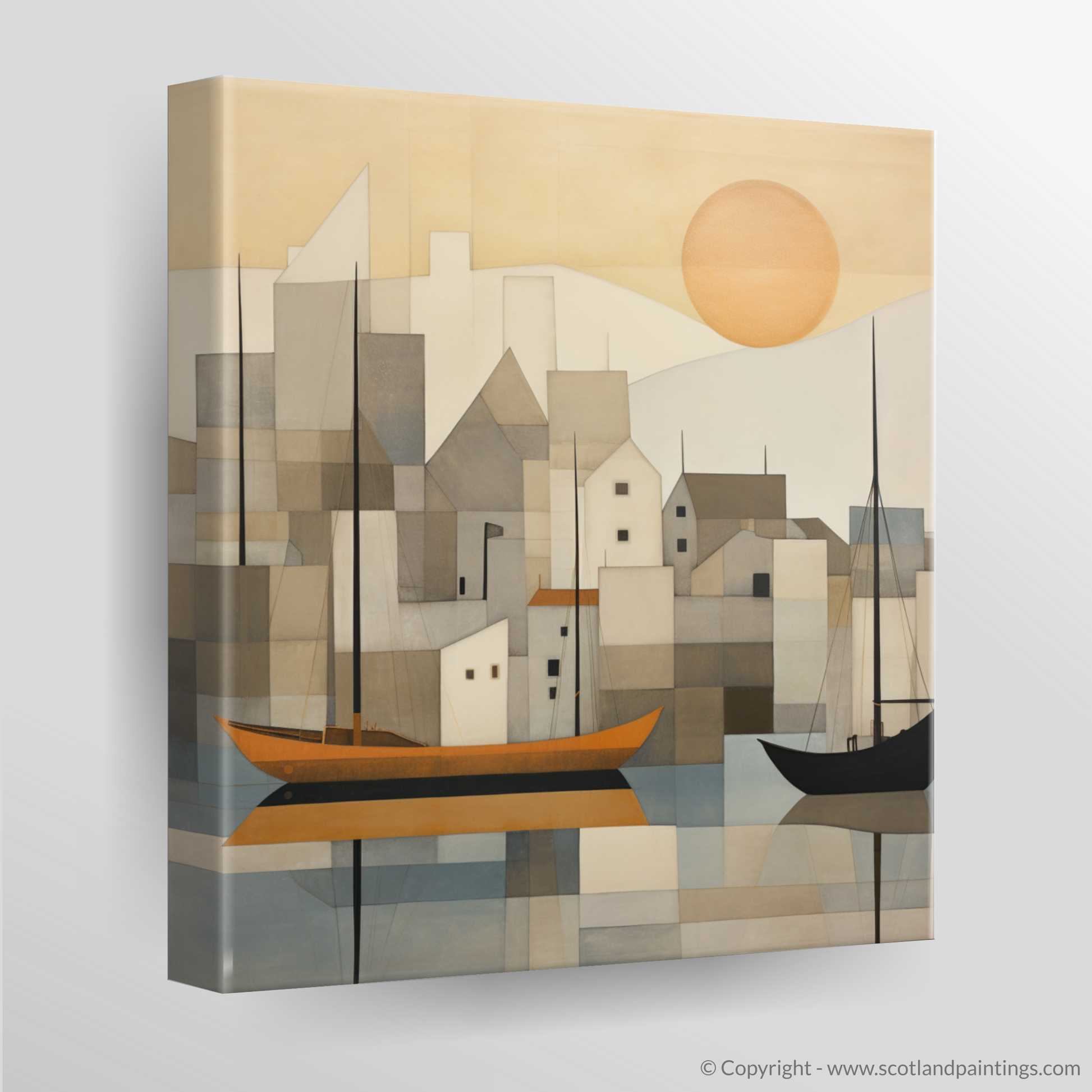 The harmonious blend of creams, beiges, and greys creates a soothing palette that represents the solid permanence of the harbour-side buildings. Meanwhile, dusky oranges and golden hues reflect the transient warmth of the setting sun. Bold blocks of colour define the silhouettes of vessels moored in the harbour, with an invigorating splash of burnt sienna and deep charcoal bringing life to the boats, which seem to wait in patient repose.