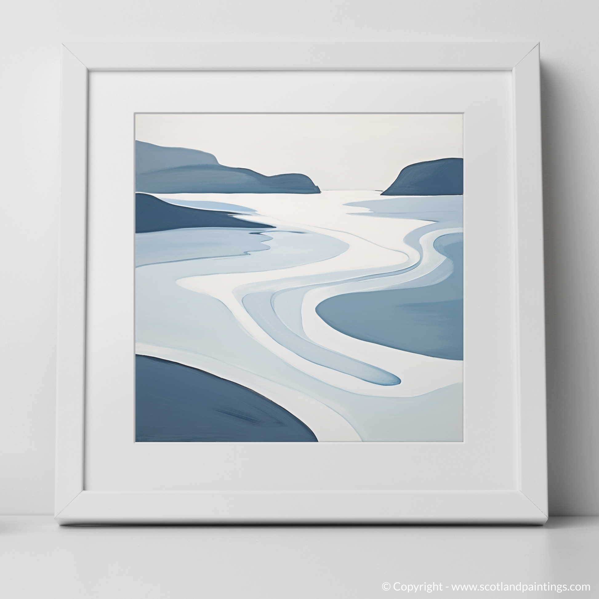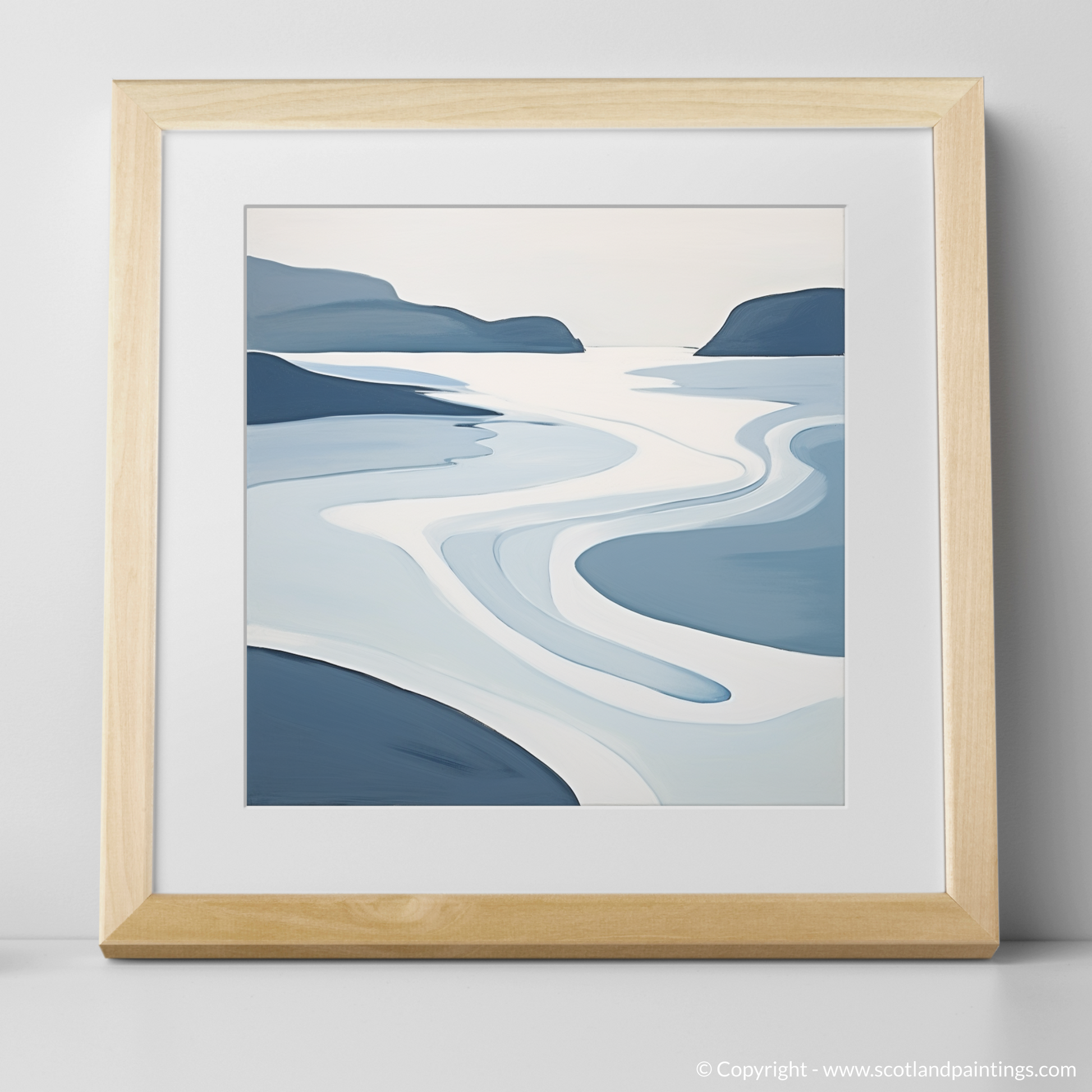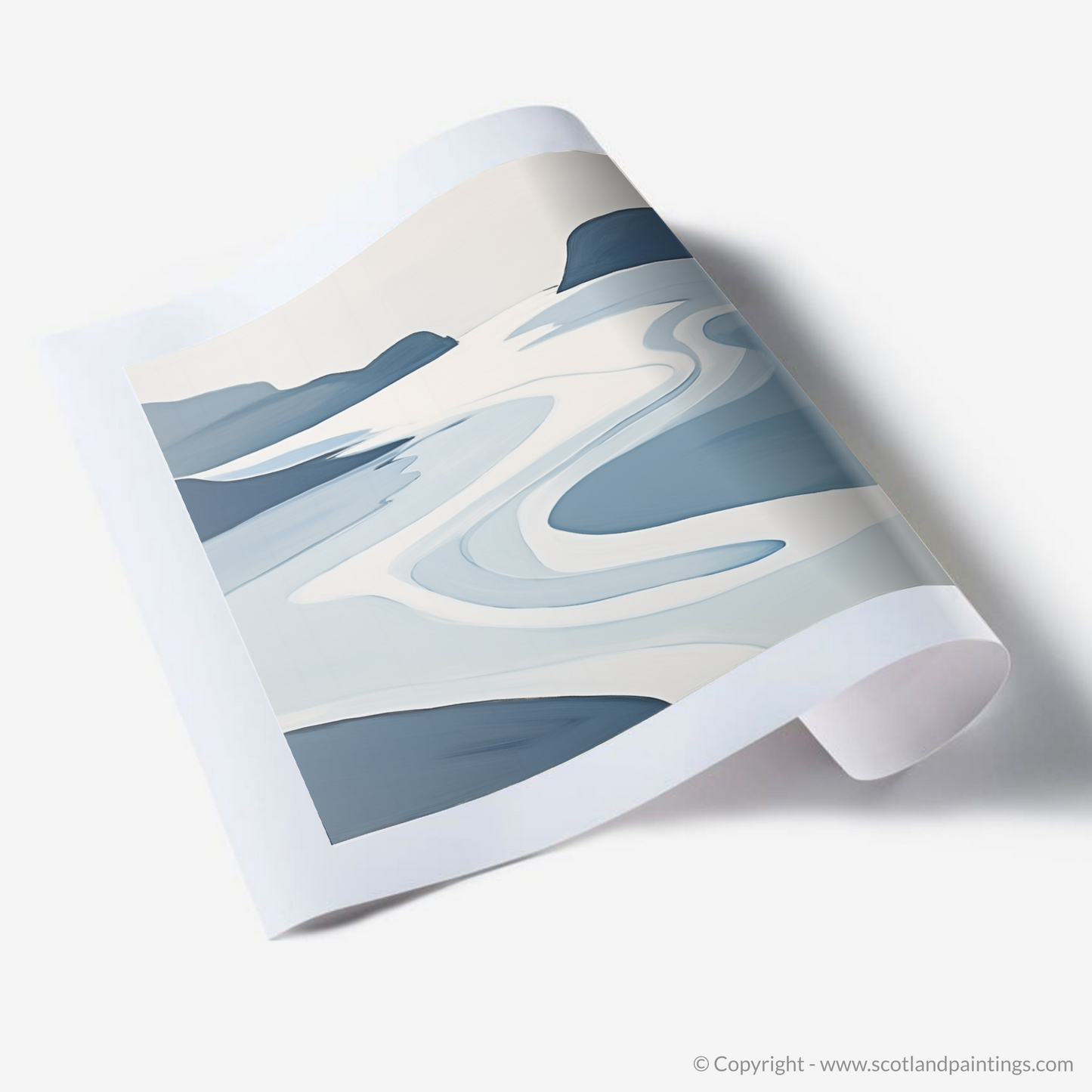 Imagine the serene tranquillity of Achmelvich Bay, rendered into a captivating abstraction, where the fluidity of water and the steadfastness of land dance in a symphony of shapes and tones. This exquisite print transforms the picturesque Scottish cove into a mesmerising interplay of gentle curves and bold silhouettes.