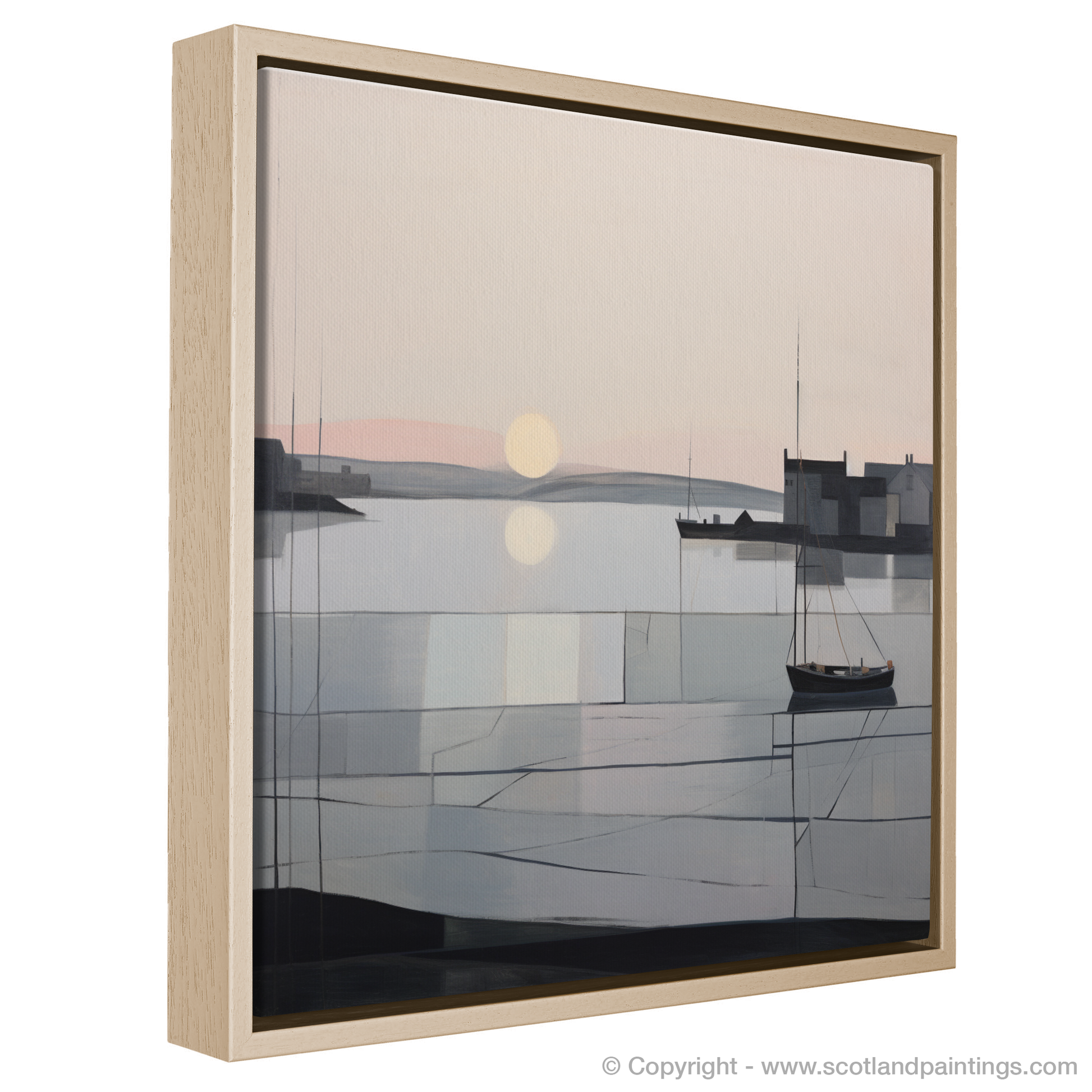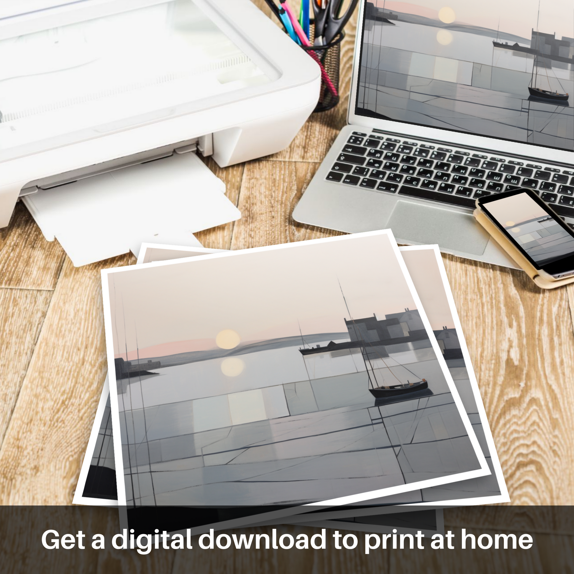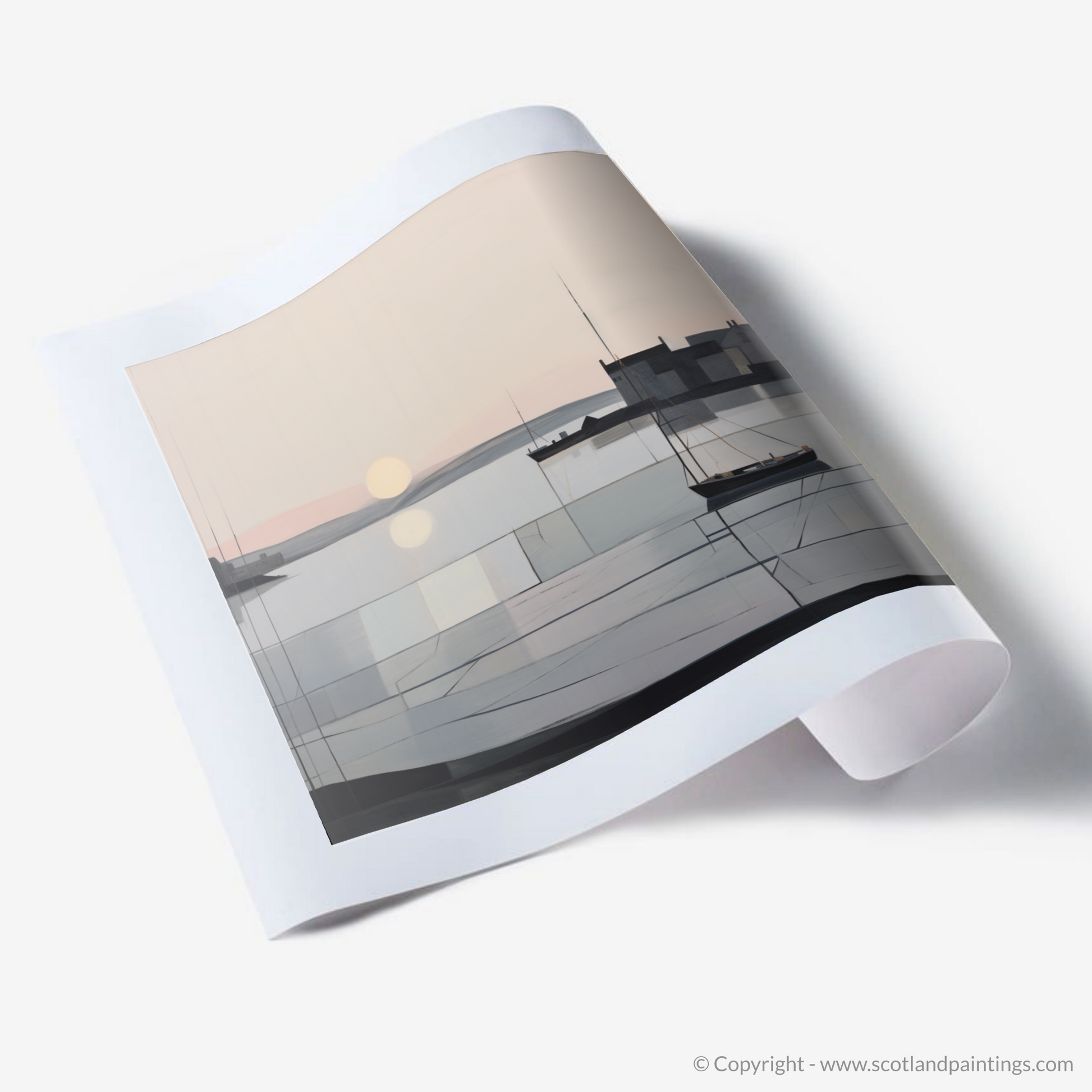 In this painterly abstraction, geometric shapes carve out the silhouettes of buildings and boats, their stark lines demarcating reflections and deftly distilling the essence of the Scottish shoreline. The luminous orb of the setting sun holds court in the composition, its reflection a pathway of shimmering light across the calm sea, inviting the eye to meander through the scene's placid beauty.
