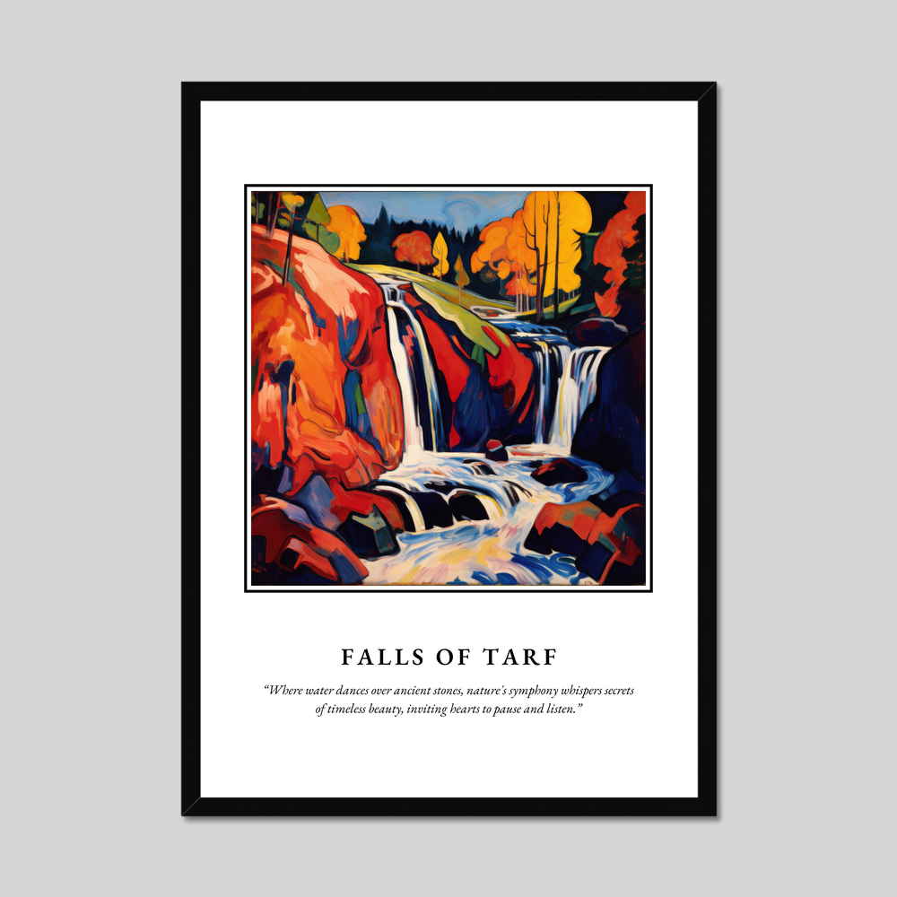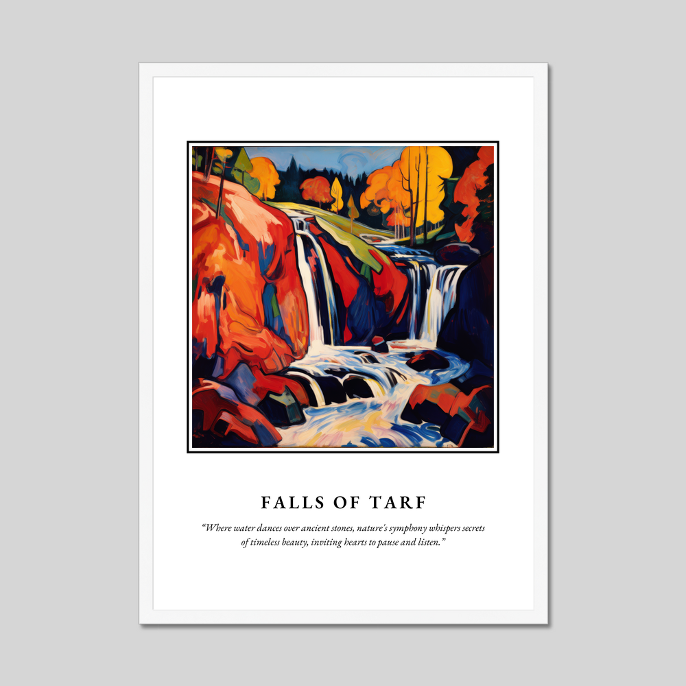 At the heart of this artwork is the spirited depiction of the Falls of Tarf, portrayed in the dynamic and bold Fauvism style. This style is known for its vivid colours and expressive brushwork, bringing to life the cascading waters as they dance over ancient stones. Above the painting, the word “SCOTLAND” is emblazoned in bold lettering, firmly rooting this vivid scene in its majestic home. Below, a poetic quote adds depth: “Where water dances over ancient stones, nature's symphony whispers secrets of timeless beauty, inviting hearts to pause and listen.”