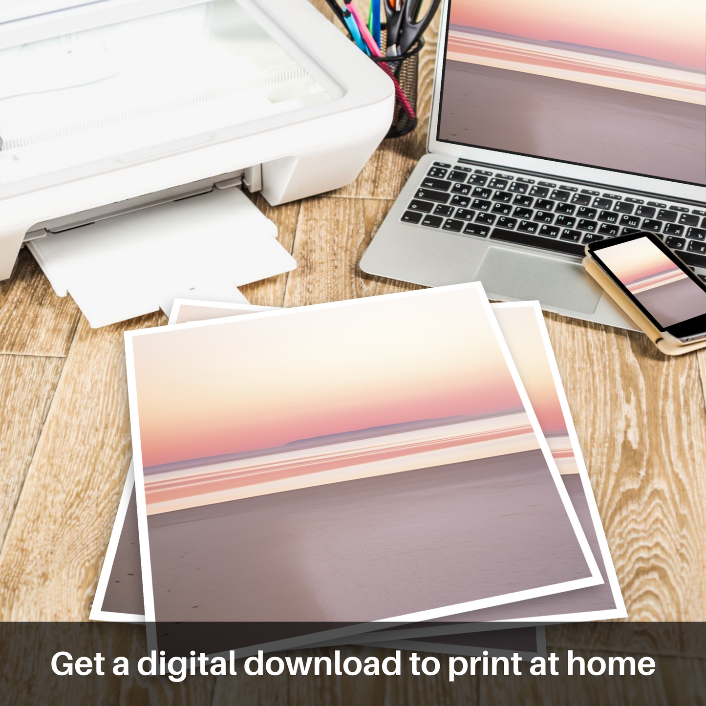 Awash with the soft glow of the setting sun, horizontal bands of colour transform the seascape into a minimalist tapestry. The upper portion of the print basks in a gentle gradient of peach and lilac, evoking the ephemeral beauty of the twilight sky. This delicate play of colours is mirrored by the tranquil waters, rendered in a series of serene, ethereal stripes that suggest a calm and reflective sea surface.