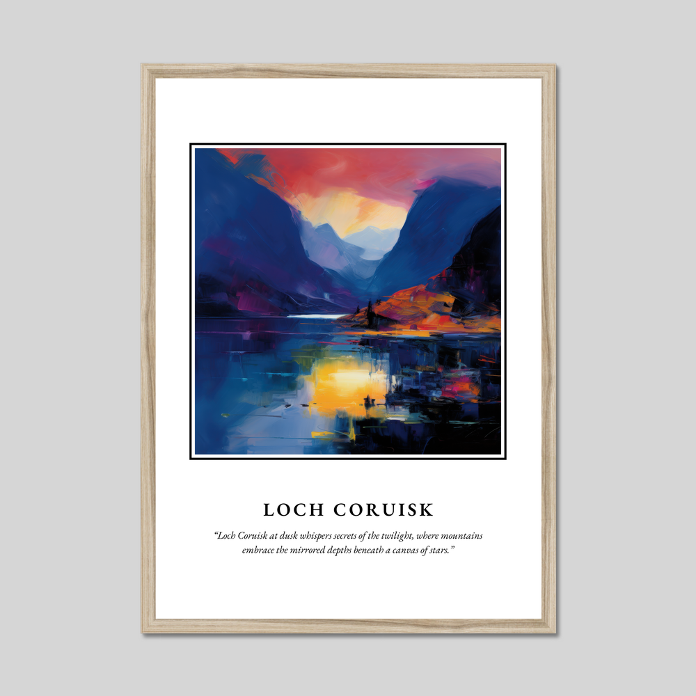 The poster features the majestic word “SCOTLAND” emblazoned across the top in bold lettering, inviting an immediate sense of national pride and drama. Below, the true masterpiece unfolds—a captivating painting of Loch Coruisk depicted in the vibrant strokes of Abstract Expressionism. This style beautifully captures the emotional depth and spirit of the loch, as colours dance across the canvas like whispers of nature itself. The serene water mirrors the towering silhouette of the mountains, bathed in hues of fiery orange, deep blue, and violet, perfectly encapsulating the loch at dusk. Accompanying this vision is the evocative quote, “Loch Coruisk at dusk whispers secrets of the twilight, where mountains embrace the mirrored depths beneath a canvas of stars.”