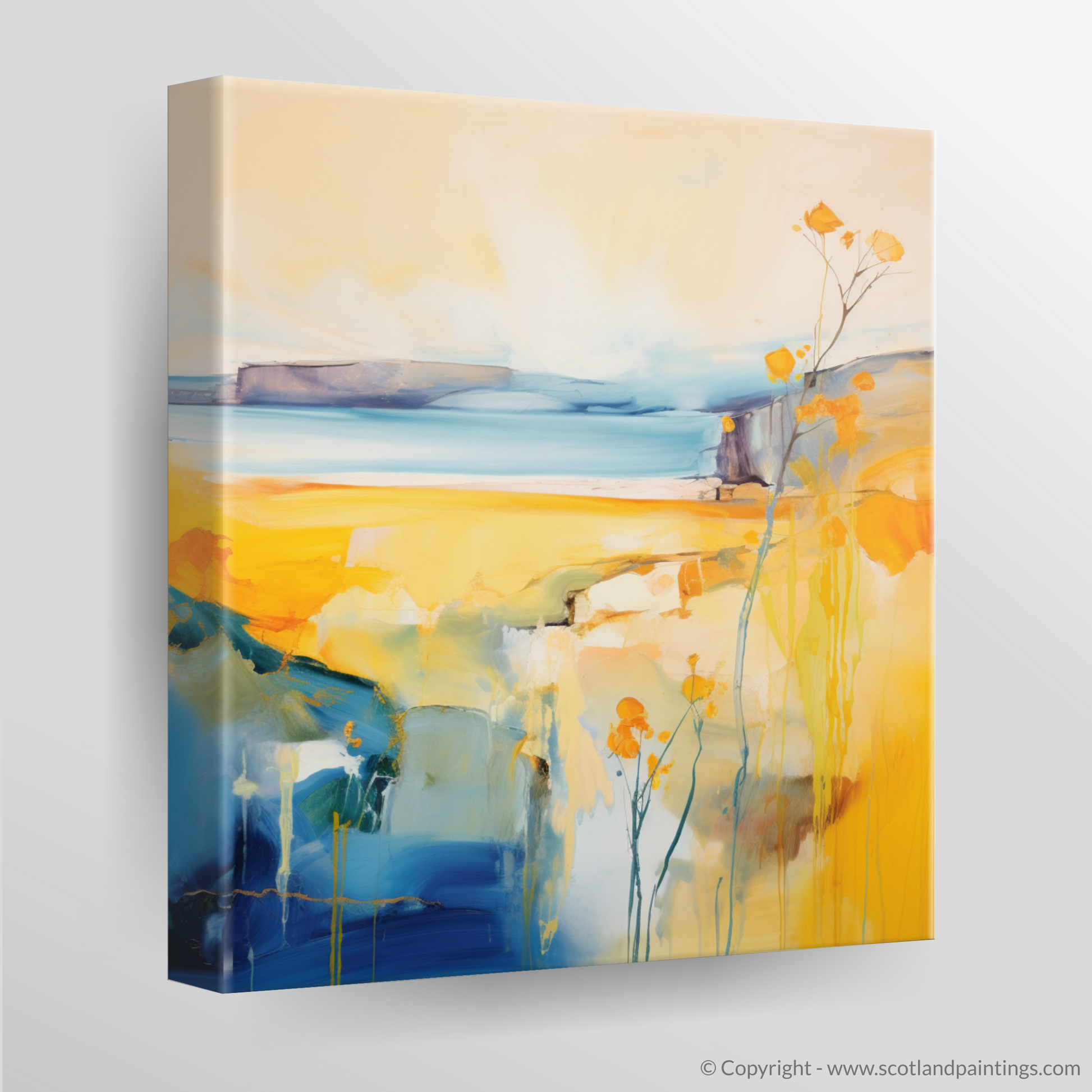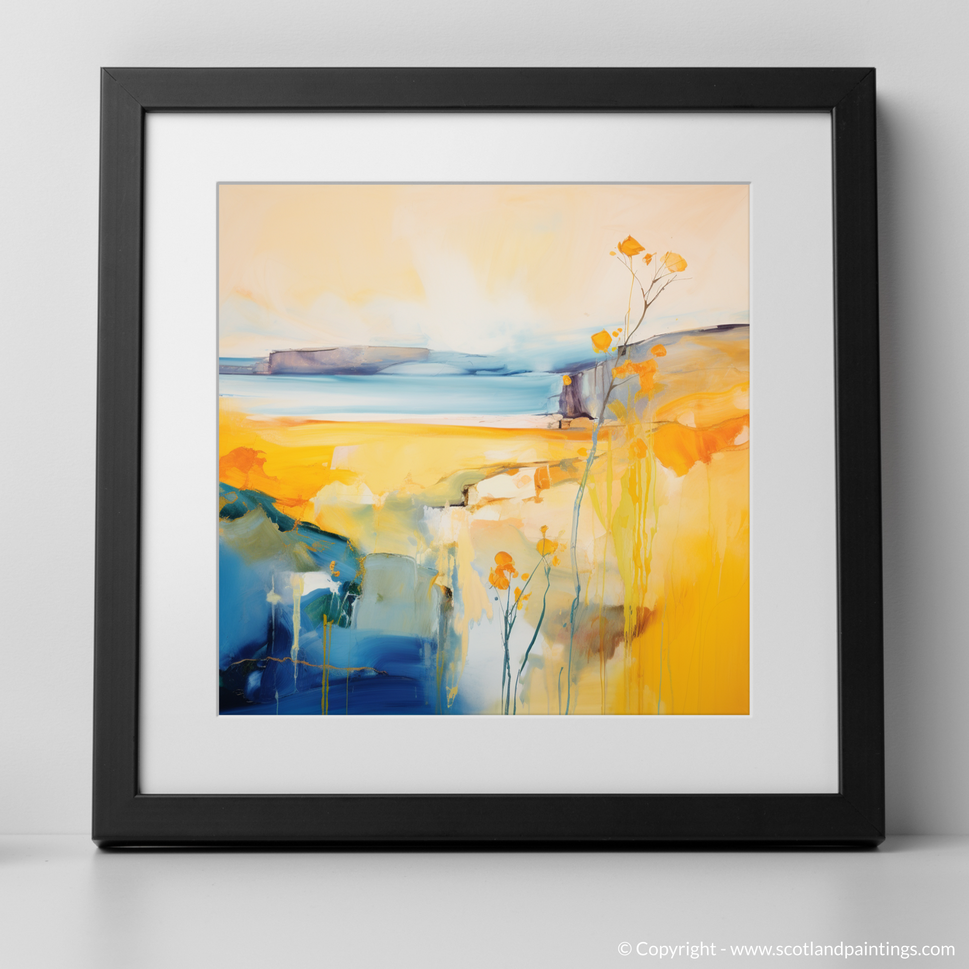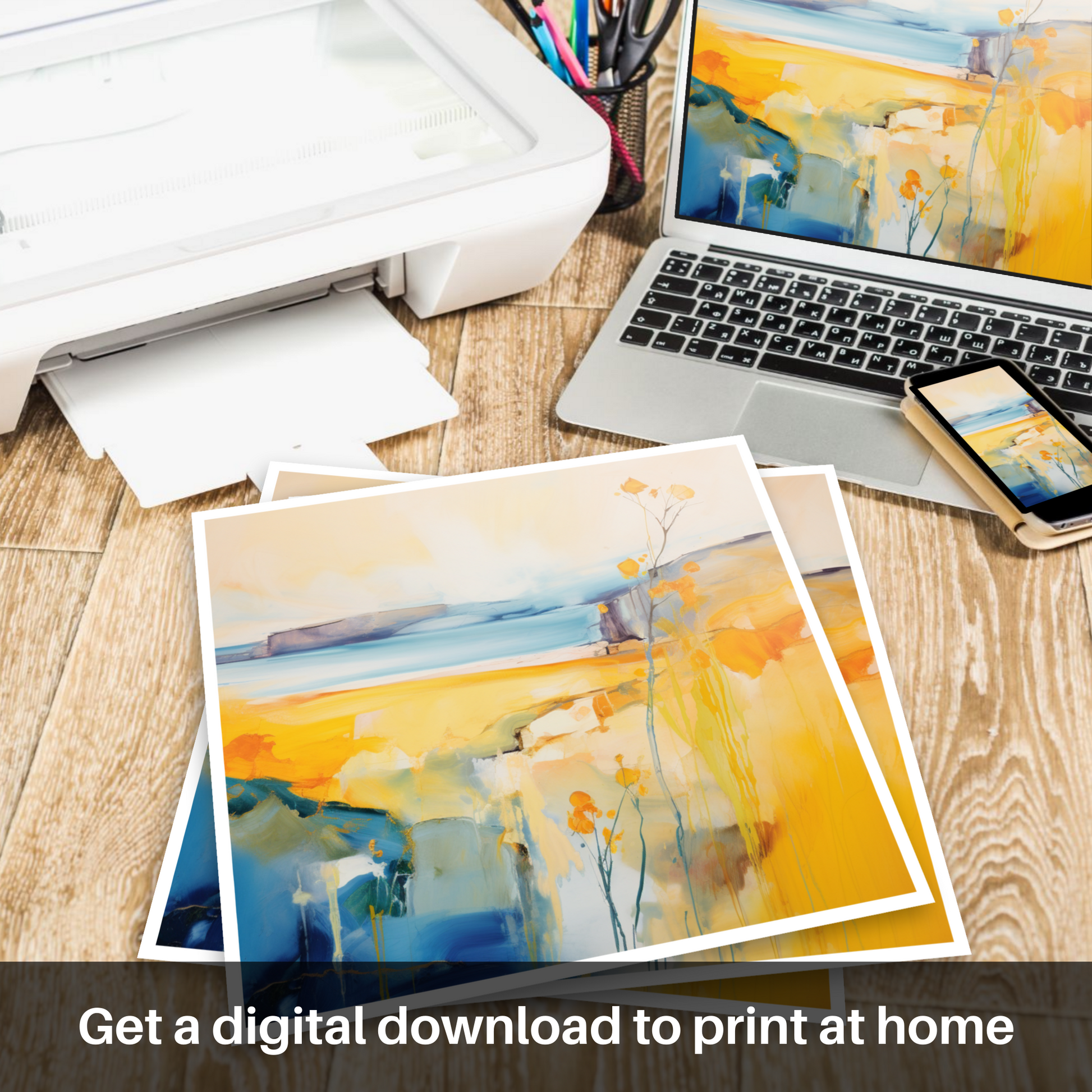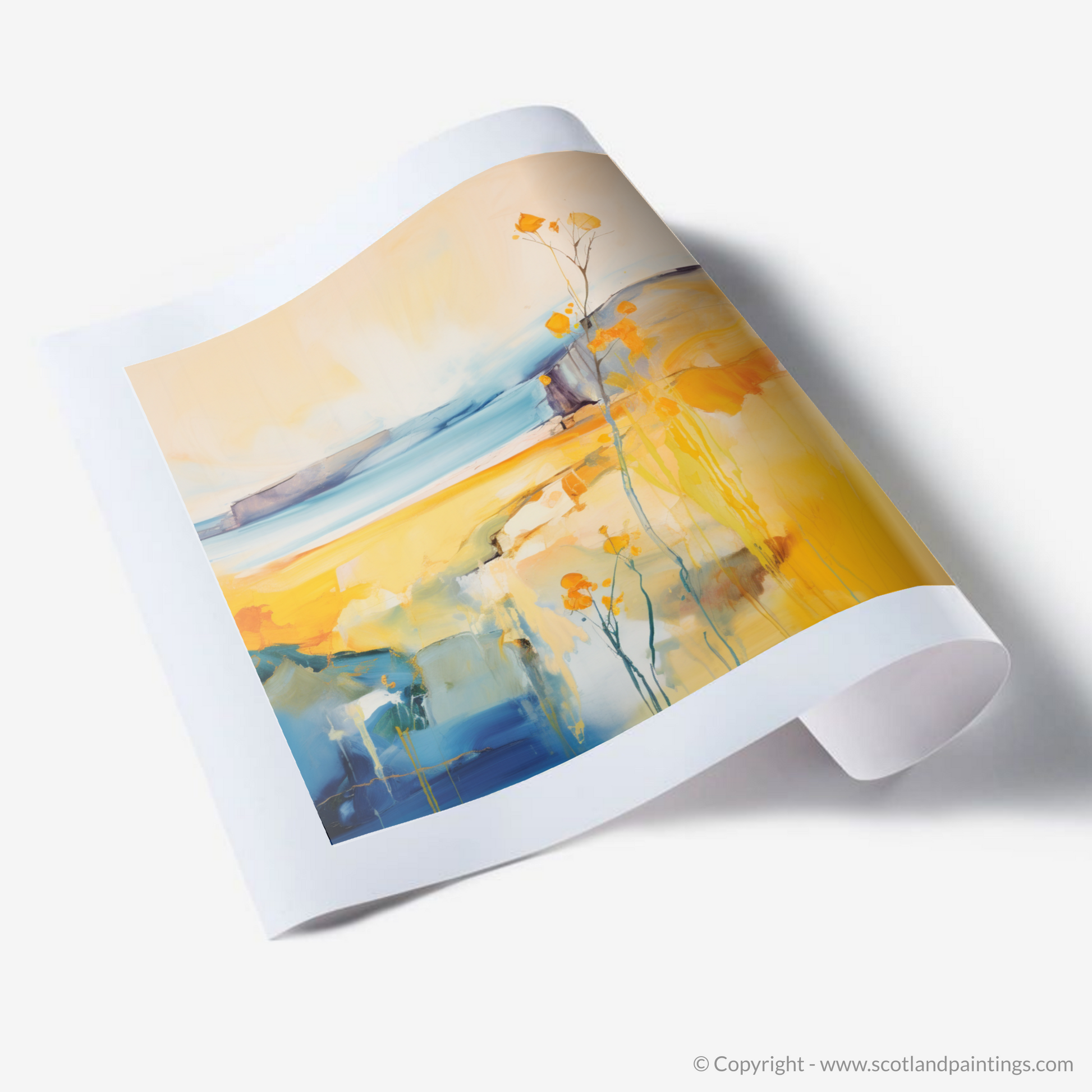 Immerse yourself in the vibrant essence of coastal flora with this enthralling abstract interpretation of Golden samphire gracing the cliffs of Berwick-upon-Tweed. Swathes of burnt orange and sun-kissed yellows blend harmoniously, conjuring up images of the golden blooms basking in the radiant Scottish sun. The scene is set against a backdrop of soft, serene blues and gentle cream hues suggestive of clear skies and distant, tranquil waters.