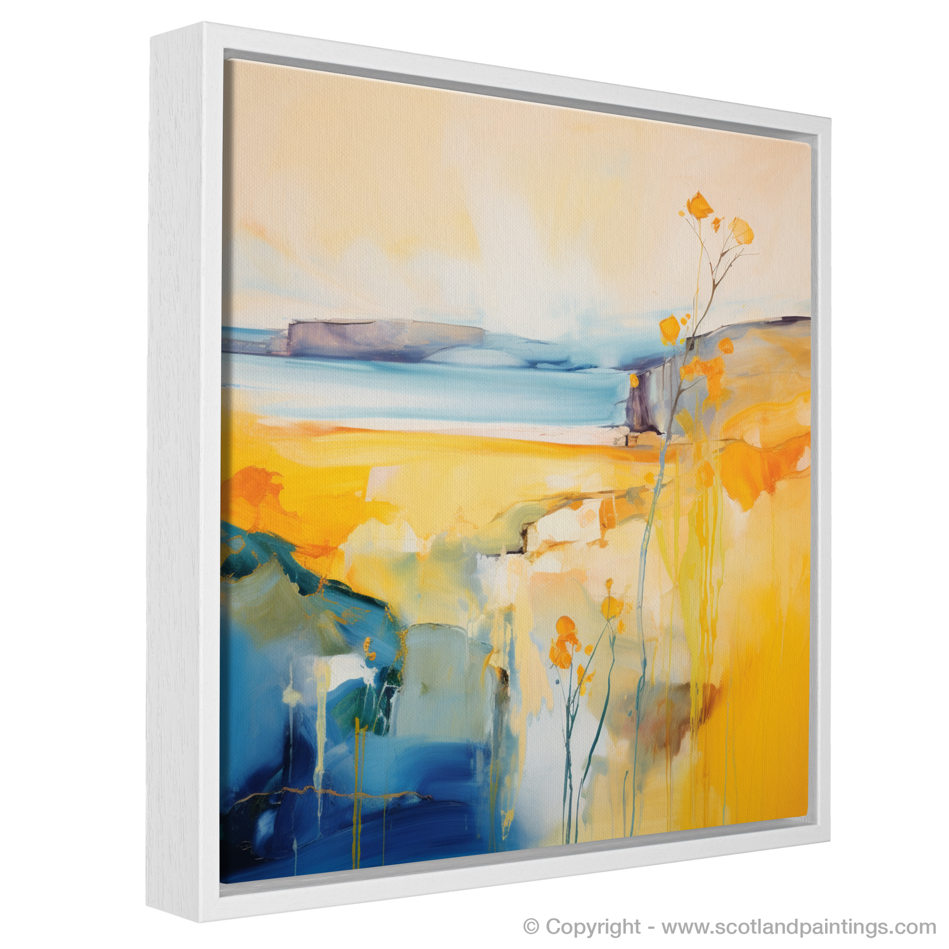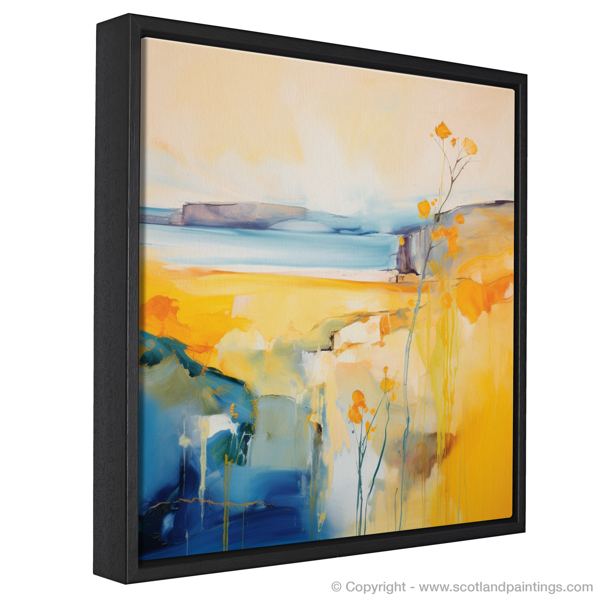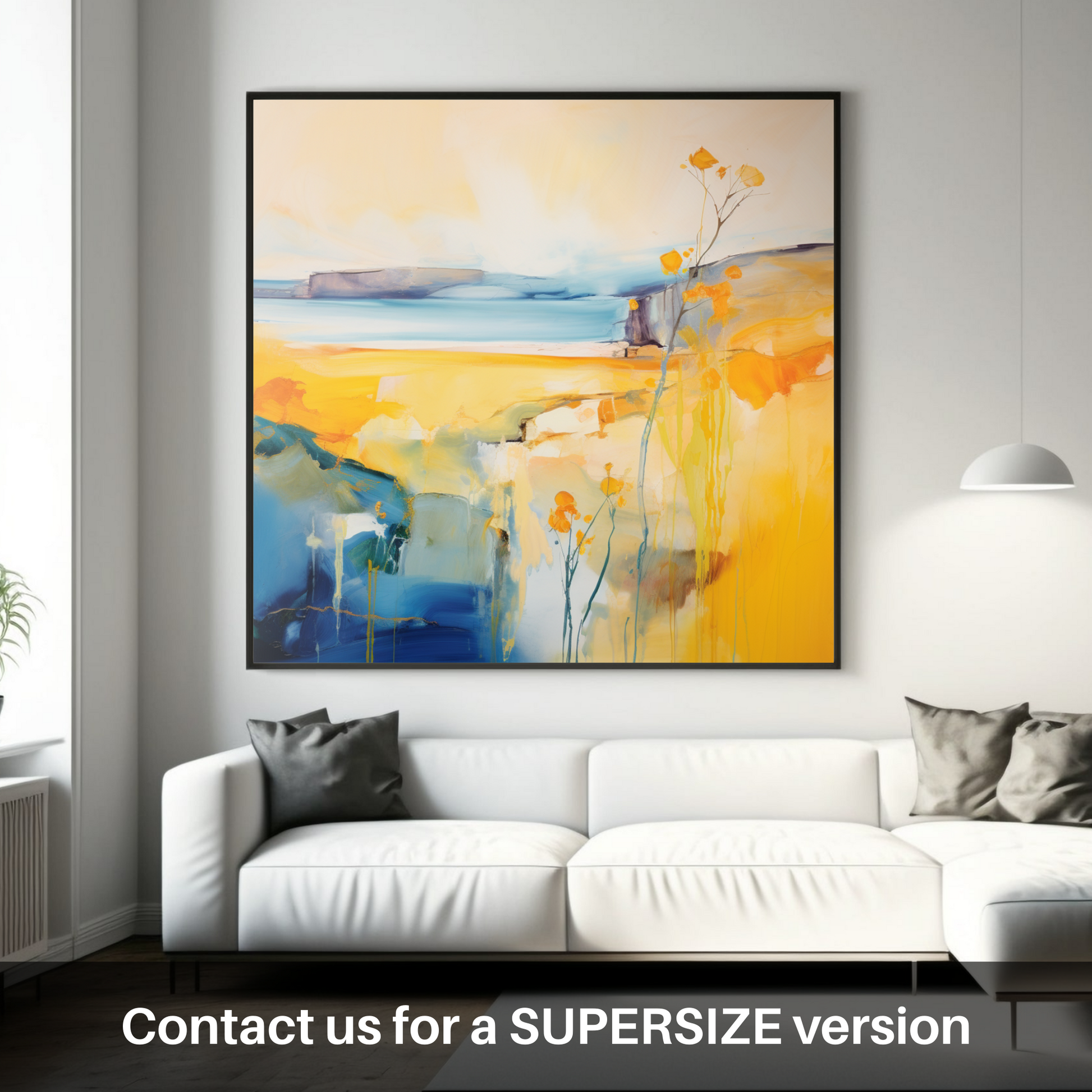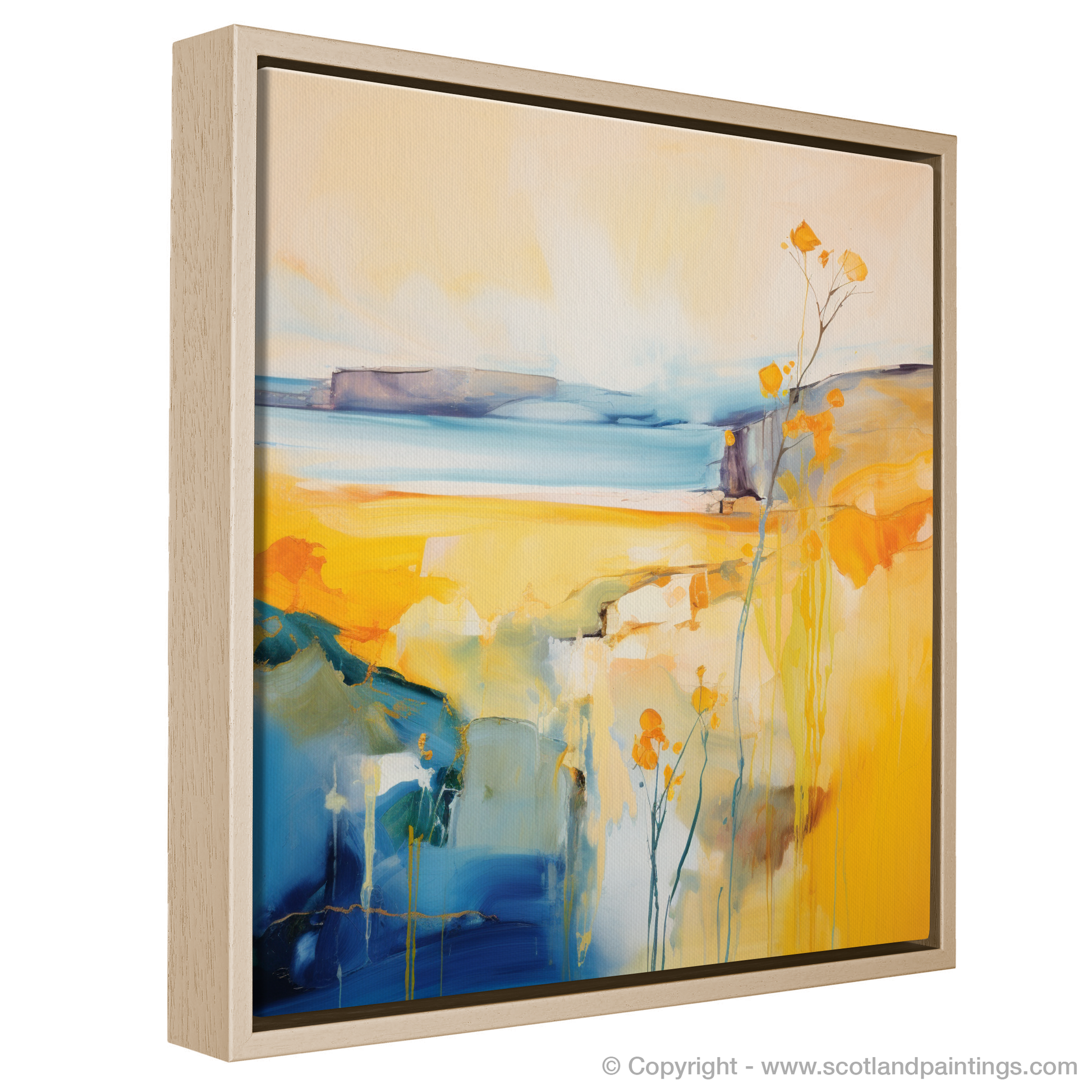 Immerse yourself in the vibrant essence of coastal flora with this enthralling abstract interpretation of Golden samphire gracing the cliffs of Berwick-upon-Tweed. Swathes of burnt orange and sun-kissed yellows blend harmoniously, conjuring up images of the golden blooms basking in the radiant Scottish sun. The scene is set against a backdrop of soft, serene blues and gentle cream hues suggestive of clear skies and distant, tranquil waters.