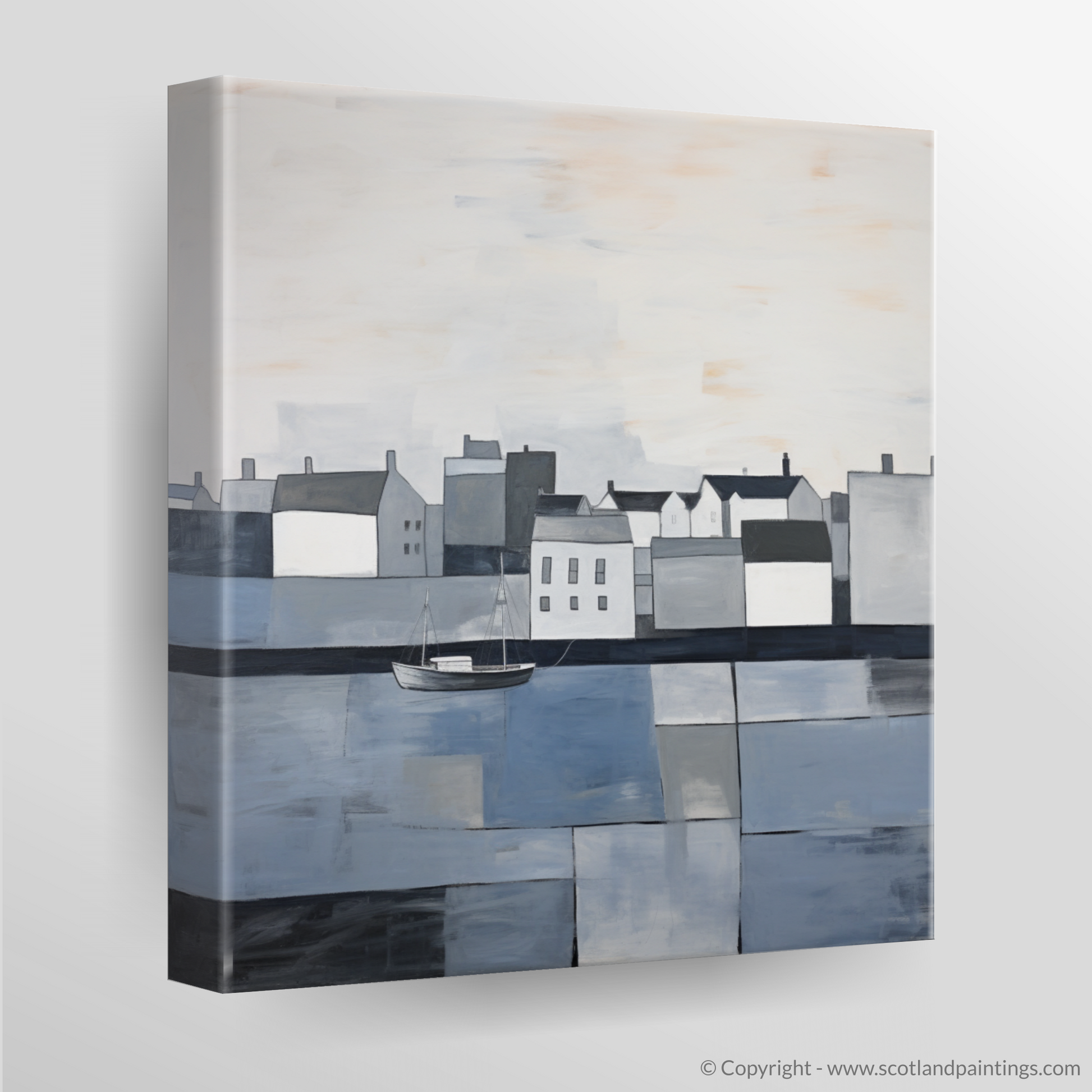 With its cool palette dominated by shades of slate blue and muted whites, the composition offers a contemporary take on Scotland's rugged coastal beauty. This evocative image promises to become an intriguing focal point in your curated art collection, igniting conversations and bringing the dramatic allure of Scottish harbours into your personal or work space.