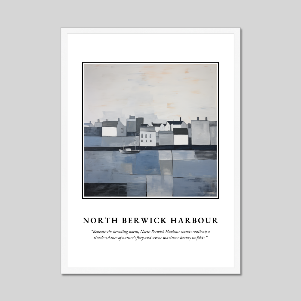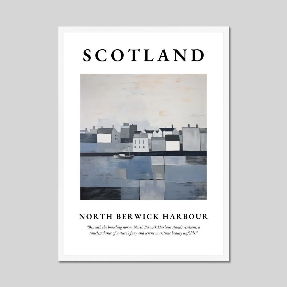 At the top, the word "SCOTLAND" draws you into the scene, setting the stage for an abstract masterpiece below. The painting captures the essence of North Berwick Harbour with soft, muted tones and geometric simplicity. Here, the balance of nature’s power and the harbour’s serene beauty is captured—an impressionistic dance of form and colour that invites contemplation. Beneath the artwork, the poignant quote, “Beneath the brooding storm, North Berwick Harbour stands resilient; a timeless dance of nature's fury and serene maritime beauty unfolds,” enriches the visual experience, echoing the harbour’s timeless spirit.