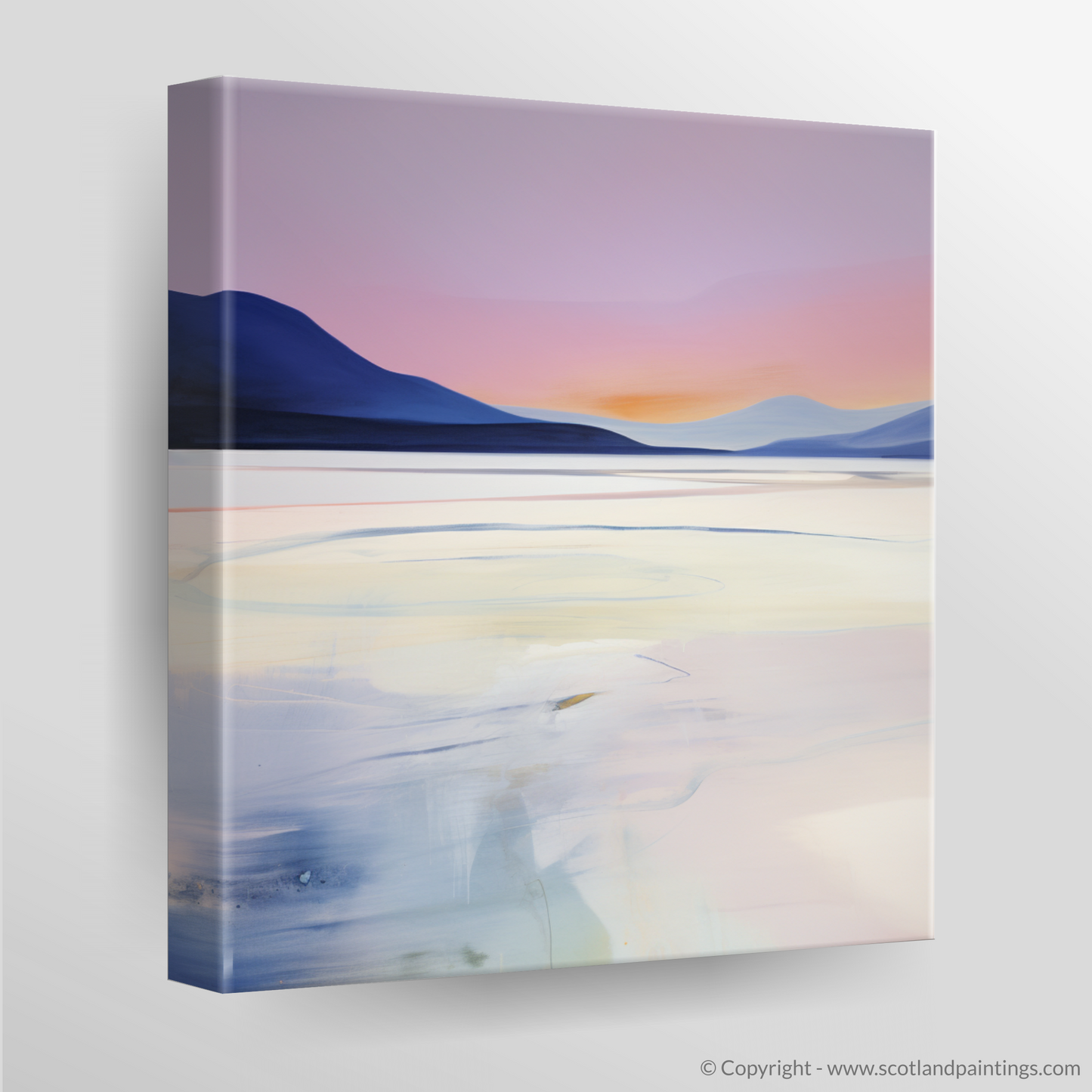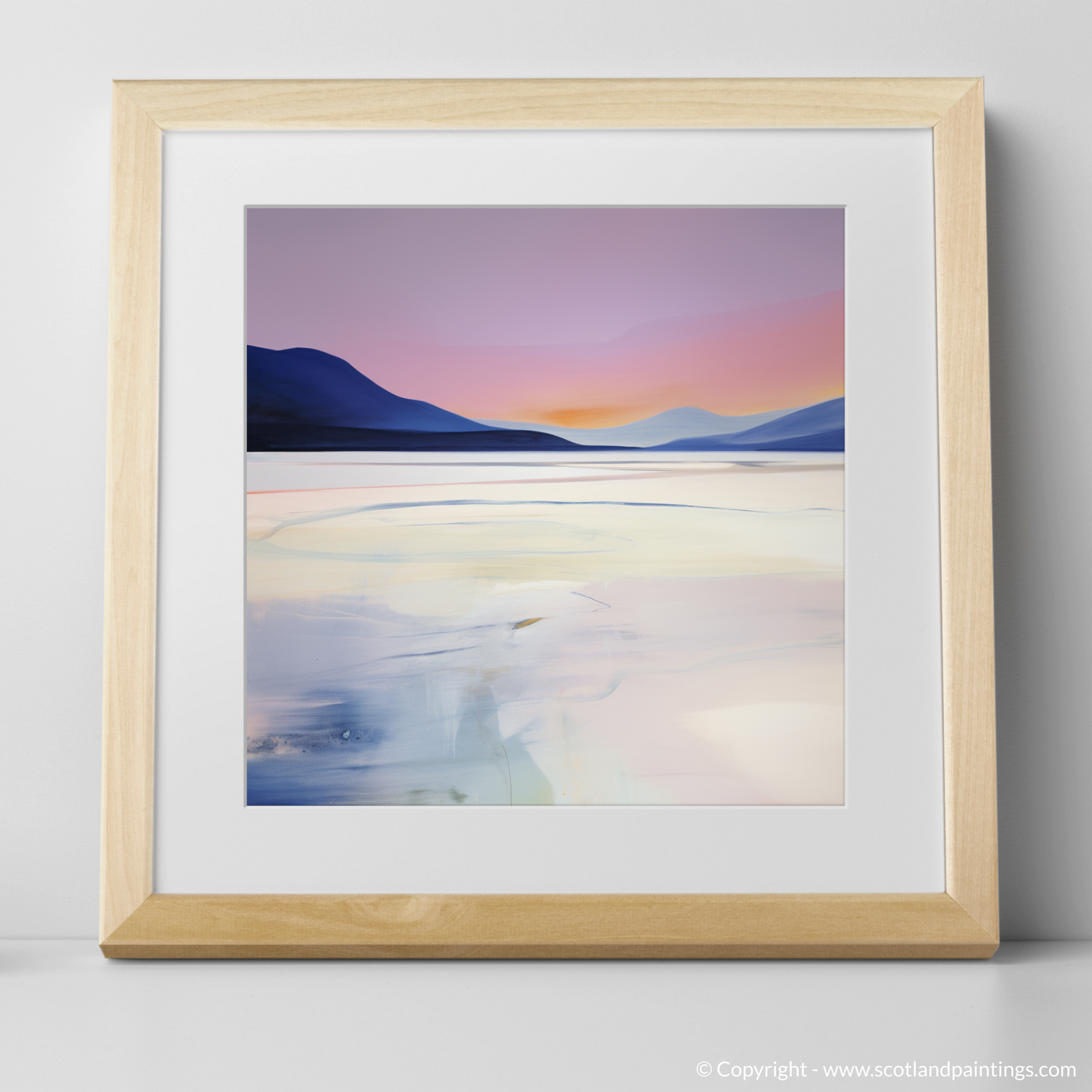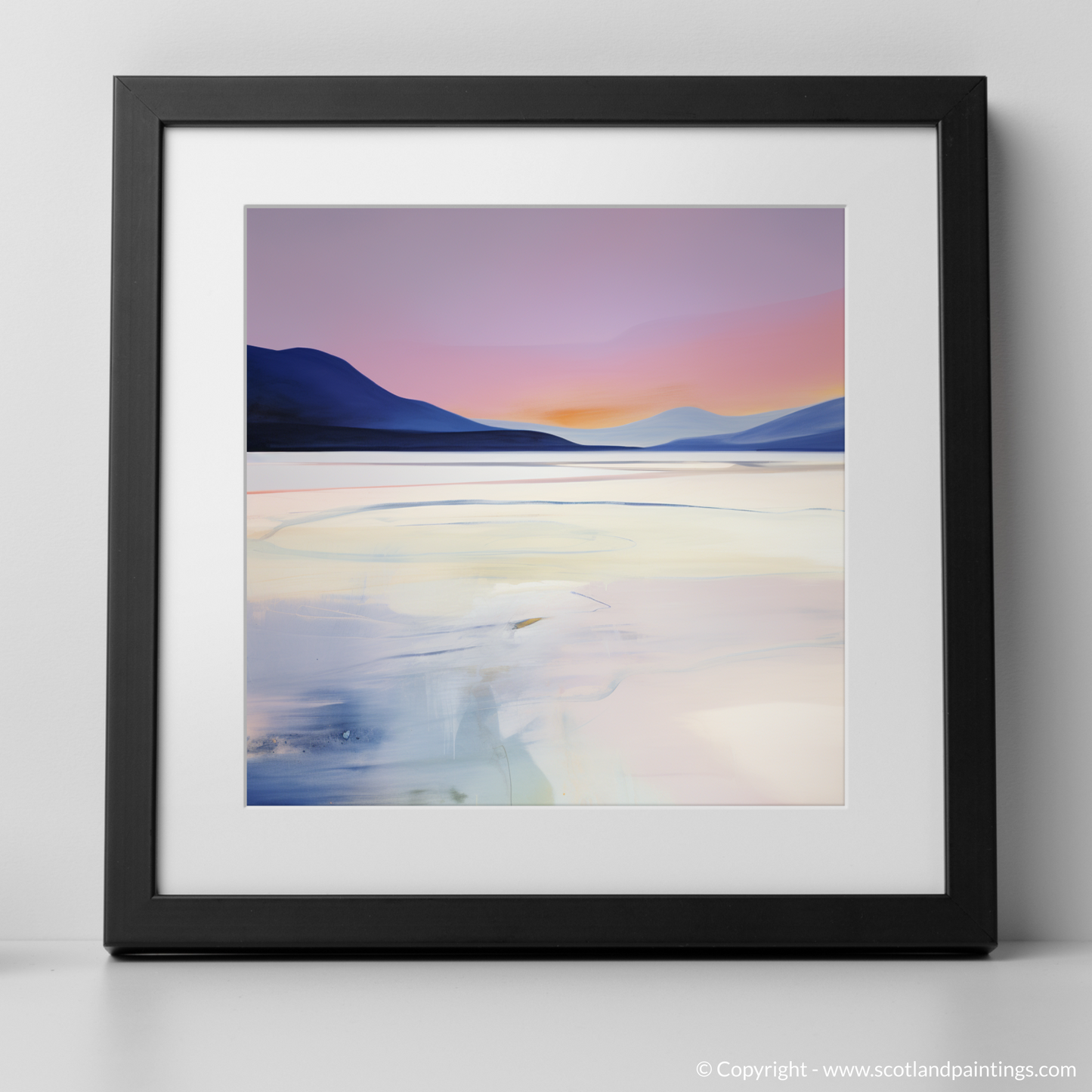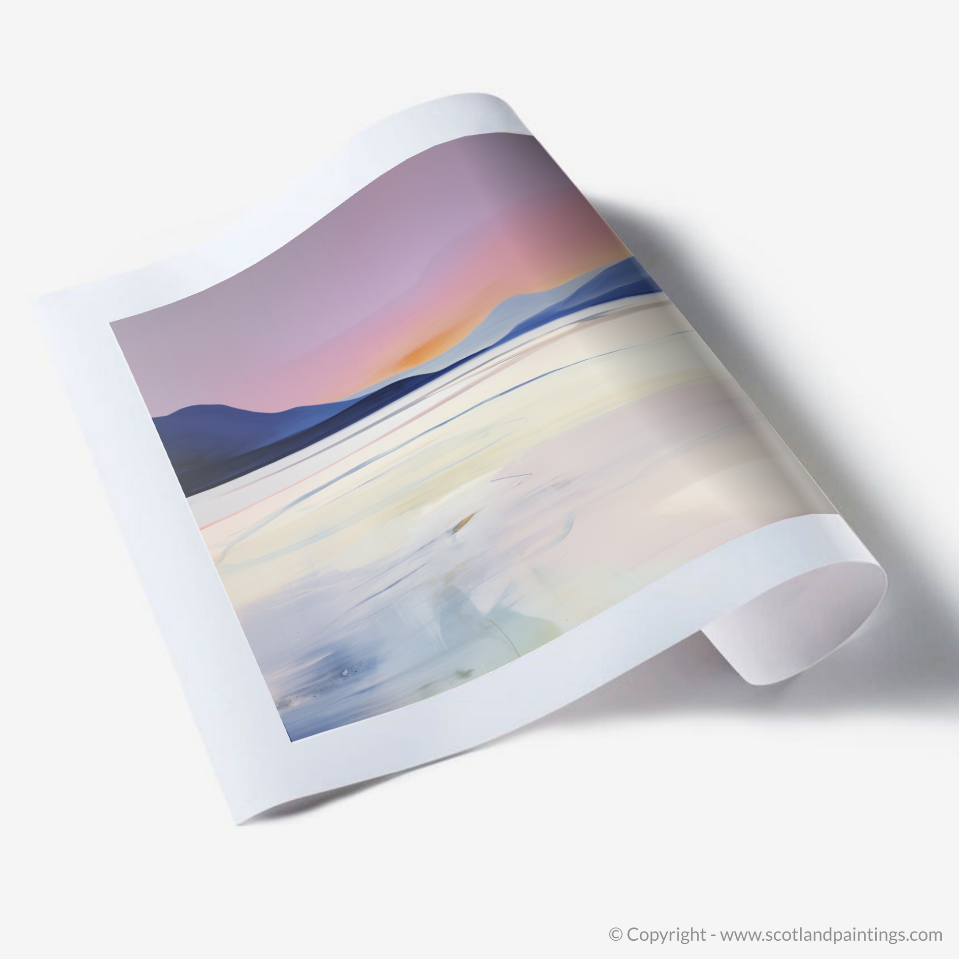 Awash with the serene hues of twilight, this evocative print captures the ethereal beauty of Luskentyre Beach at the moment when day yields to night. The sweeping brushstrokes enliven the abstract interpretation, artfully intertwining ribbons of delicate pinks, warm corals, and soothing lavenders. These colours blend seamlessly into the darker tones that lay at the base of the silhouette of the distant hills, suggesting the fading light as dusk envelops the Scottish landscape.