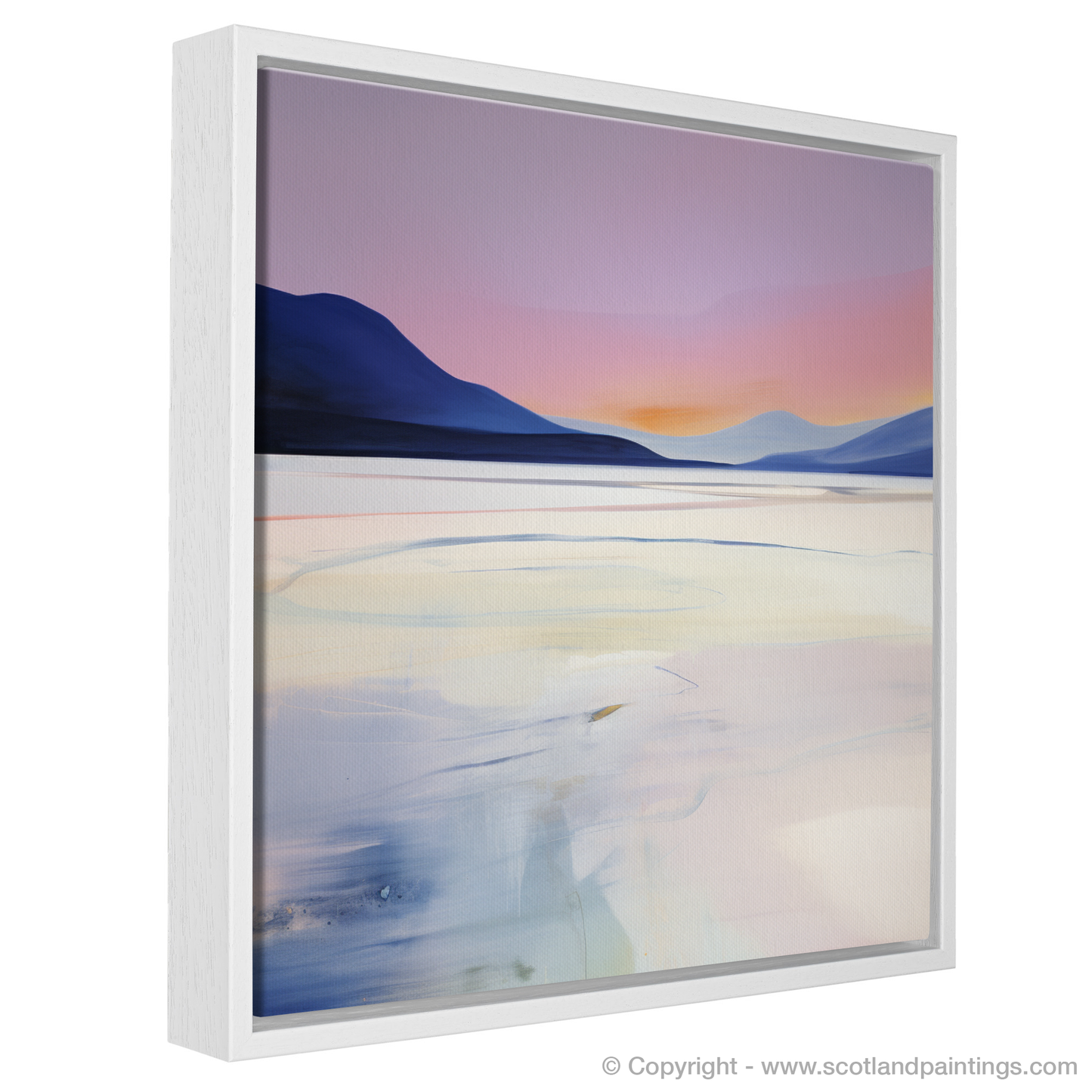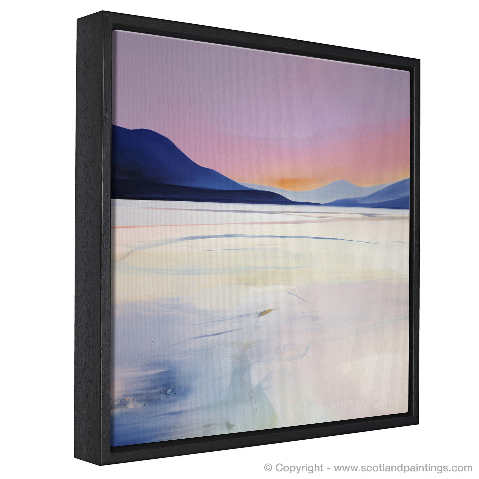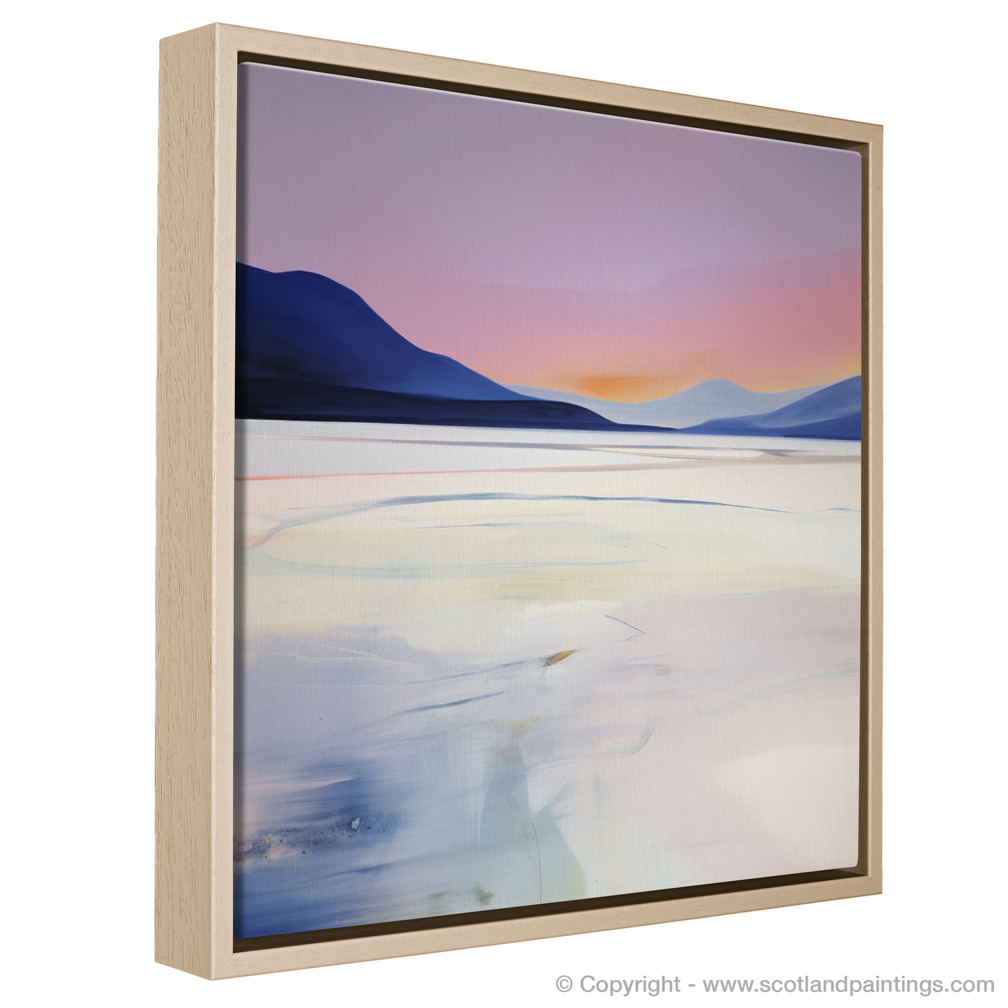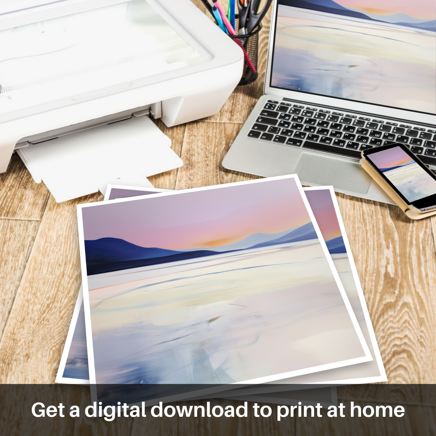 Awash with the serene hues of twilight, this evocative print captures the ethereal beauty of Luskentyre Beach at the moment when day yields to night. The sweeping brushstrokes enliven the abstract interpretation, artfully intertwining ribbons of delicate pinks, warm corals, and soothing lavenders. These colours blend seamlessly into the darker tones that lay at the base of the silhouette of the distant hills, suggesting the fading light as dusk envelops the Scottish landscape.