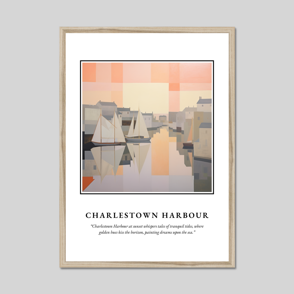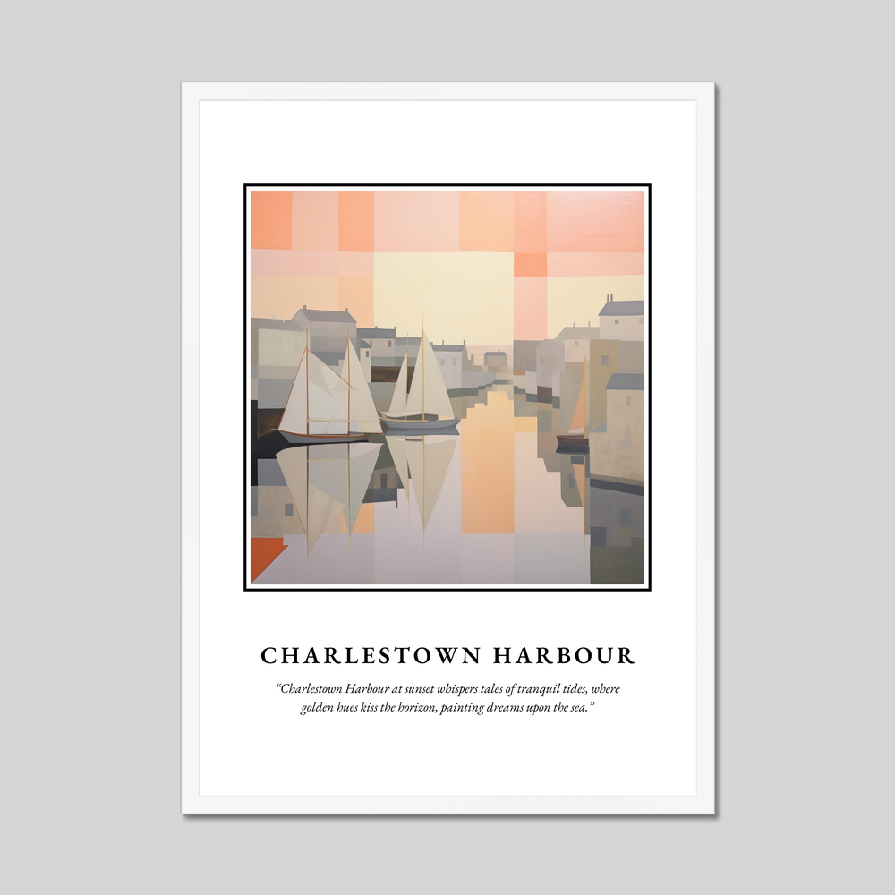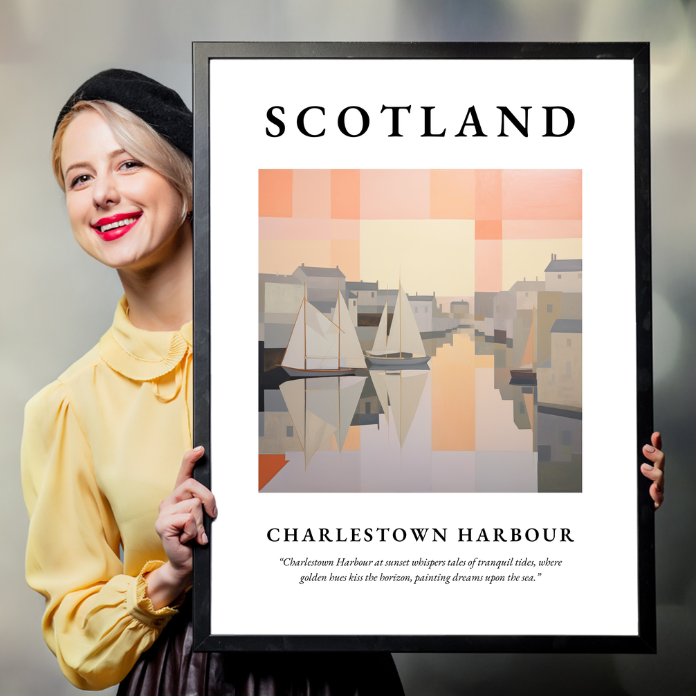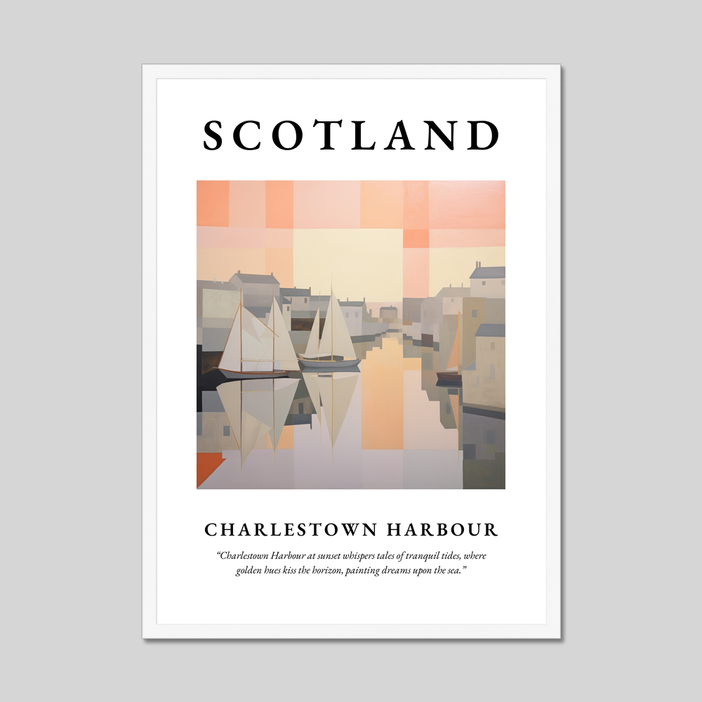 This intriguing piece from our "Scottish Harbours" collection features the word “SCOTLAND” in bold at the top, immediately capturing the viewer’s attention. Below, the painting of Charlestown Harbour unfolds in an enigmatic abstract style, bathing the harbour scene in soft, harmonious hues that evoke the gentle whispers of the sea. The muted palette creates a dreamy perspective where sails gently reflect upon calm waters, inviting the viewer to step into a moment where time seemingly stands still. Underneath, a poetic quote further enriches the imagery, “Charlestown Harbour at sunset whispers tales of tranquil tides, where golden hues kiss the horizon, painting dreams upon the sea.”