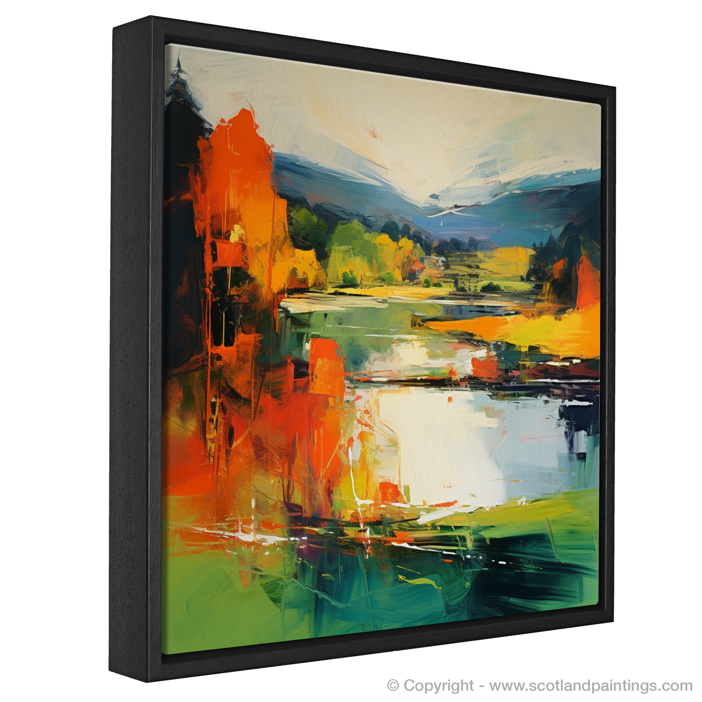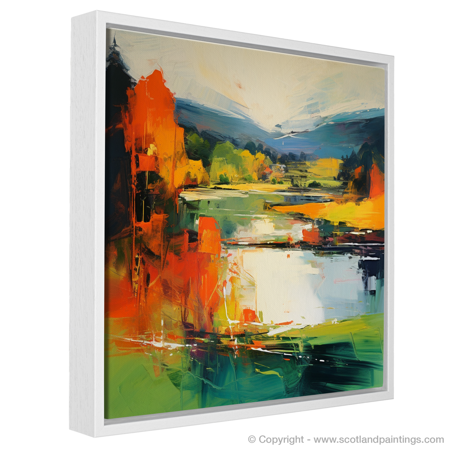 Capturing the essence of Scotland's rugged natural beauty, this expressive print invites the viewer into an abstract interpretation of Loch Faskally, nestled in the enchanting town of Pitlochry, Perthshire. Bold brushstrokes convey the phenological changes as fiery ambers and burnt oranges interlace with emerald greens. The painting's pungent hues seem to mimic the loch's serene waters reflecting autumnal hills, while creamy whites and deep blues suggest a vastness in the sky above, hinting at the swiftly changing Scottish weather.