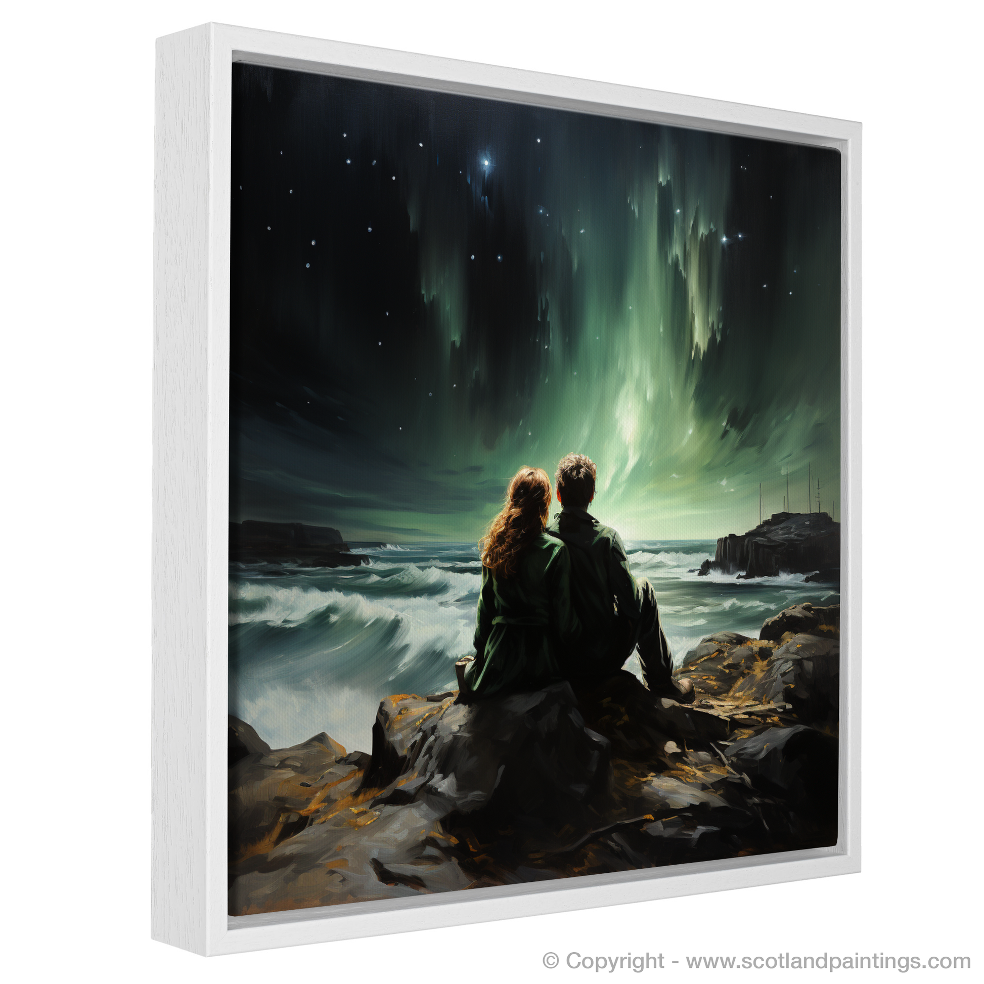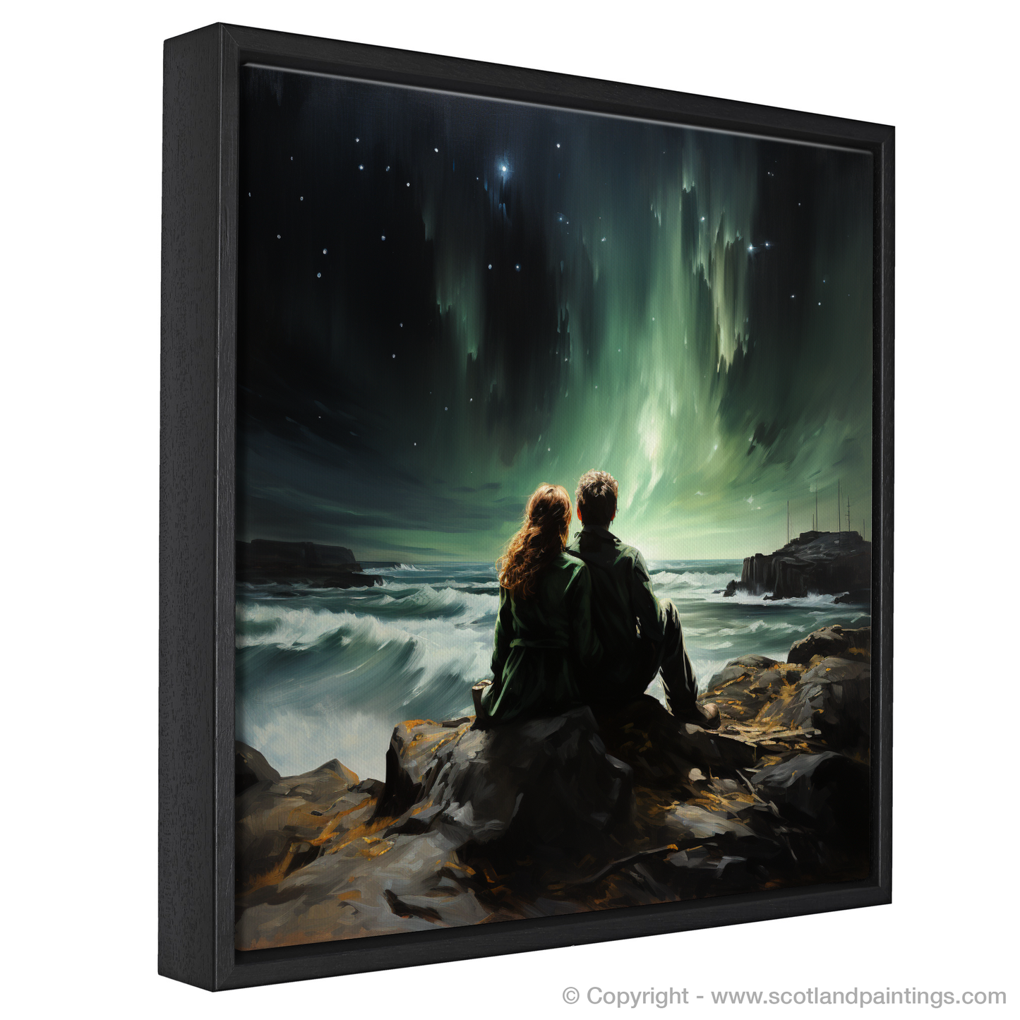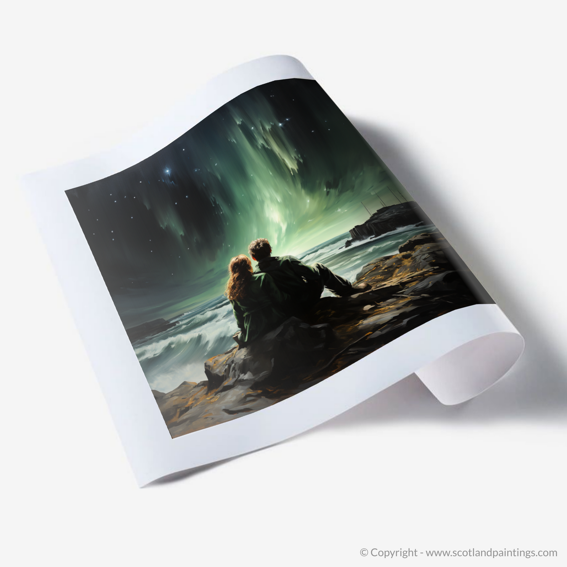 Captured within this evocative print is the soul-stirring spectacle of the Northern Lights, witnessed from the rugged coastline of Thurso. The painting invites viewers into an intimate moment shared by a couple, seated amongst jagged rocks, their backs to the observer, enveloped in shared awe of the celestial dance overhead.