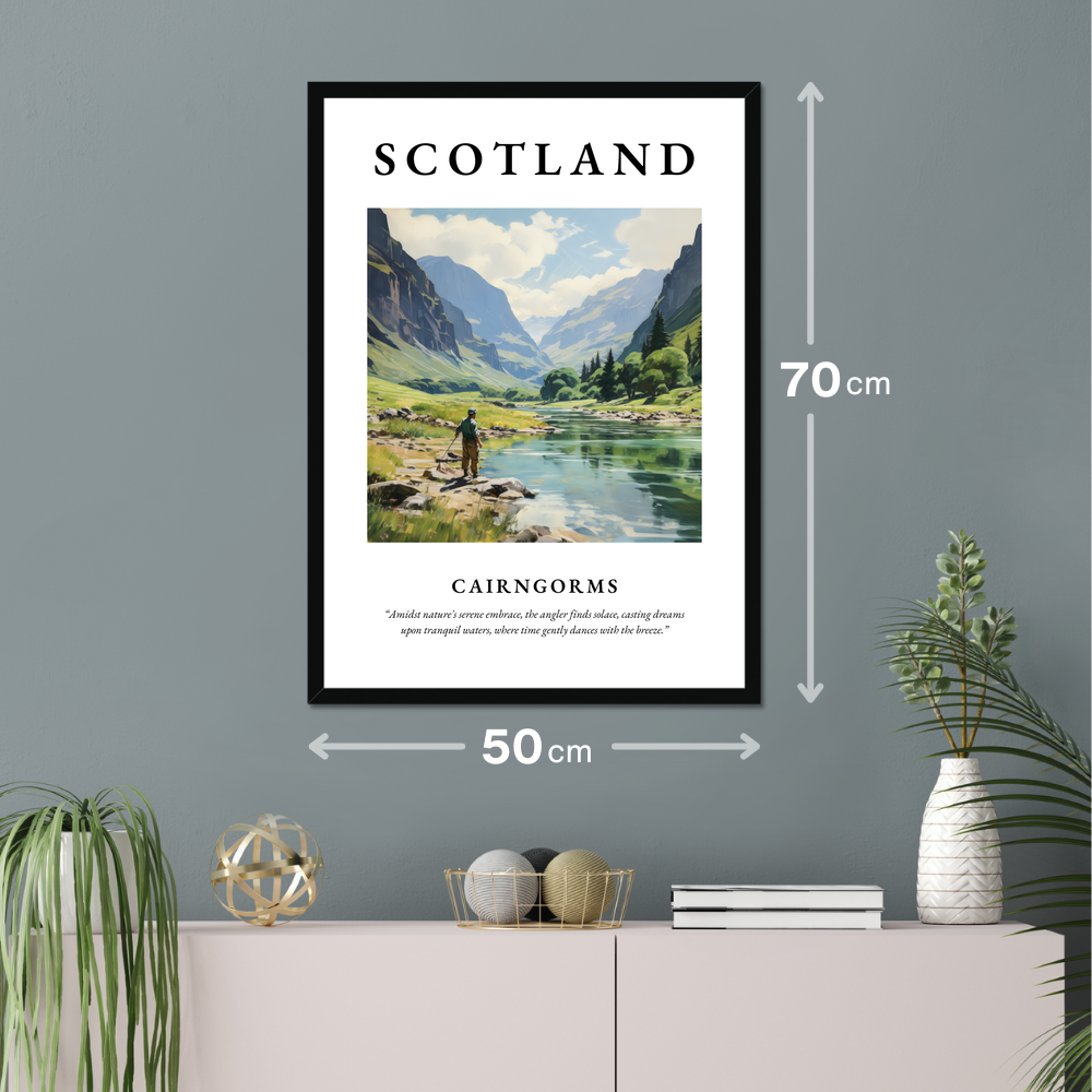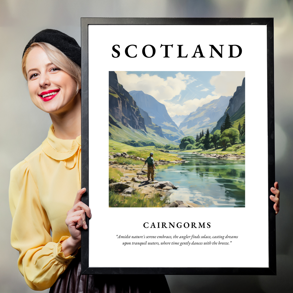 Available in a choice of black, white, or natural wood-effect frames, the stylish design features the word “SCOTLAND” in bold lettering above a stunning Realism painting of the Cairngorms. Below the serene landscape, the evocative quote reads: “Amidst nature's serene embrace, the angler finds solace, casting dreams upon tranquil waters, where time gently dances with the breeze.” Perfect for lovers of art, nature, and all things Scottish, this poster is a harmonious blend of visual beauty and poetic sentiment.