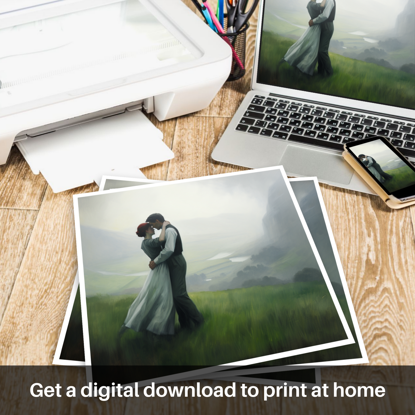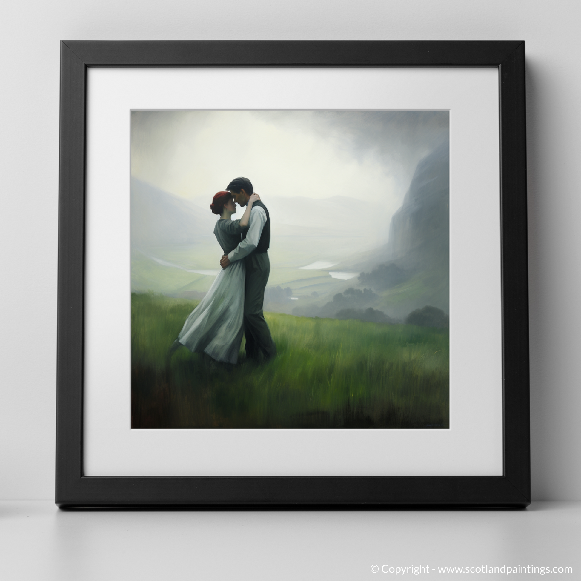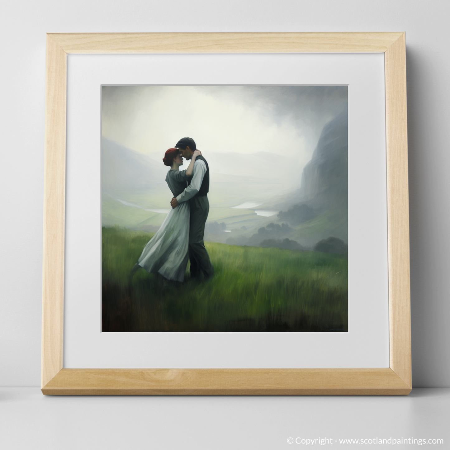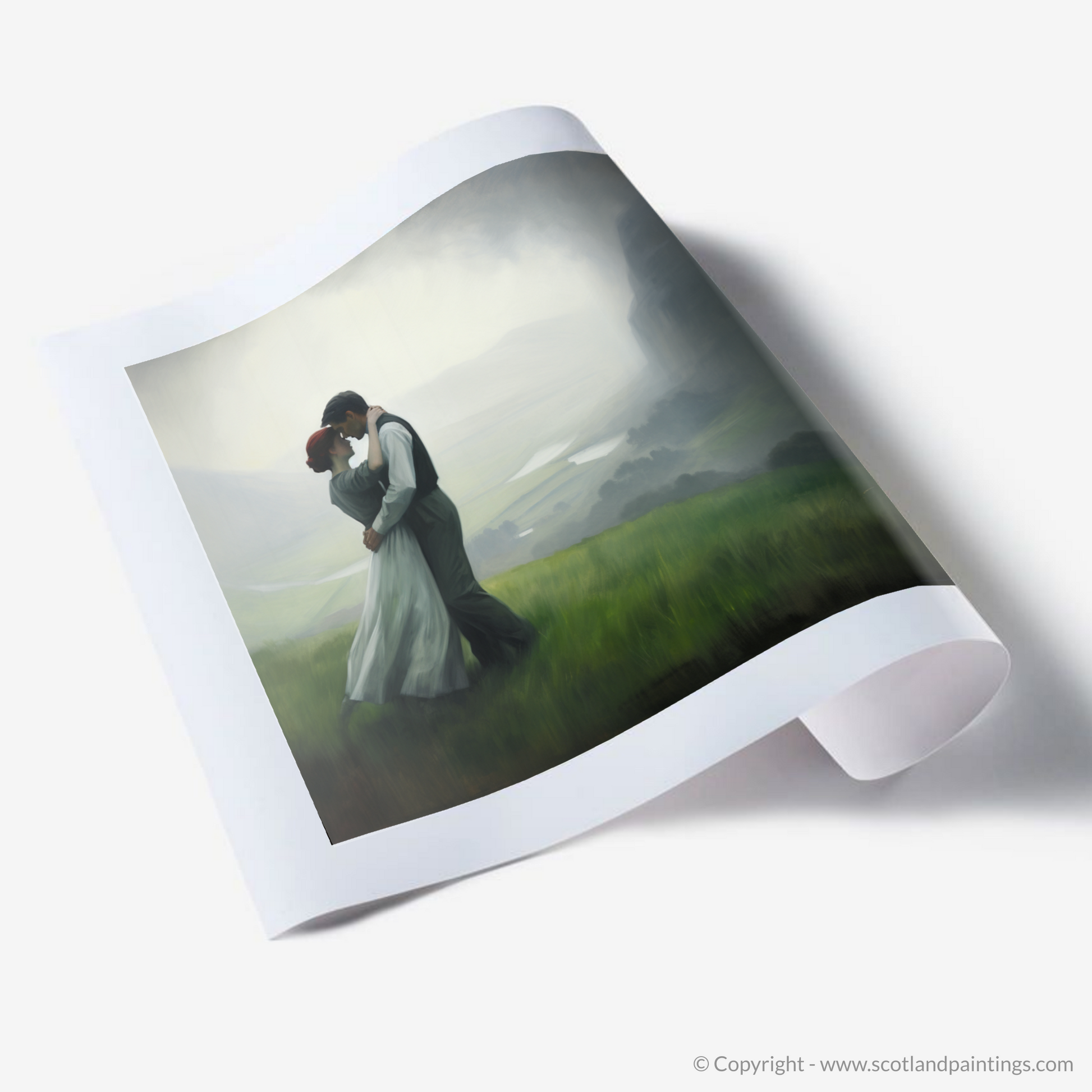 Enveloped in the ethereal mists of the Scottish Borders, this evocative print captures an intimate moment between a couple, sharing a tender glance against a backdrop of undulating hills and serene lochs. The lush greenery of the highlands stretches out around them, painted in a variety of verdant hues that showcase the natural beauty of the landscape. The muted light of an overcast sky gently illuminates the scene, lending an air of tranquillity and timeless romance to the composition.
