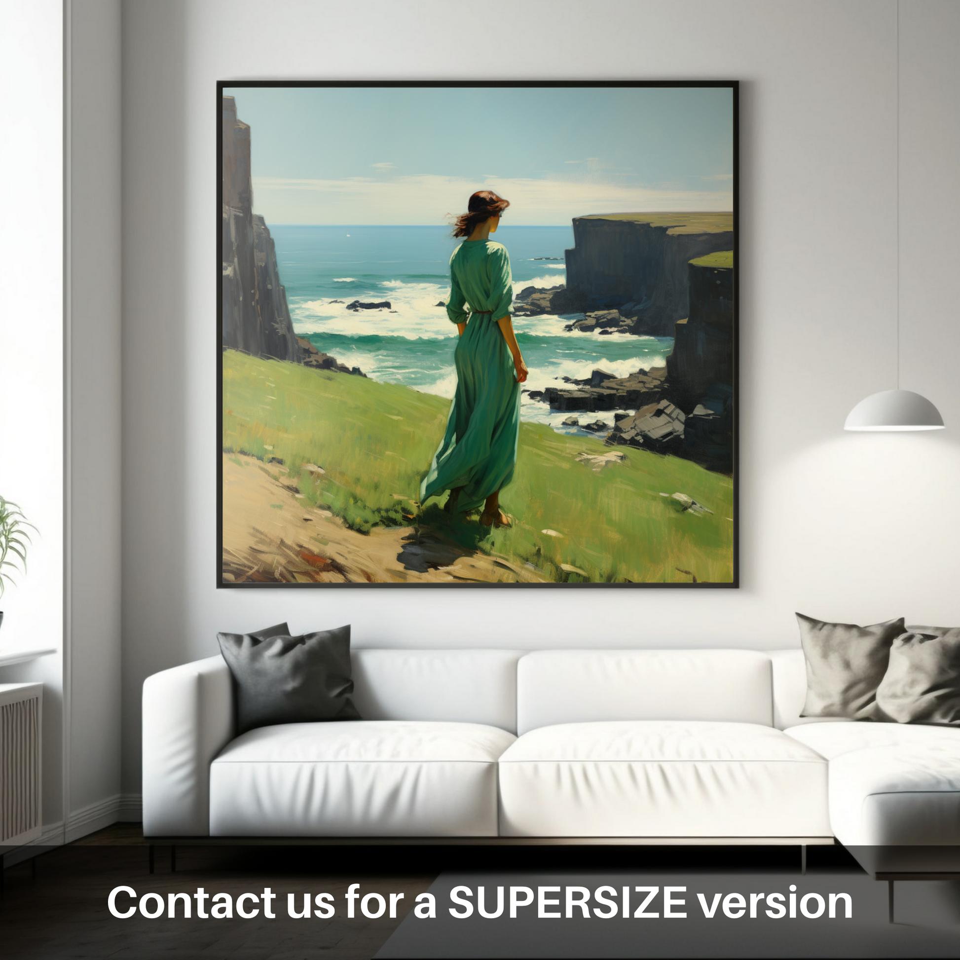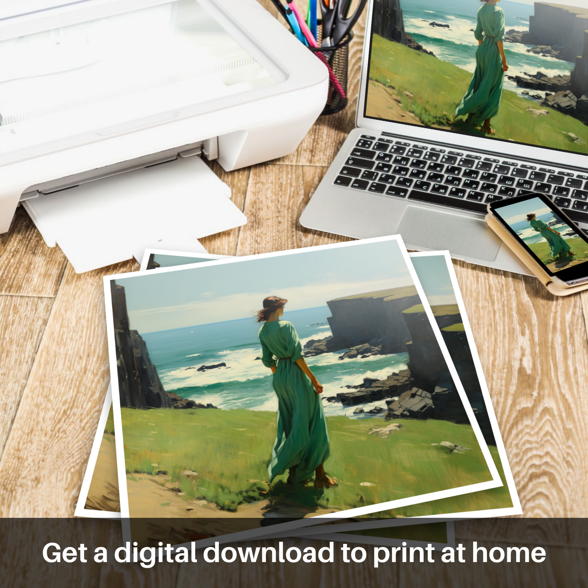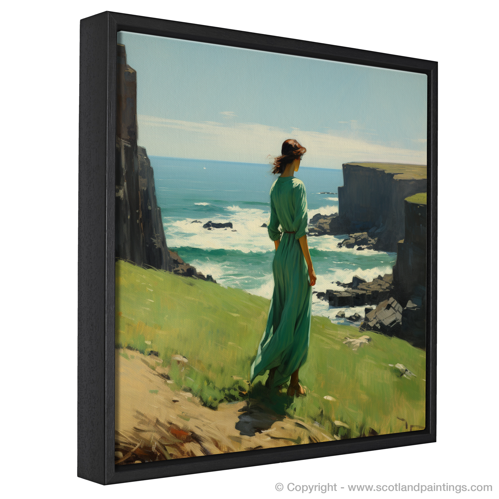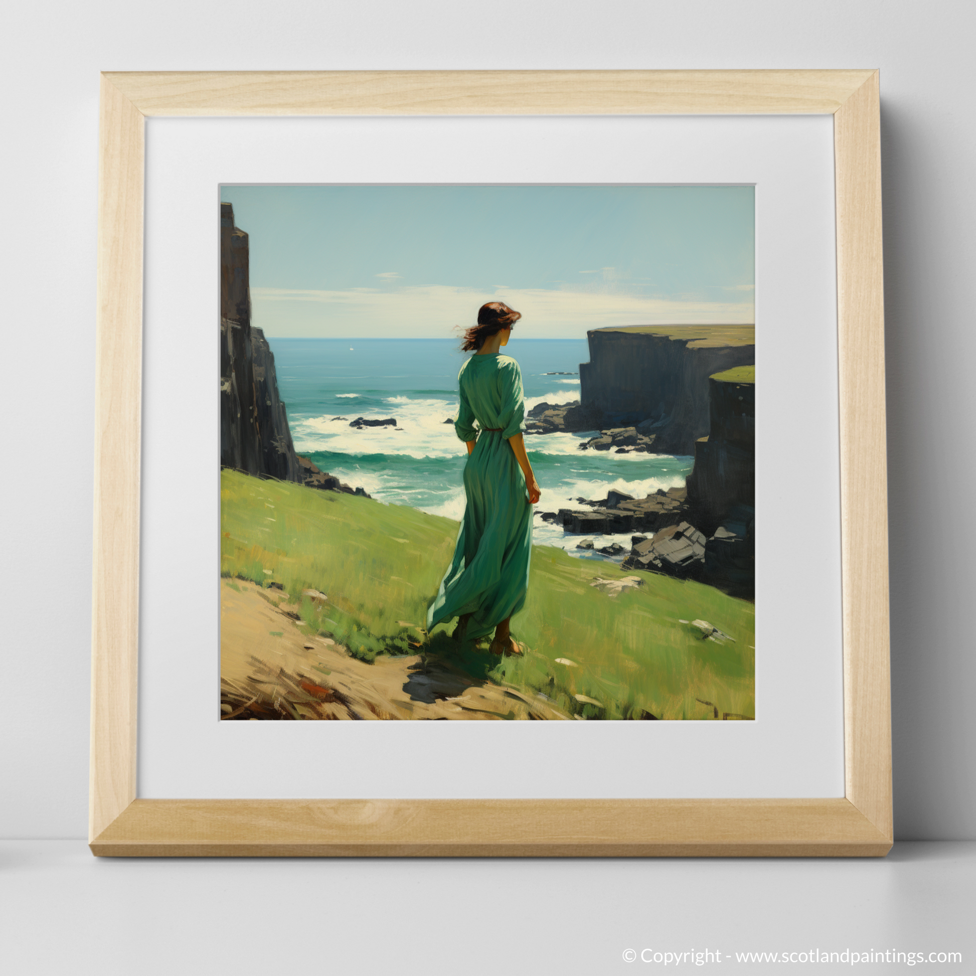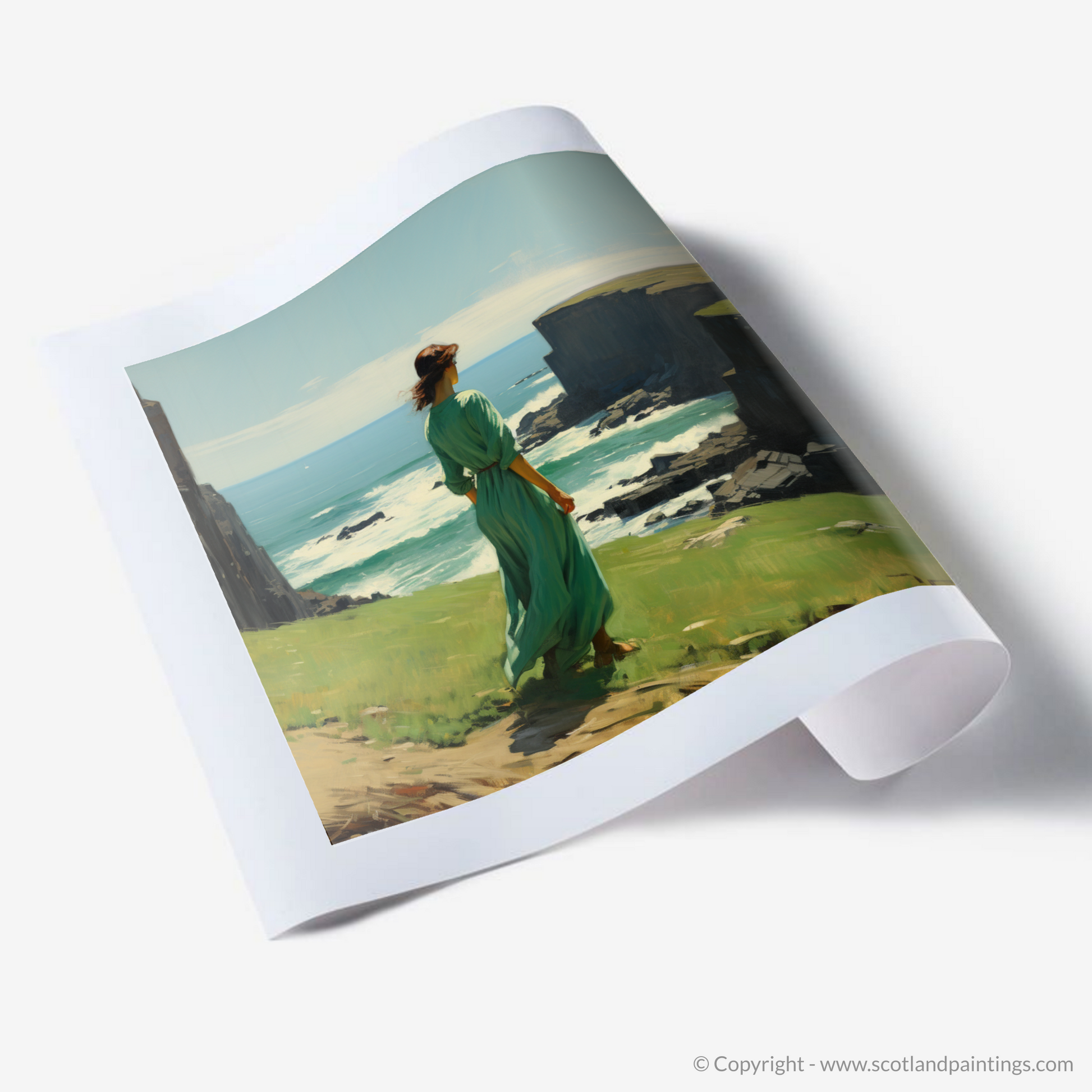 With each gentle brushstroke, this exquisite print captures the serene beauty of Scotland's rugged coastline. The composition is a celebration of the dynamic contrast between the enduring strength of Caithness cliffs and the fleeting elegance of a solitary figure immersed in the landscape.