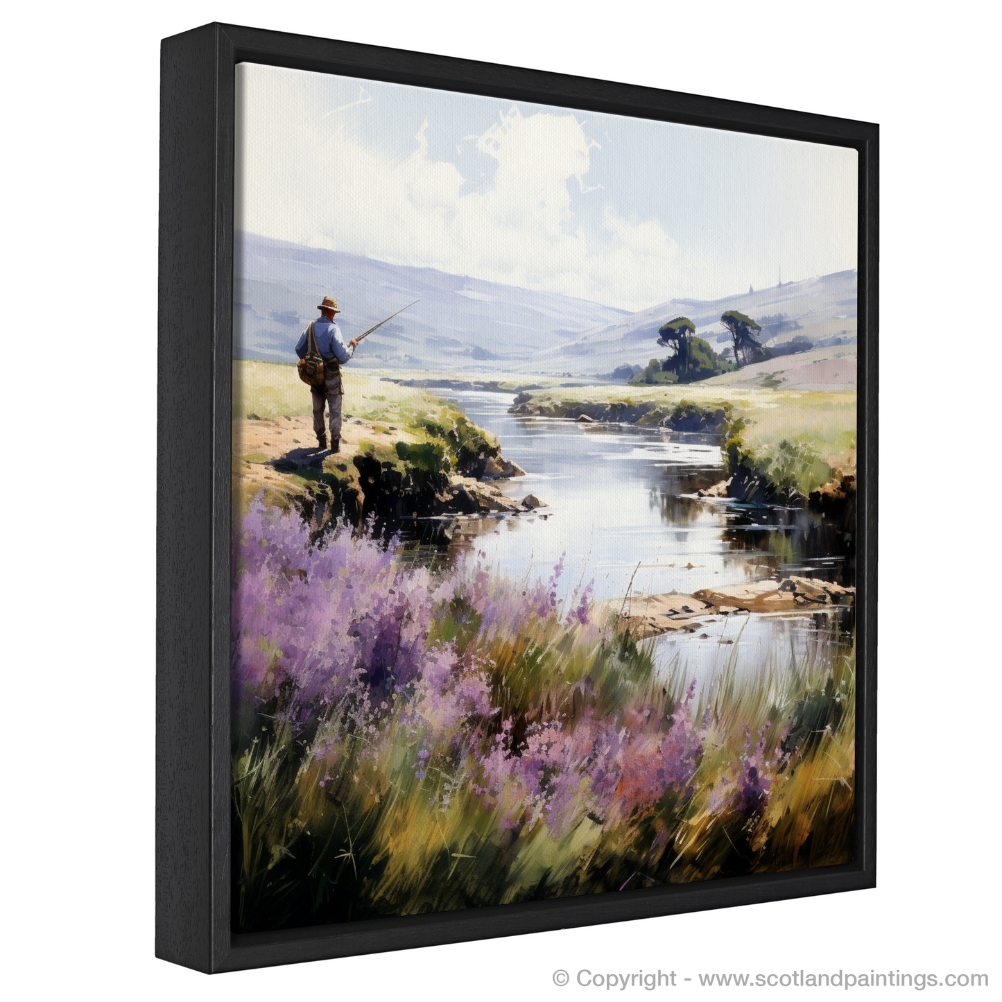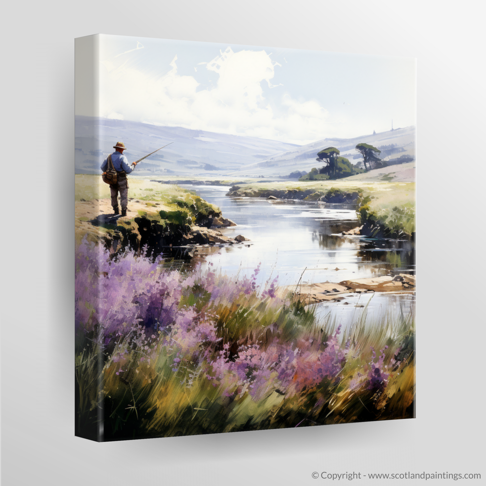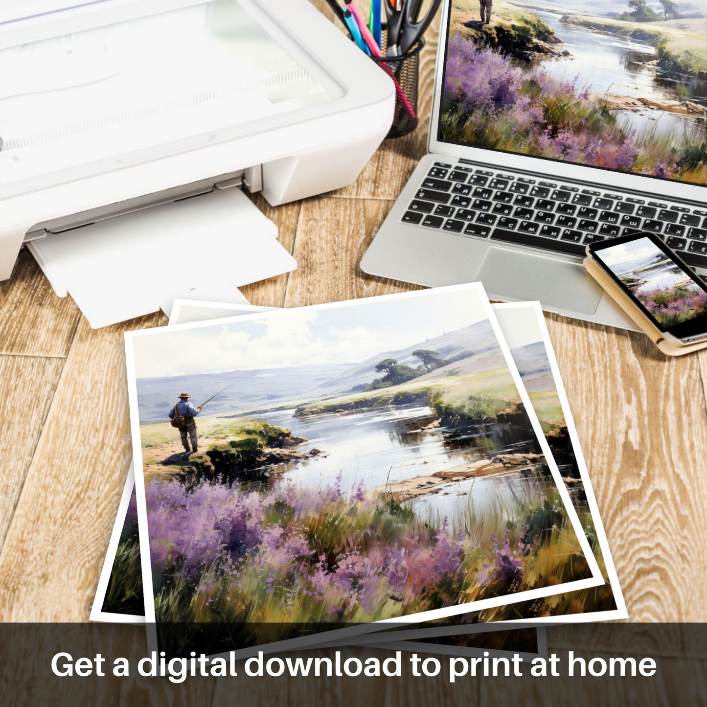 As serene tranquillity meets the vibrant crescendo of the Scottish heather, our evocative print captures the essence of fly fishing along the placid River Conon. The artwork, rooted in the Realism style, draws the beholder into a bucolic scene suffused with the warmth of a highland summer day.
