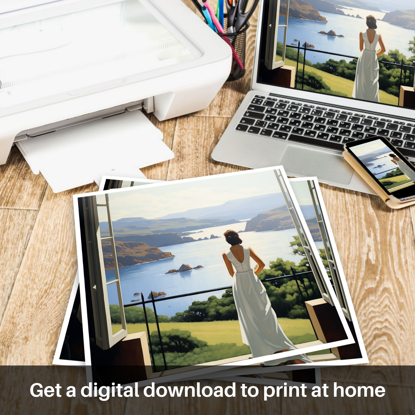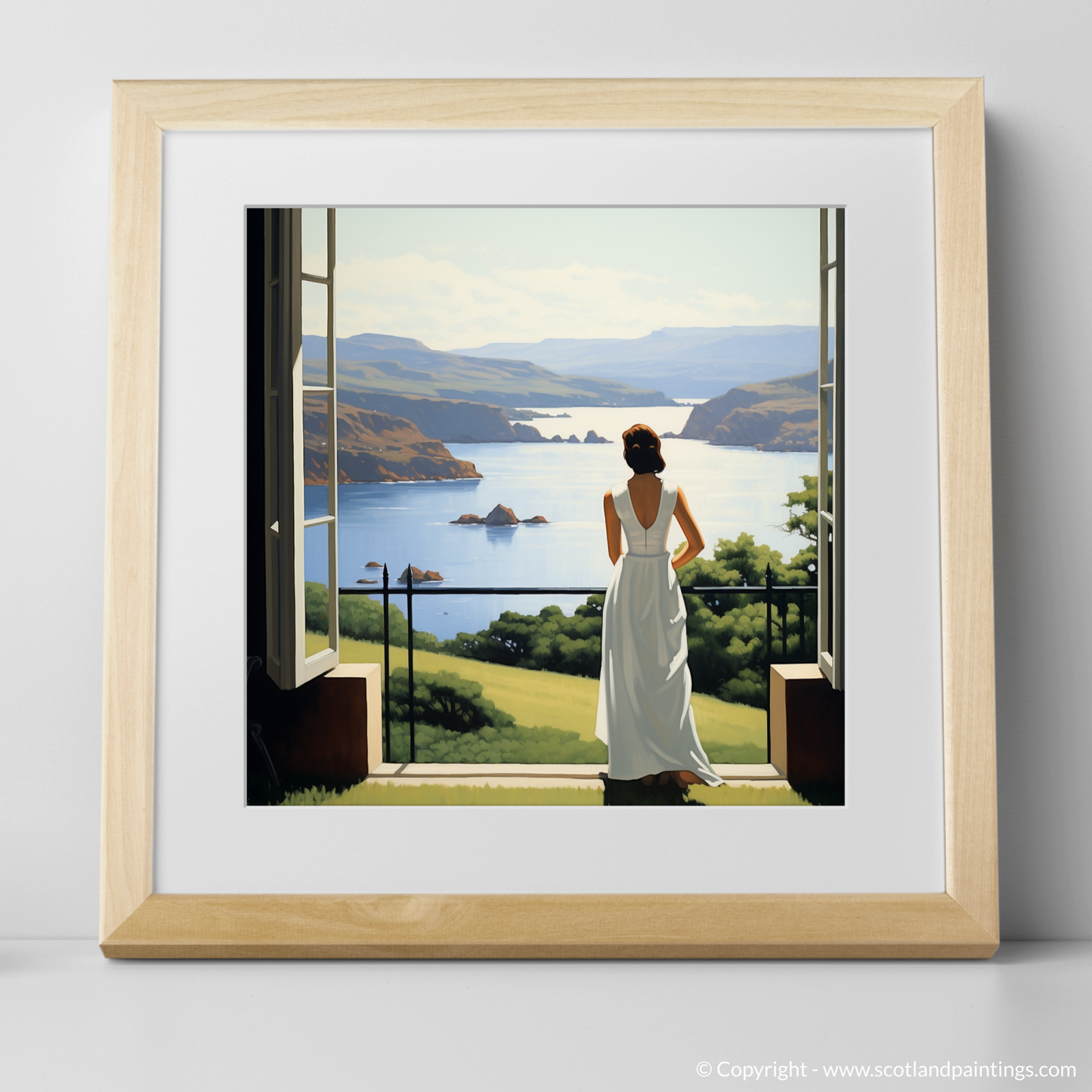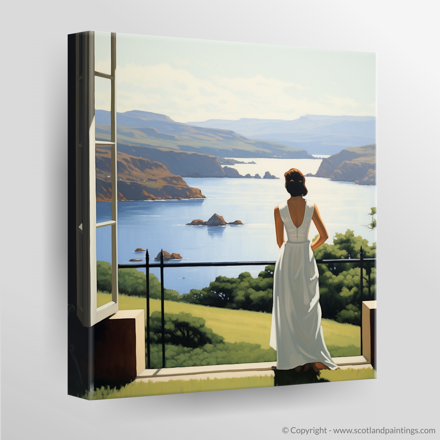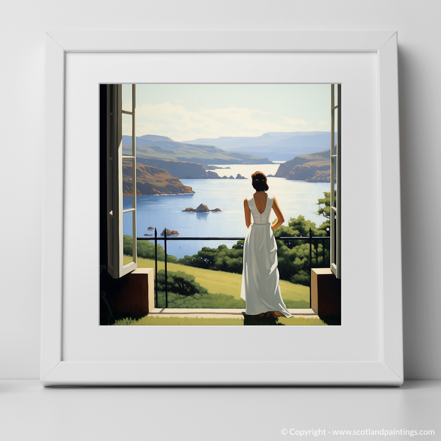 Captivating tranquility emanates from this exquisite piece, inviting viewers to bask in the serene beauty of Lochinver's bay through the eyes of a contemplative figure. The central focus, a woman draped in an elegant white dress, stands poised on a balcony. Her posture is one of quiet reflection, gazing out upon the sapphire waters embraced by the rugged, sun-kissed cliffs.