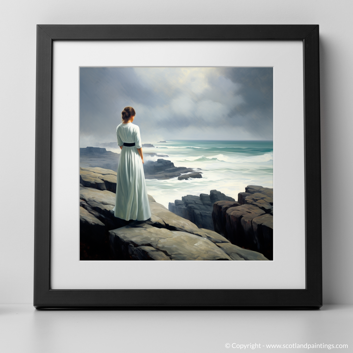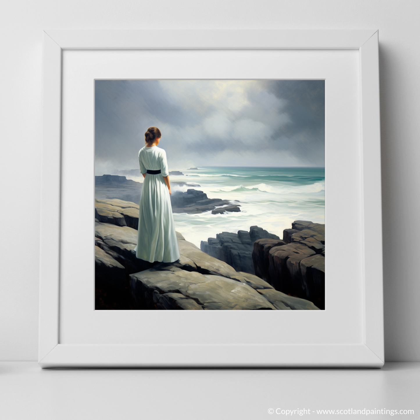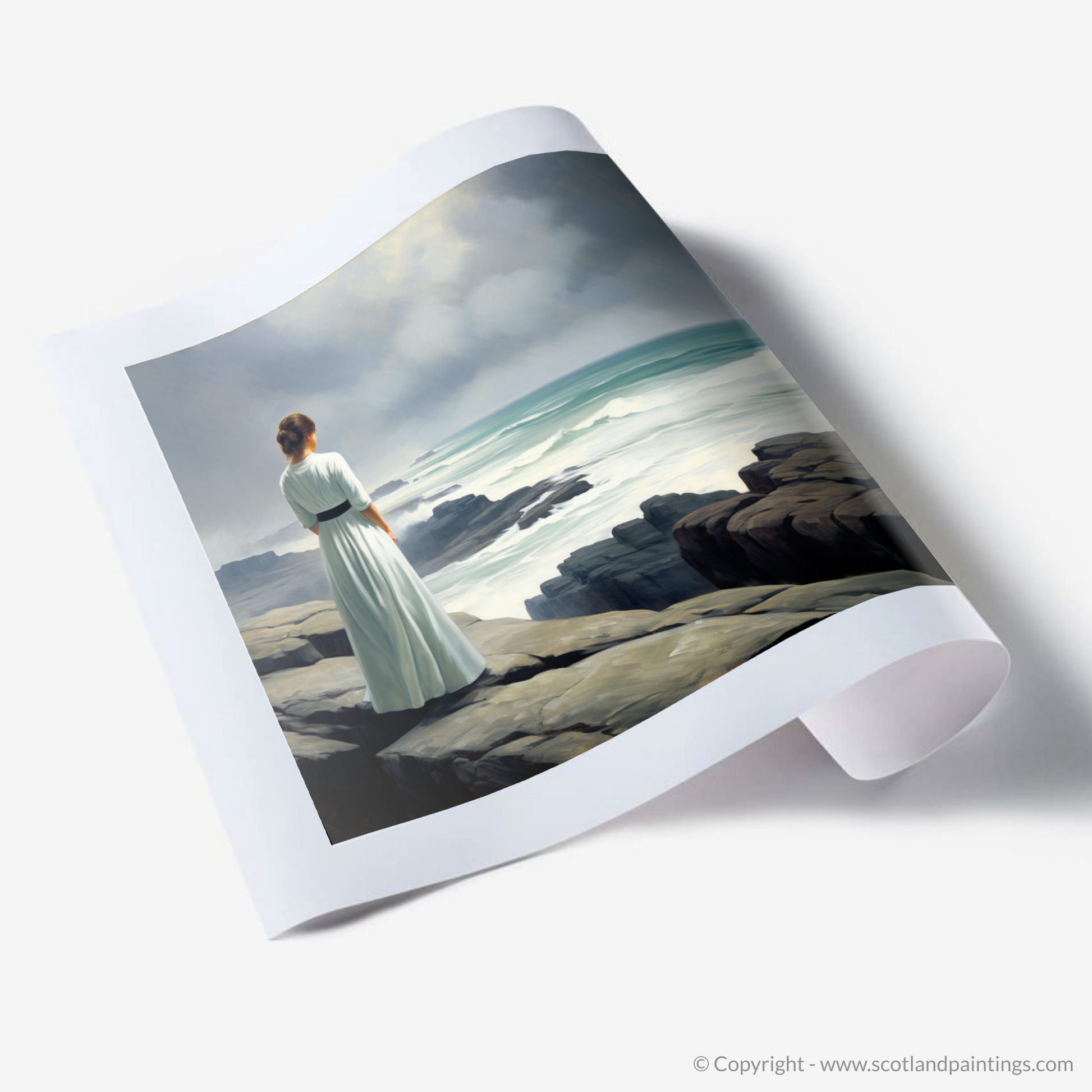 Captured in stunning realism, this evocative print invites the viewer to experience the serene majesty of Orkney's coastal landscape through the eyes of a solitary figure. The woman, draped in a simple yet elegant white dress that billows gently in the sea breeze, stands poised at the edge of the rugged cliffs. Her position conveys a sense of contemplation and awe as she gazes across the churning waters below.