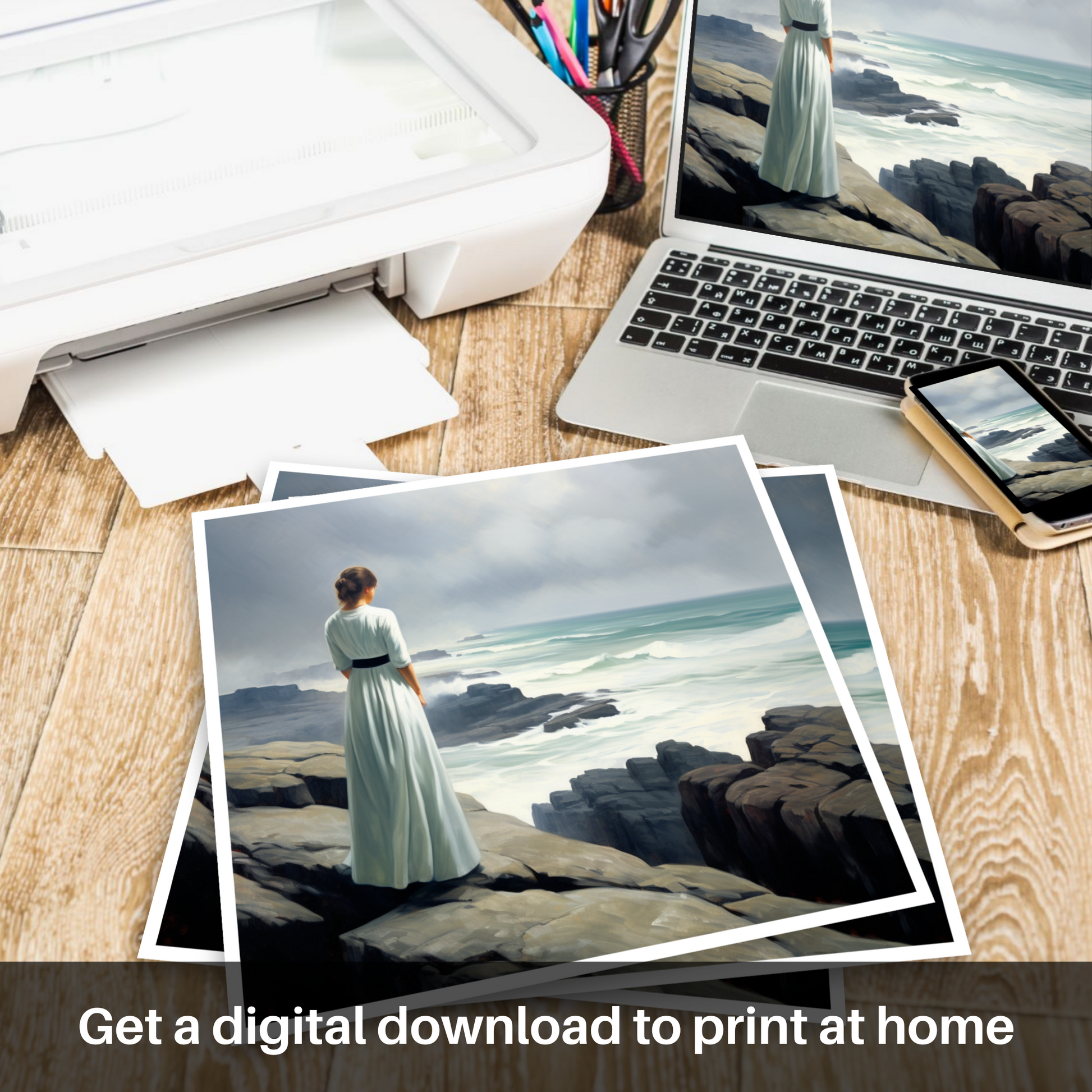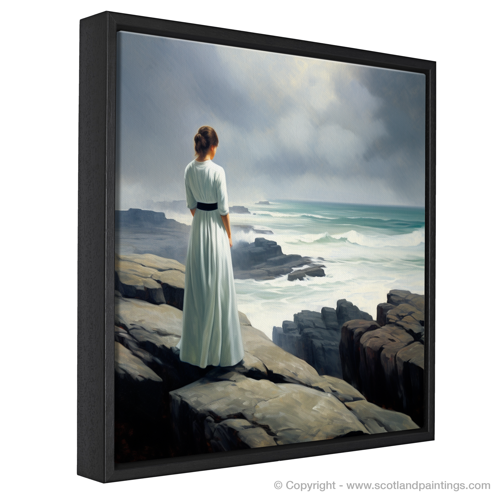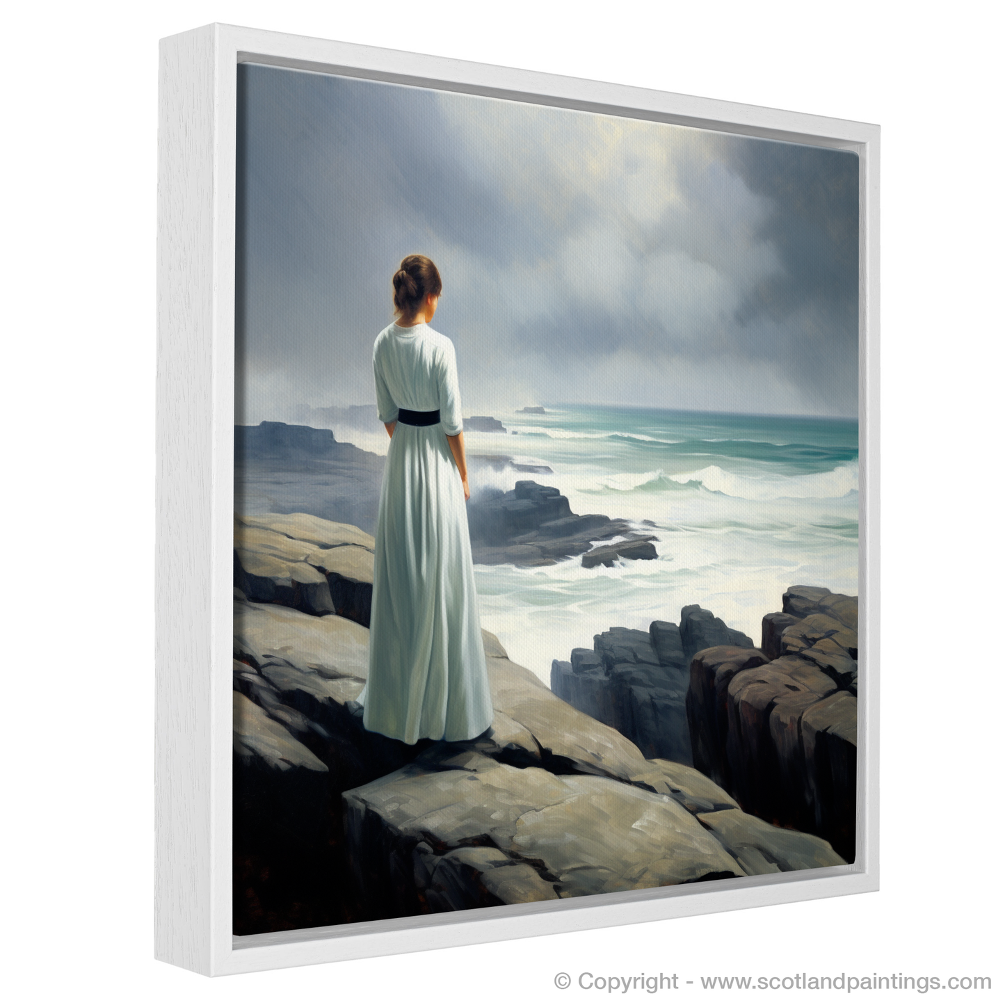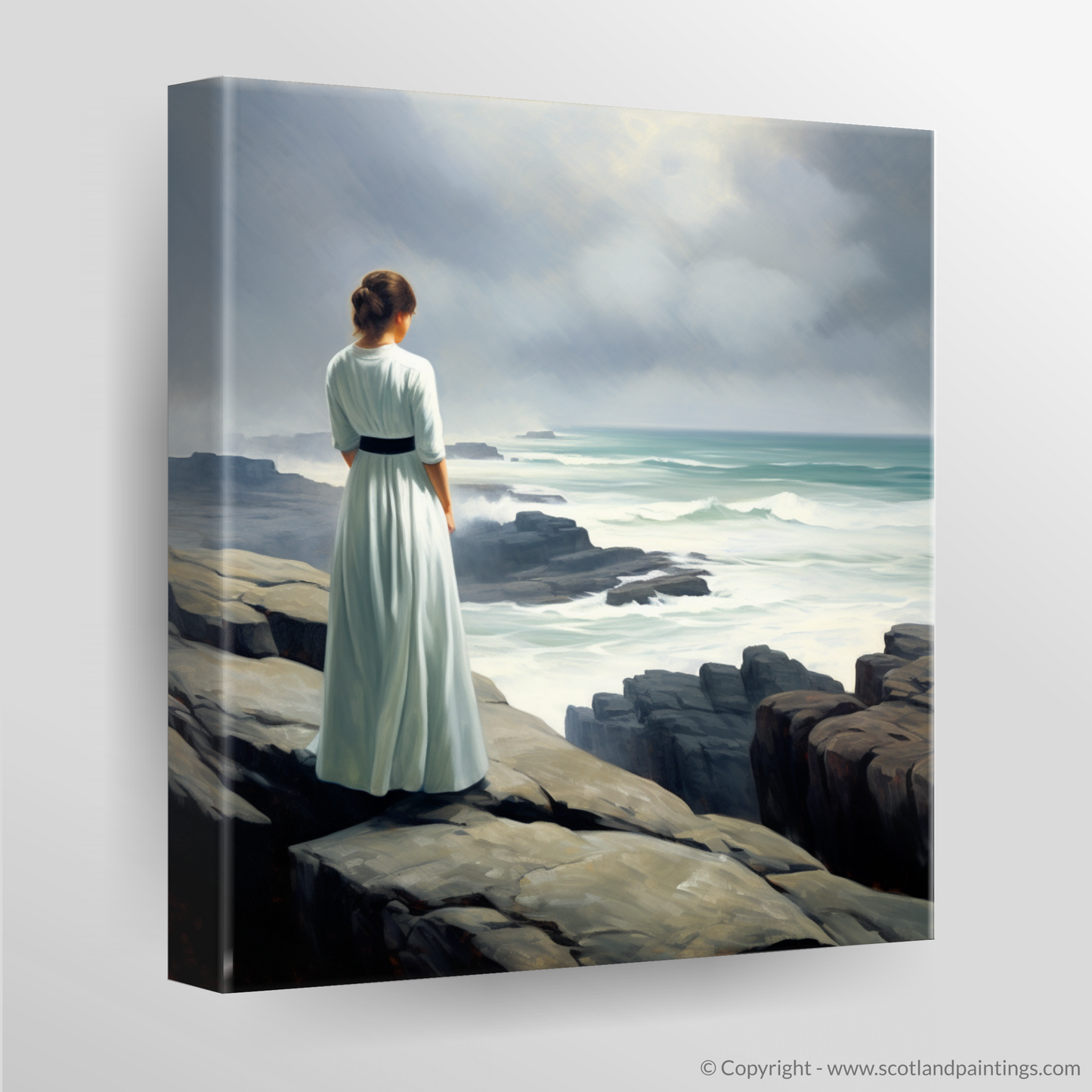 Captured in stunning realism, this evocative print invites the viewer to experience the serene majesty of Orkney's coastal landscape through the eyes of a solitary figure. The woman, draped in a simple yet elegant white dress that billows gently in the sea breeze, stands poised at the edge of the rugged cliffs. Her position conveys a sense of contemplation and awe as she gazes across the churning waters below.