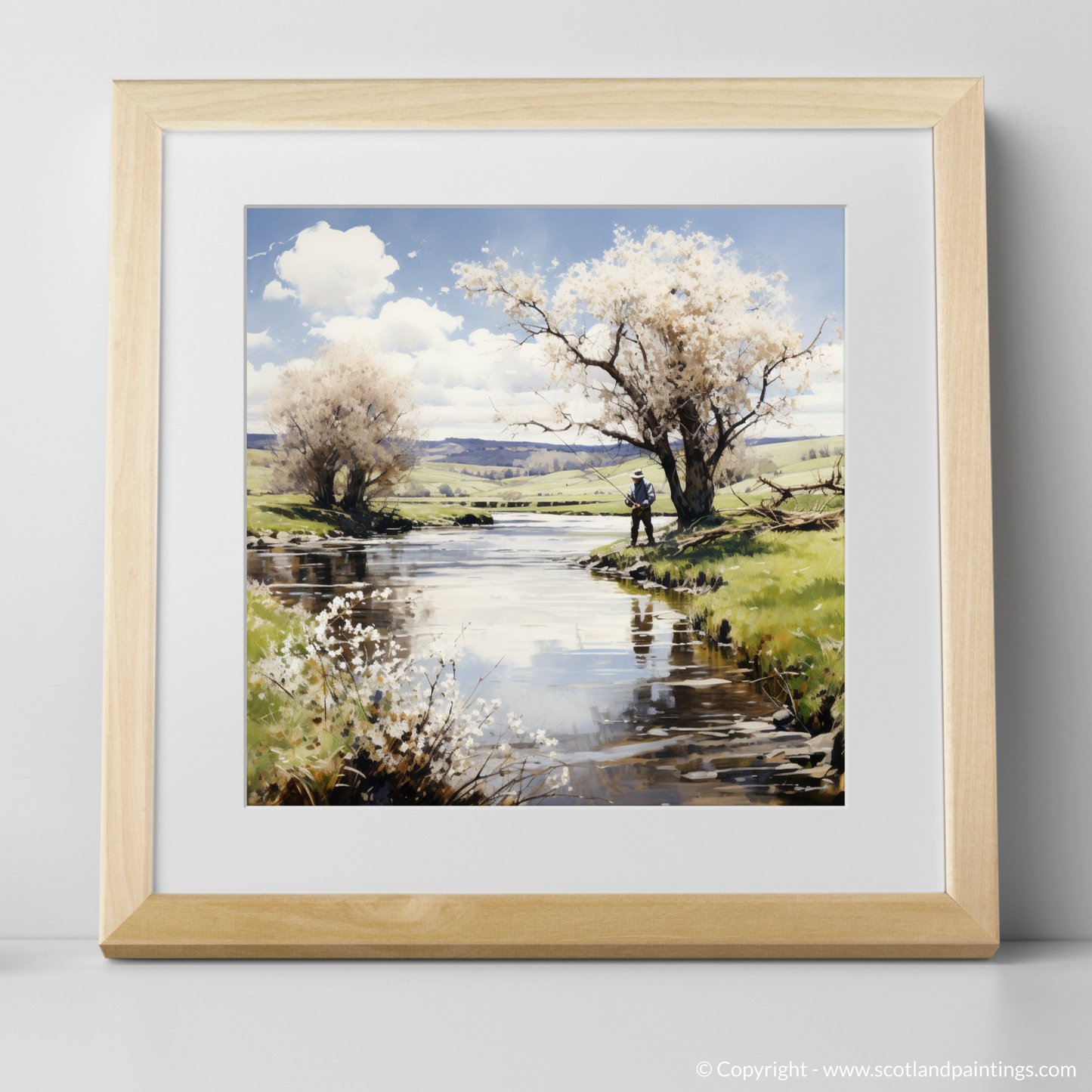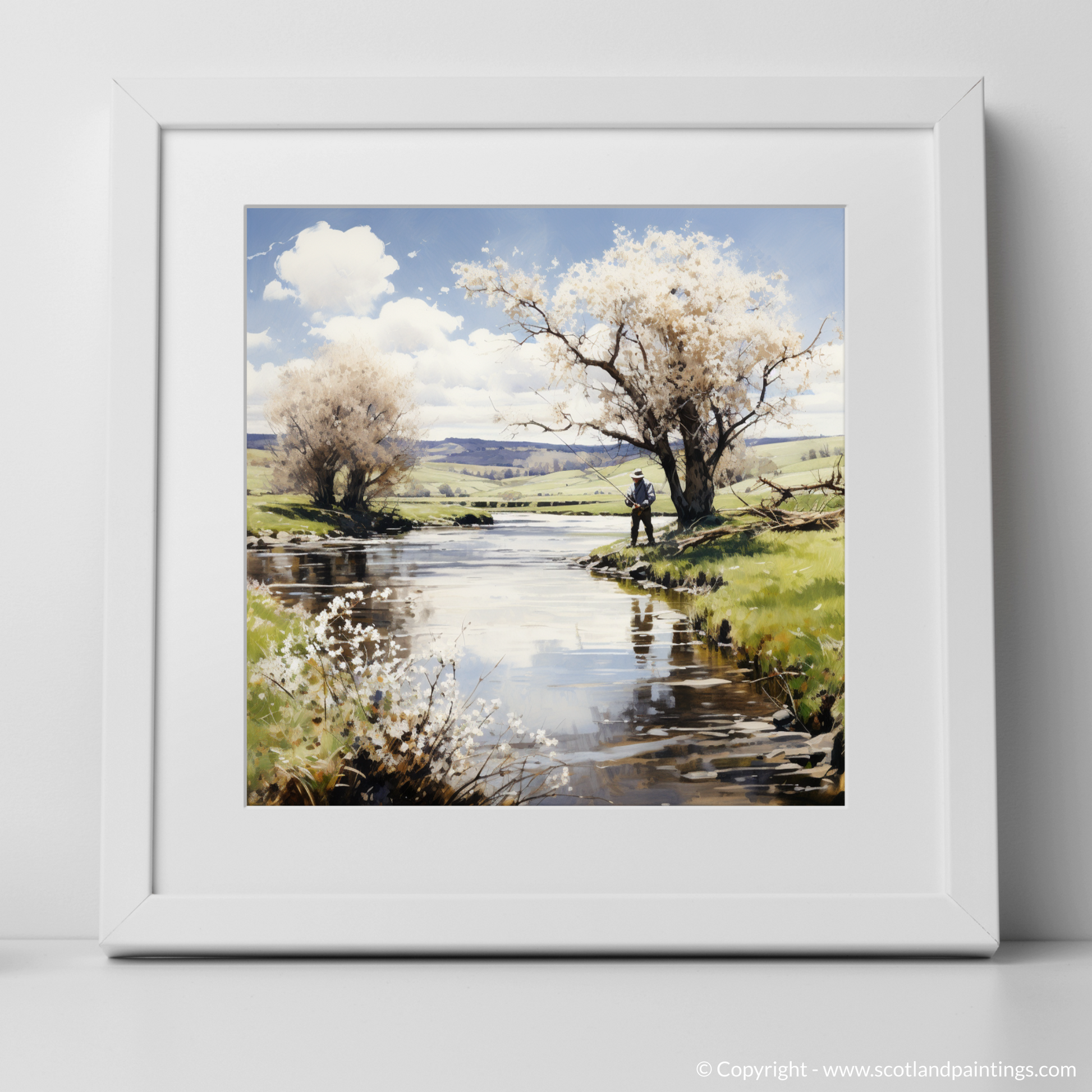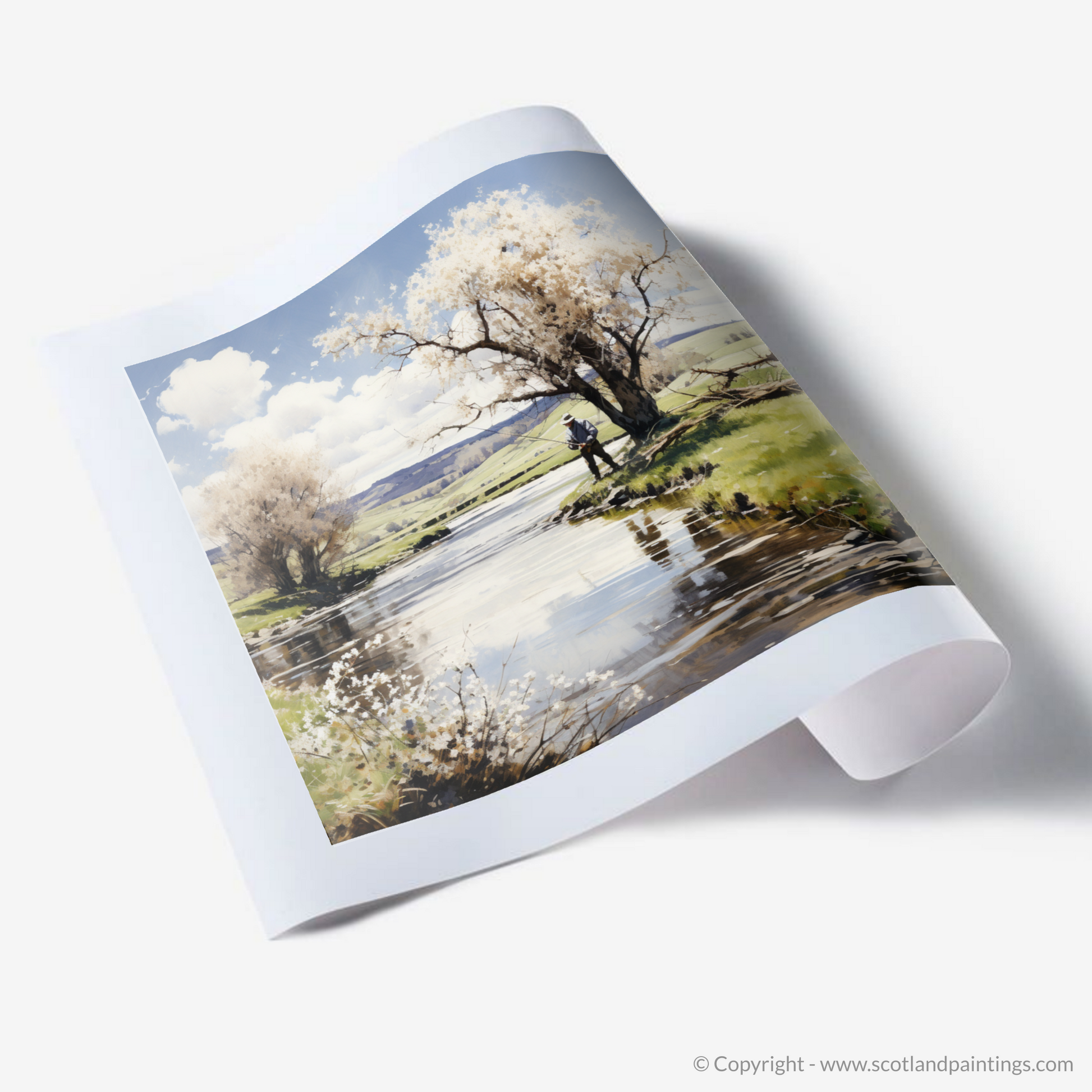 Capturing the serene essence of a quintessential Scottish spring, this evocative print invites viewers to immerse themselves in the tranquil splendour of the River Spey. As the centrepiece, a solitary figure stands poised with a fly rod, harmonised with nature's rhythm. Clad in understated attire, the angler's focus reflects the patience and peace inherent in the sport of fly fishing.