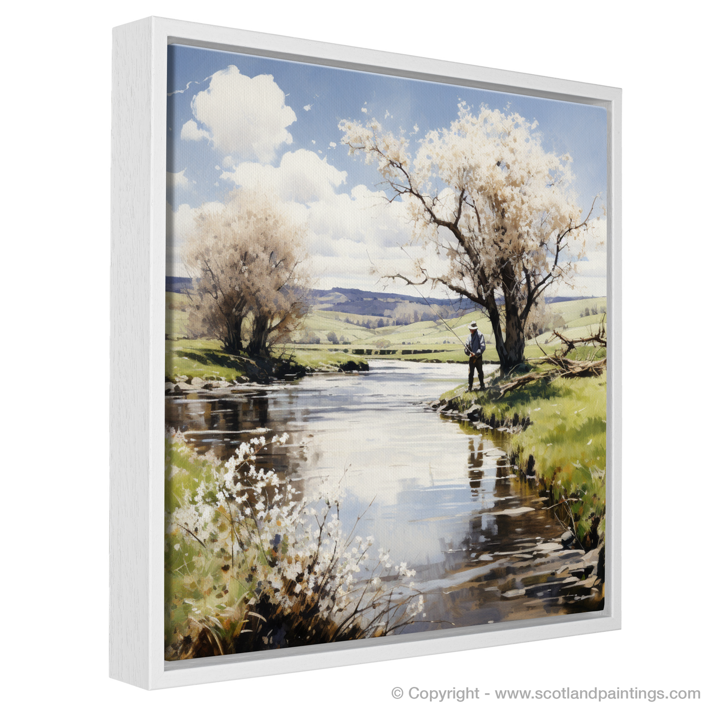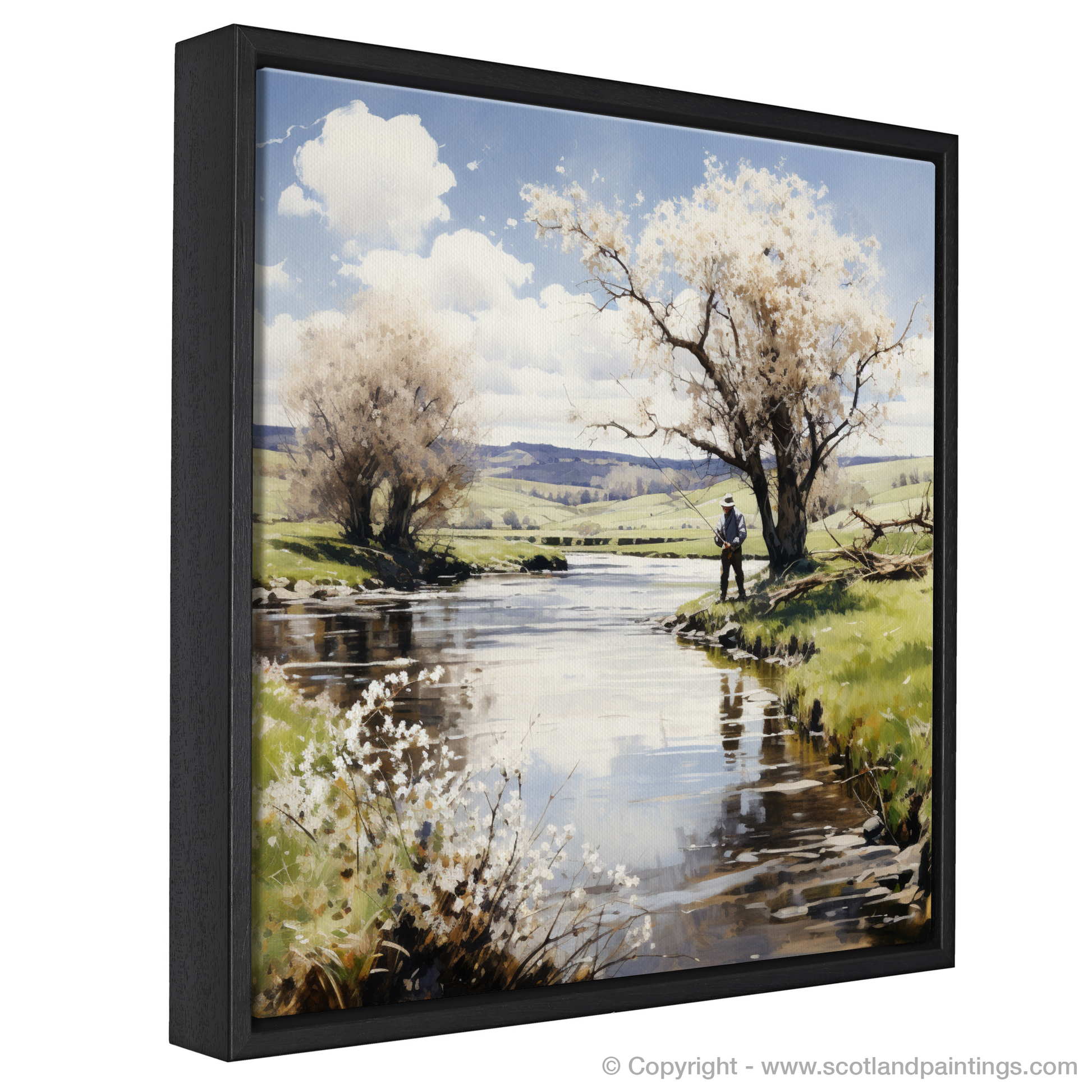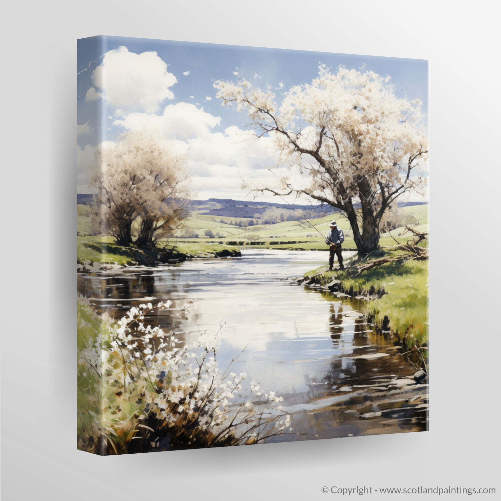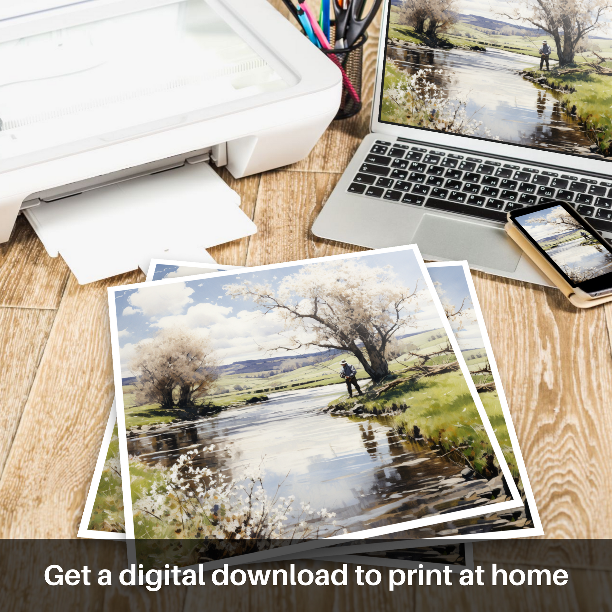Capturing the serene essence of a quintessential Scottish spring, this evocative print invites viewers to immerse themselves in the tranquil splendour of the River Spey. As the centrepiece, a solitary figure stands poised with a fly rod, harmonised with nature's rhythm. Clad in understated attire, the angler's focus reflects the patience and peace inherent in the sport of fly fishing.