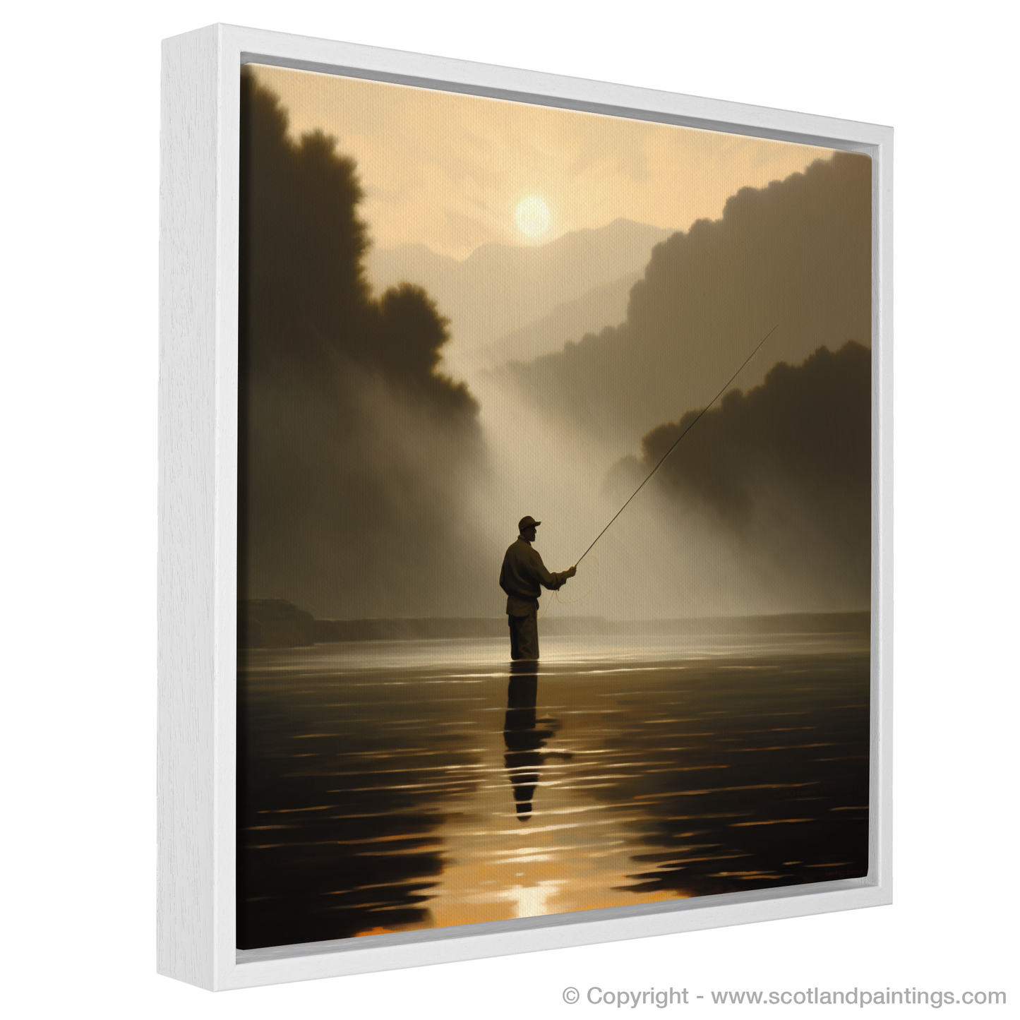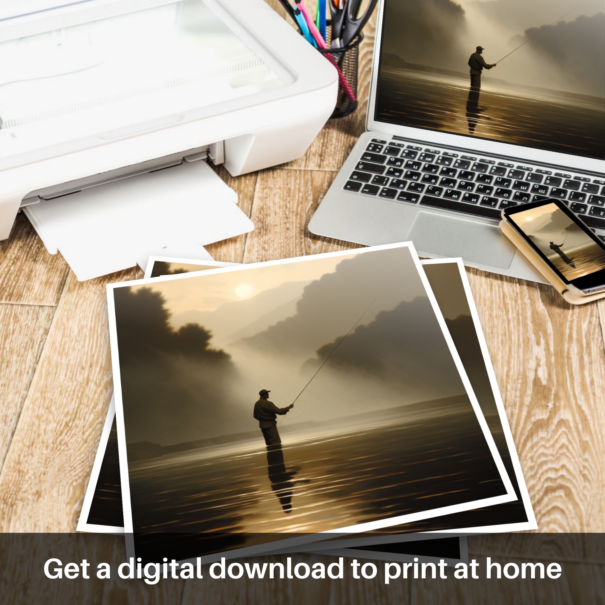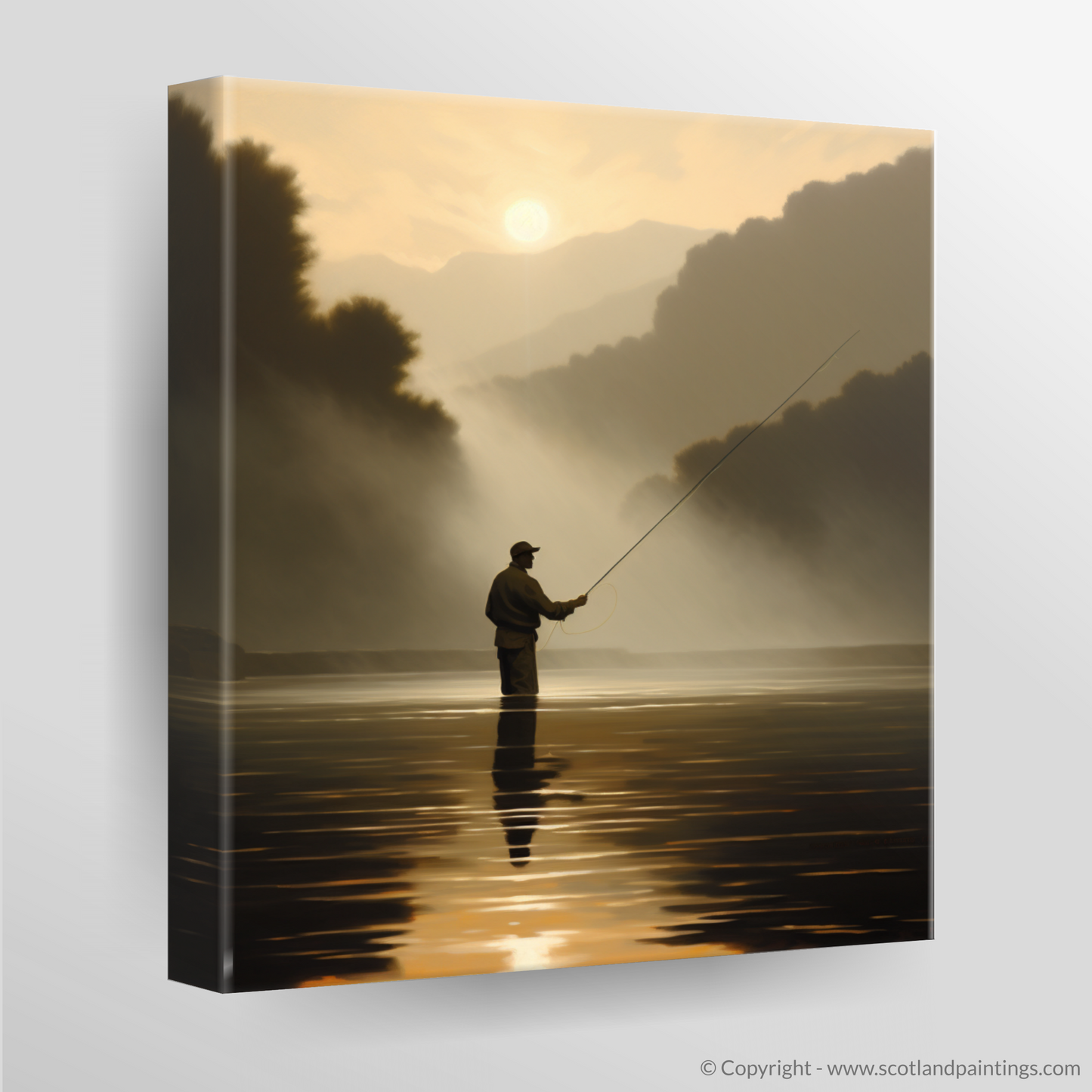 A solitary figure stands at the heart of the composition, engaged in the time-honored tradition of fly fishing. Clad in a hat and waders, the fisherman is the epitome of focus and patience, his silhouette reflected in the glassy waters below. Expertly rendered in the realism style, every detail of the scene—from the gentle ripple of the water to the ethereal quality of the light—evokes a sense of calm and quiet majesty.