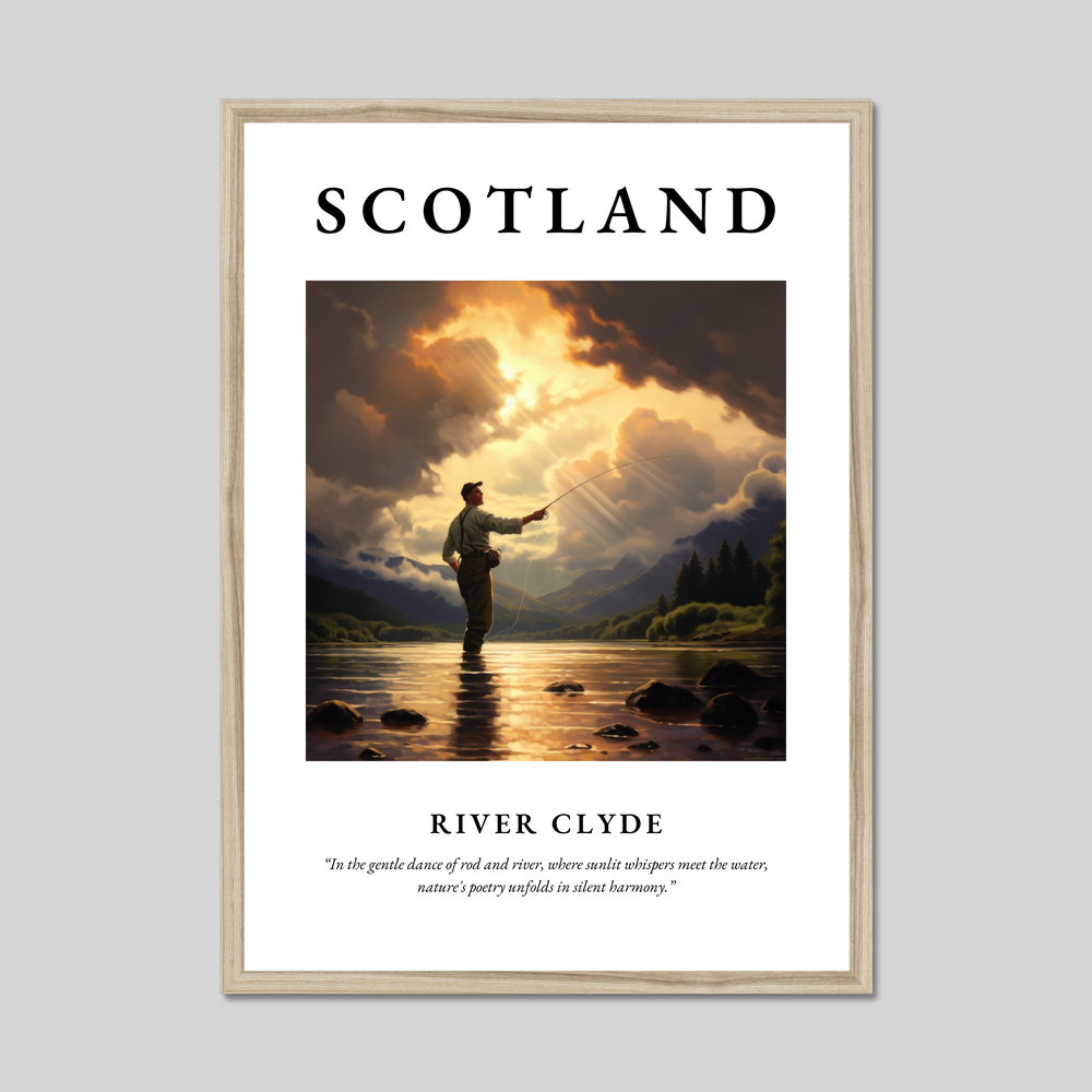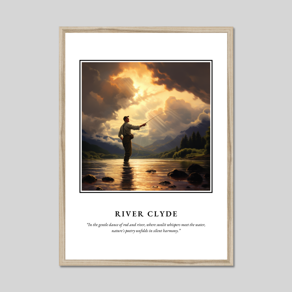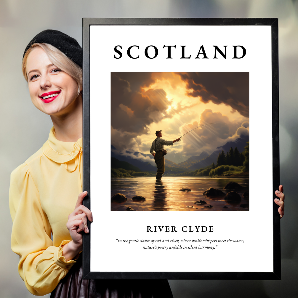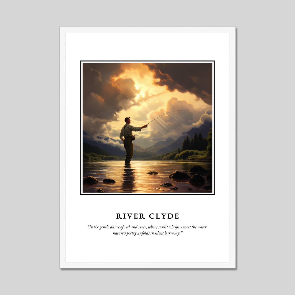 The River Clyde, a celebrated feature of Scotland's landscape, flows gracefully through the heart of the country. It has long been synonymous with the spirit of Scotland—a source of vitality and an inspiration for countless stories and artworks. Historically, the Clyde was the lifeblood of industry, and today, its peaceful banks are a haven for those seeking solace in nature. This poster's vivid imagery allows you to appreciate the Clyde's beauty from afar, capturing the gentle ebb and flow of its waters and the meditative pursuit of fly fishing.