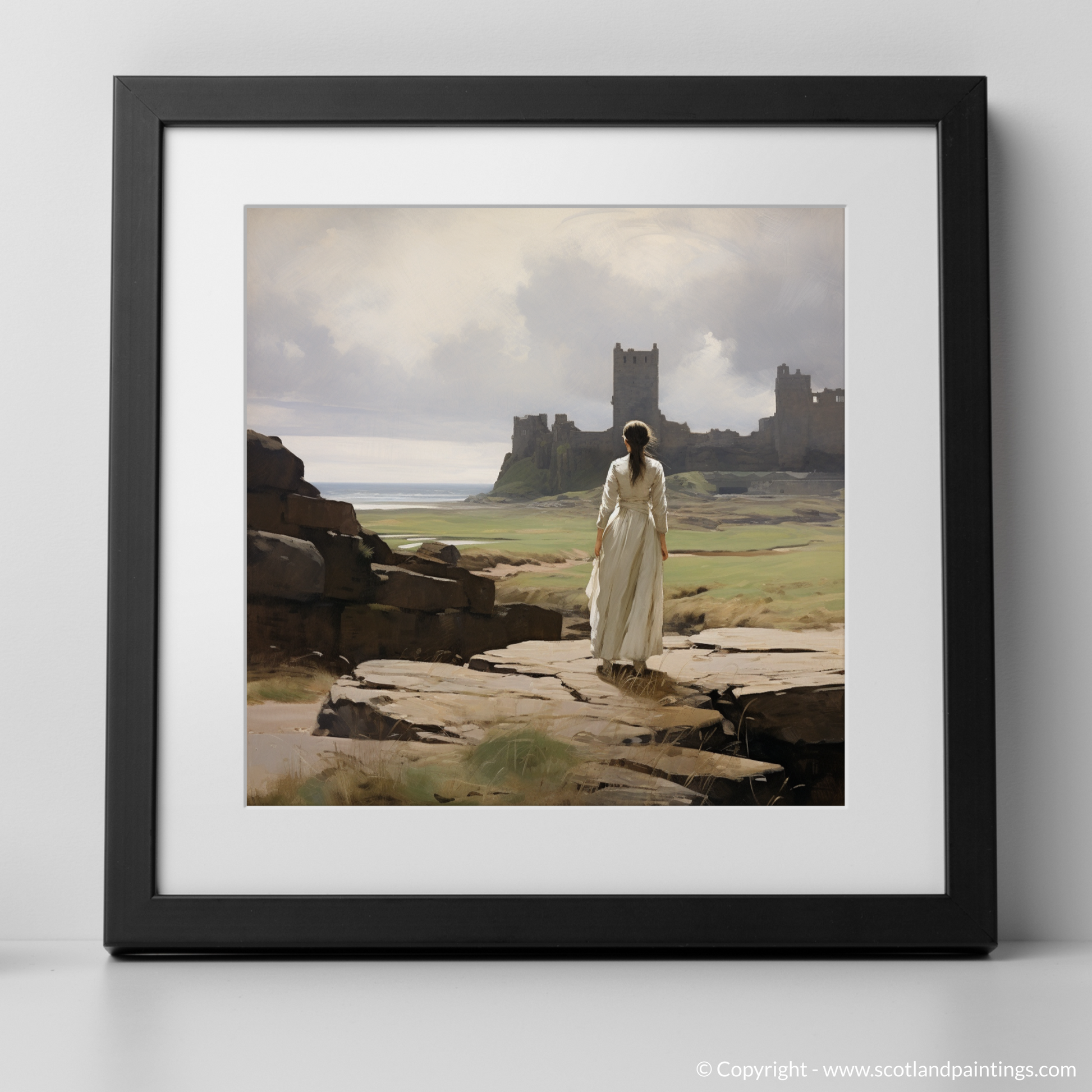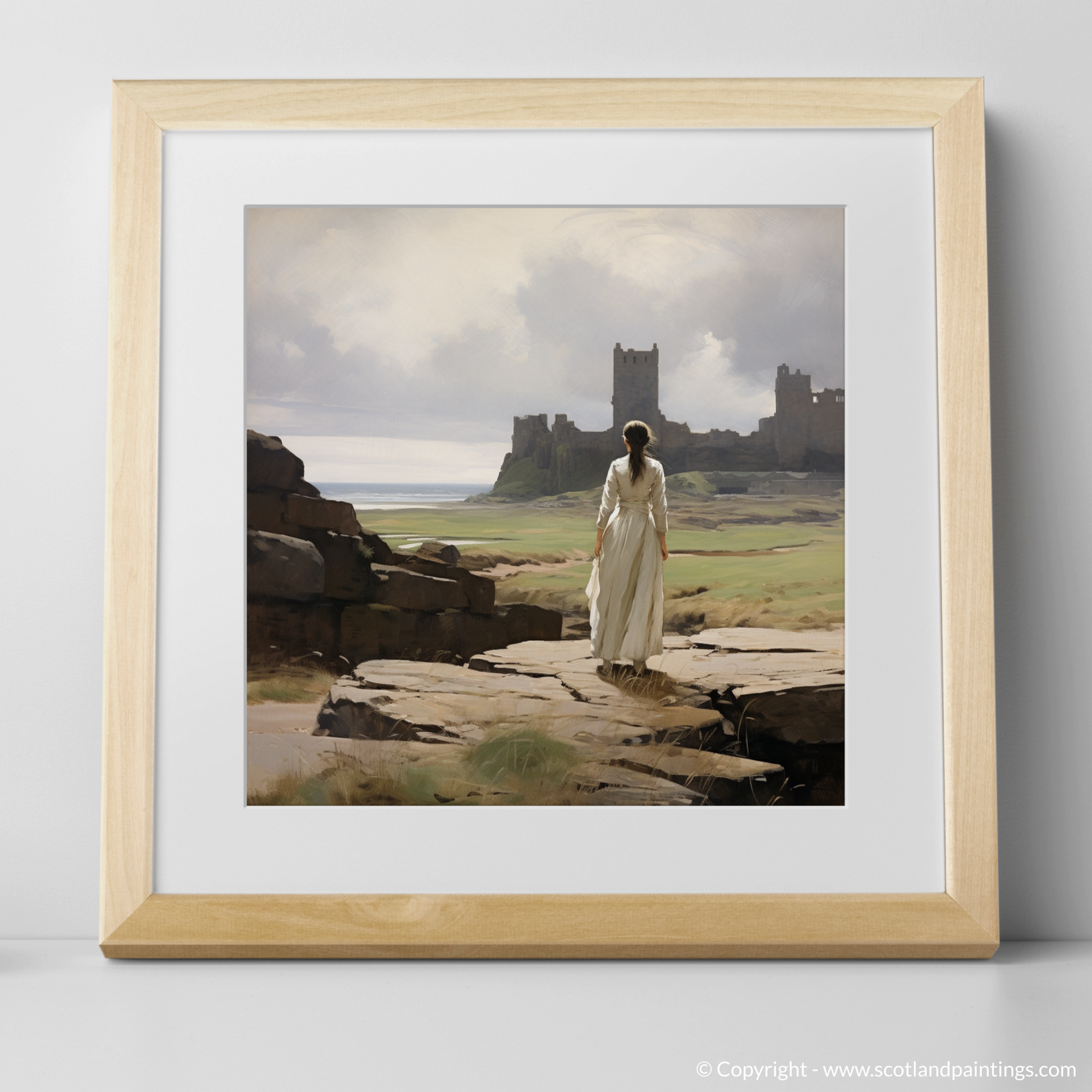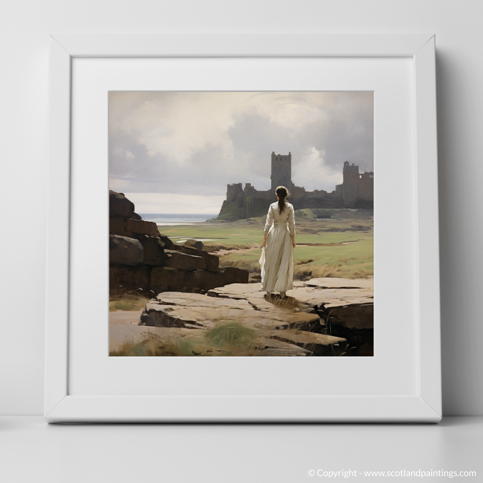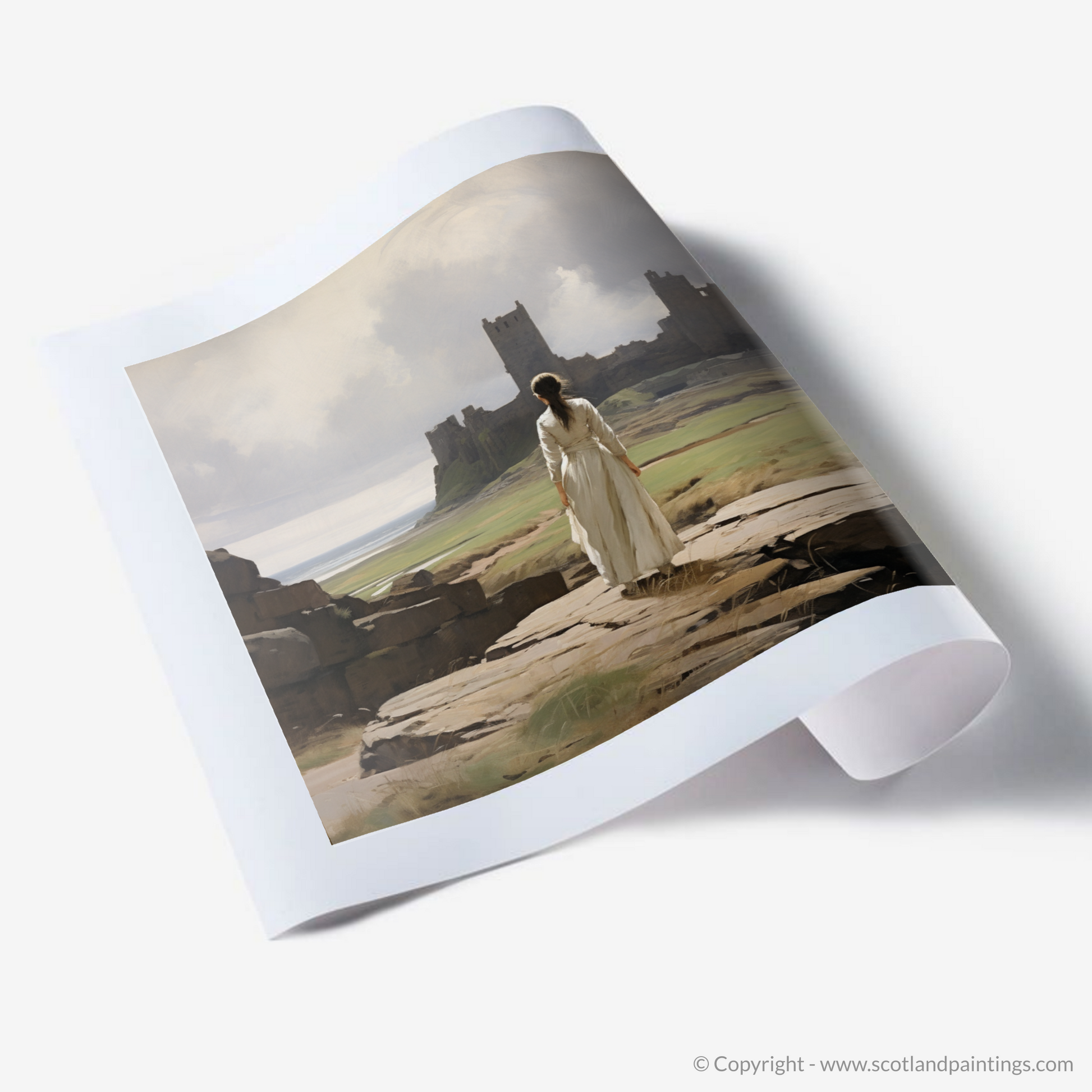 Capturing the serene atmosphere of a bygone era, this evocative print transports the viewer to a windswept vista where the grandeur of Tantallon Castle's ruins stands testament to Scotland's storied past. The central figure, clad in a timeless white dress that billows gently in the coastal breeze, is poised gracefully on a rocky outcrop. Her gaze is drawn to the distant crumbling fortifications that rise majestically against a backdrop of delicate, ethereal skies and the tranquil sea beyond.