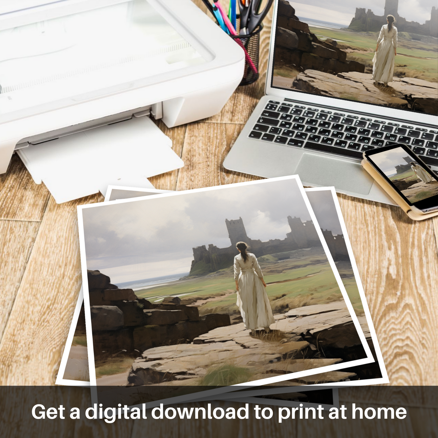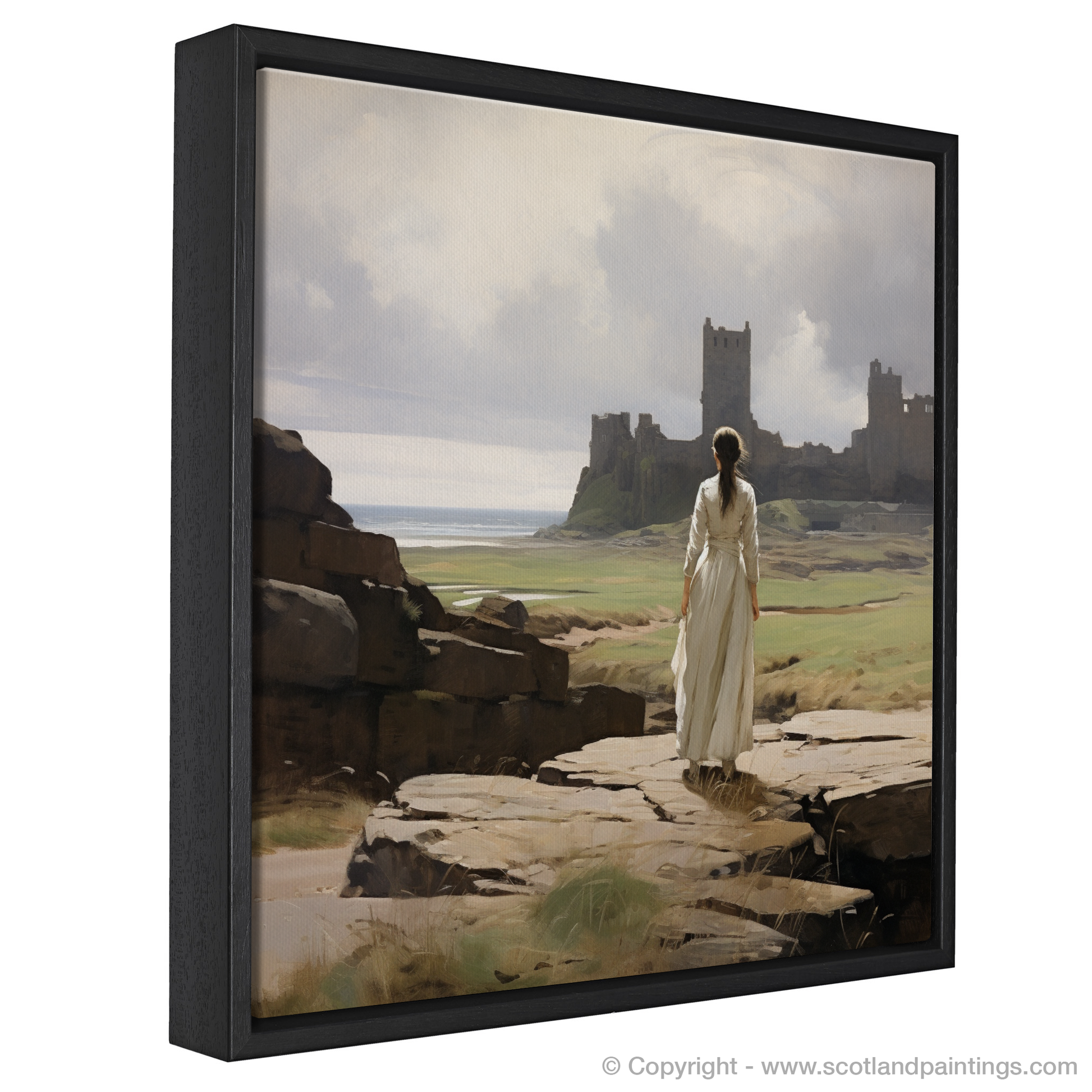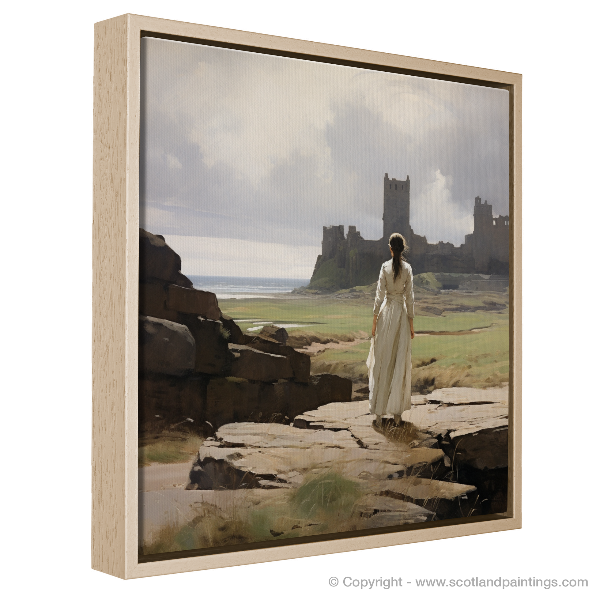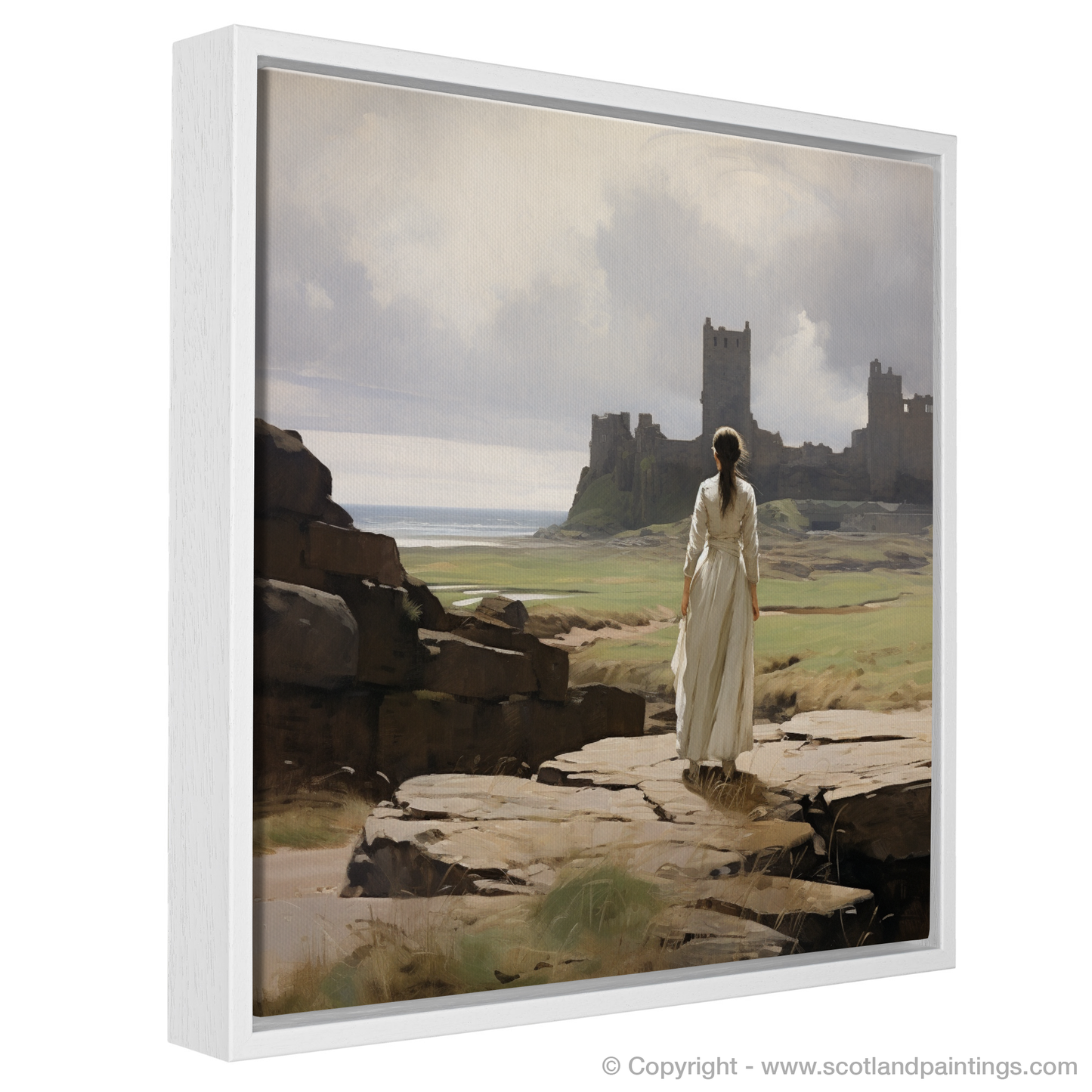Capturing the serene atmosphere of a bygone era, this evocative print transports the viewer to a windswept vista where the grandeur of Tantallon Castle's ruins stands testament to Scotland's storied past. The central figure, clad in a timeless white dress that billows gently in the coastal breeze, is poised gracefully on a rocky outcrop. Her gaze is drawn to the distant crumbling fortifications that rise majestically against a backdrop of delicate, ethereal skies and the tranquil sea beyond.