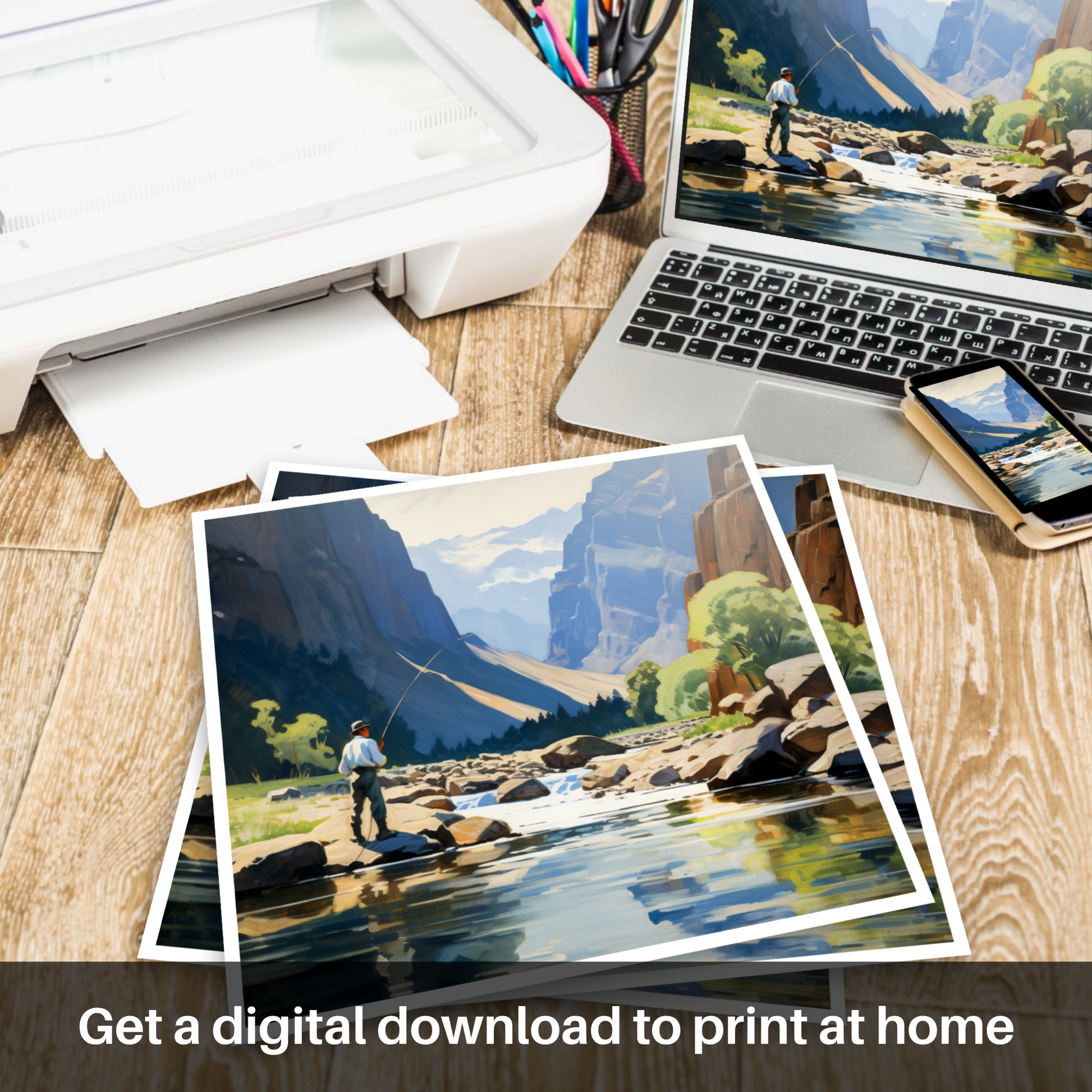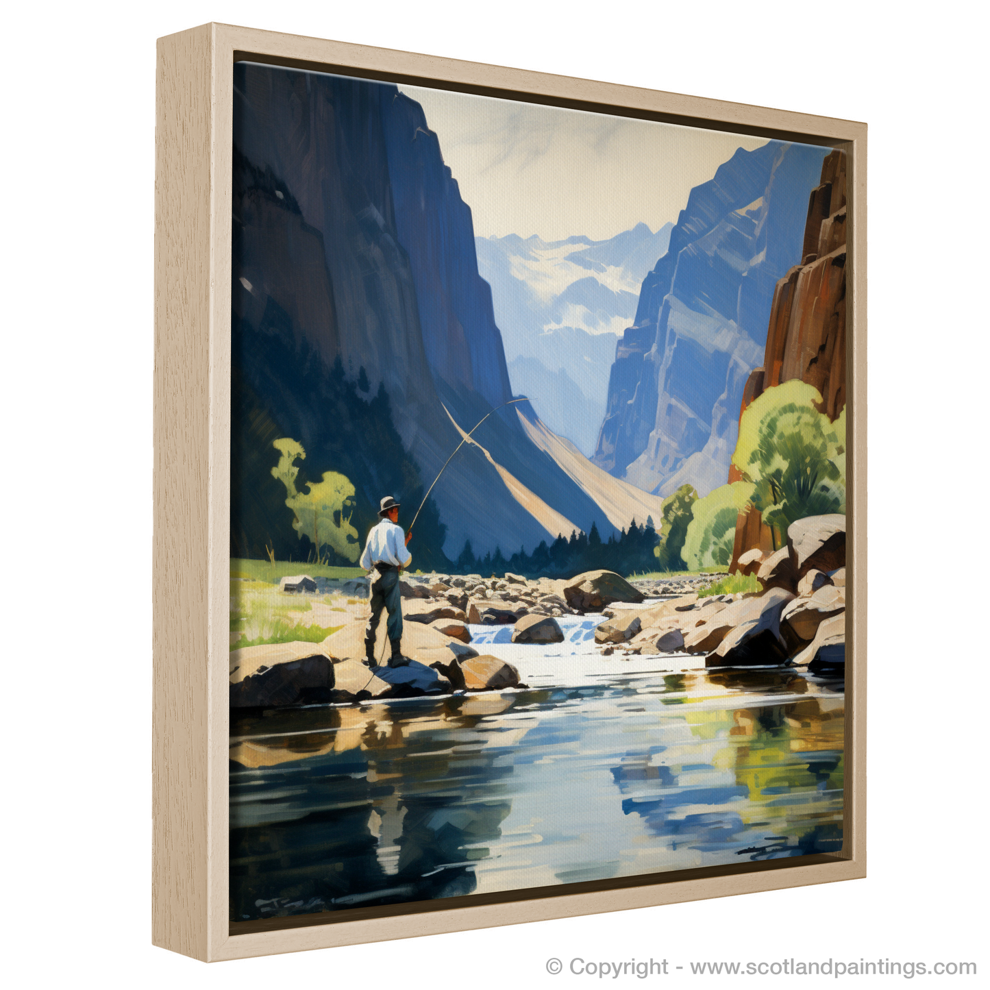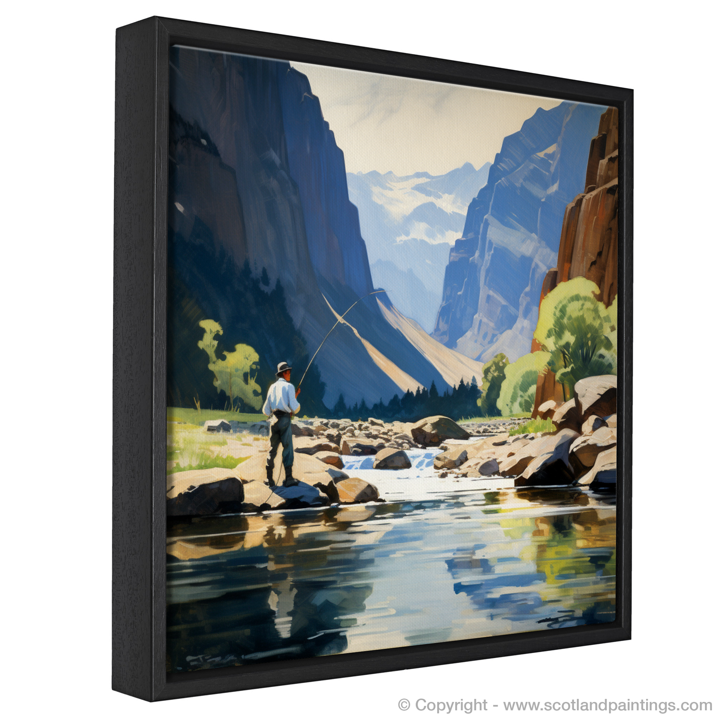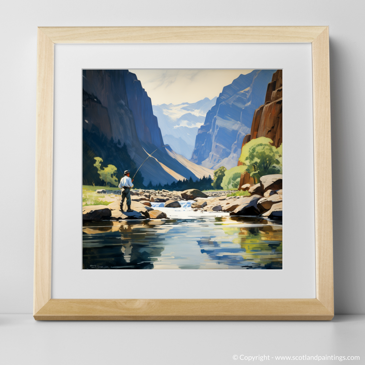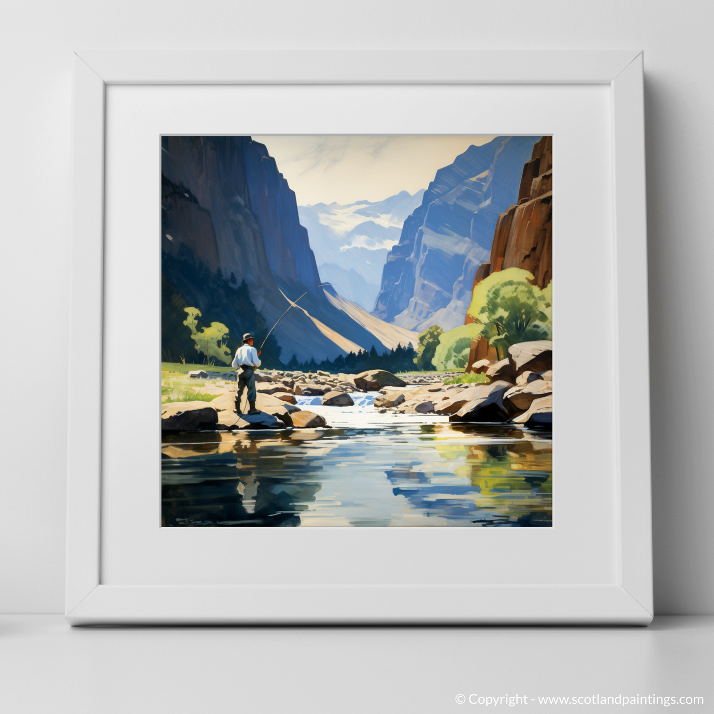 Imagine stepping into a serene landscape where nature's grandeur meets tranquility - this evocative print captures the timeless essence of fly fishing in the majestic settings of Scotland. It invites viewers into a world where the gentle sounds of a flowing river and the distant call of birds are the only interruptions to the soothing silence.