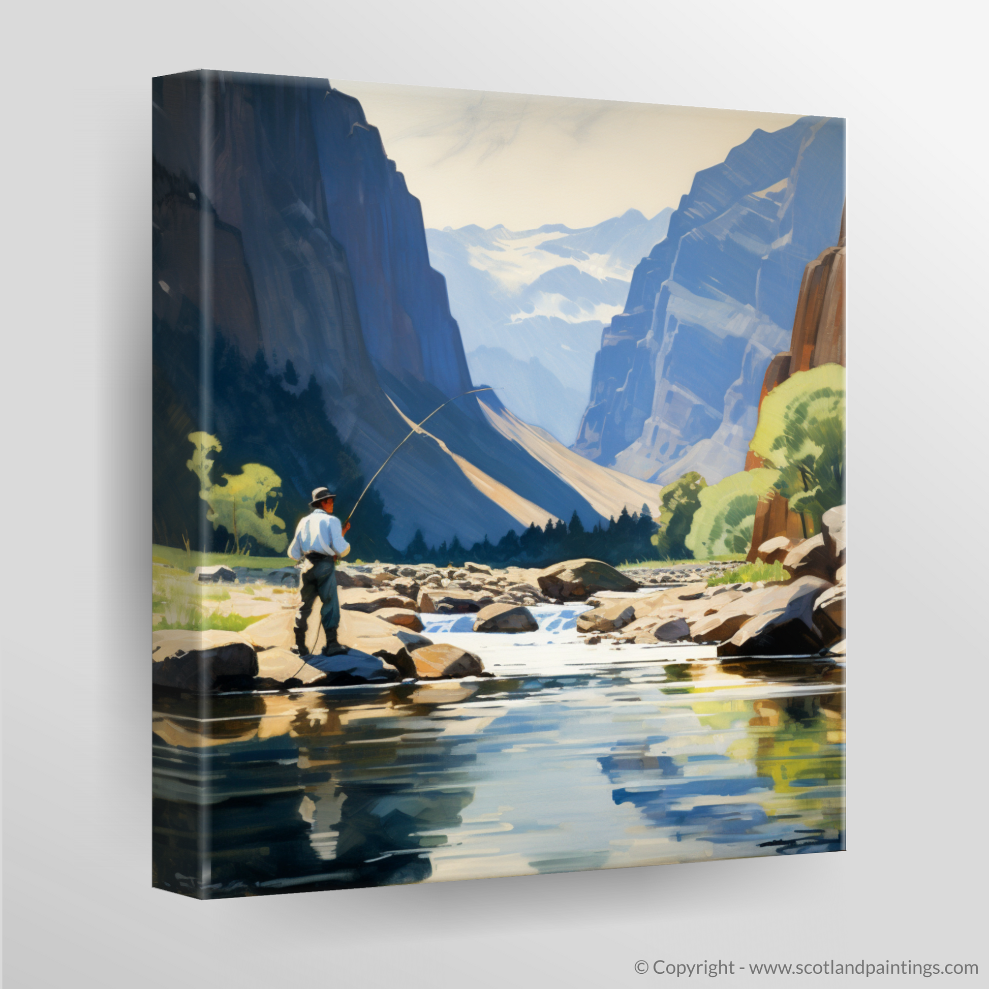 In the foreground, a solitary figure stands mid-stream, lost in concentration, as he skillfully casts his line across the glassy water. Clad in a light shirt and dark trousers, the angler's steady posture and keen focus convey a sense of harmonious interaction with the environment.