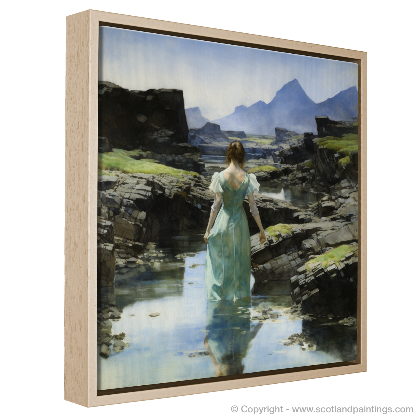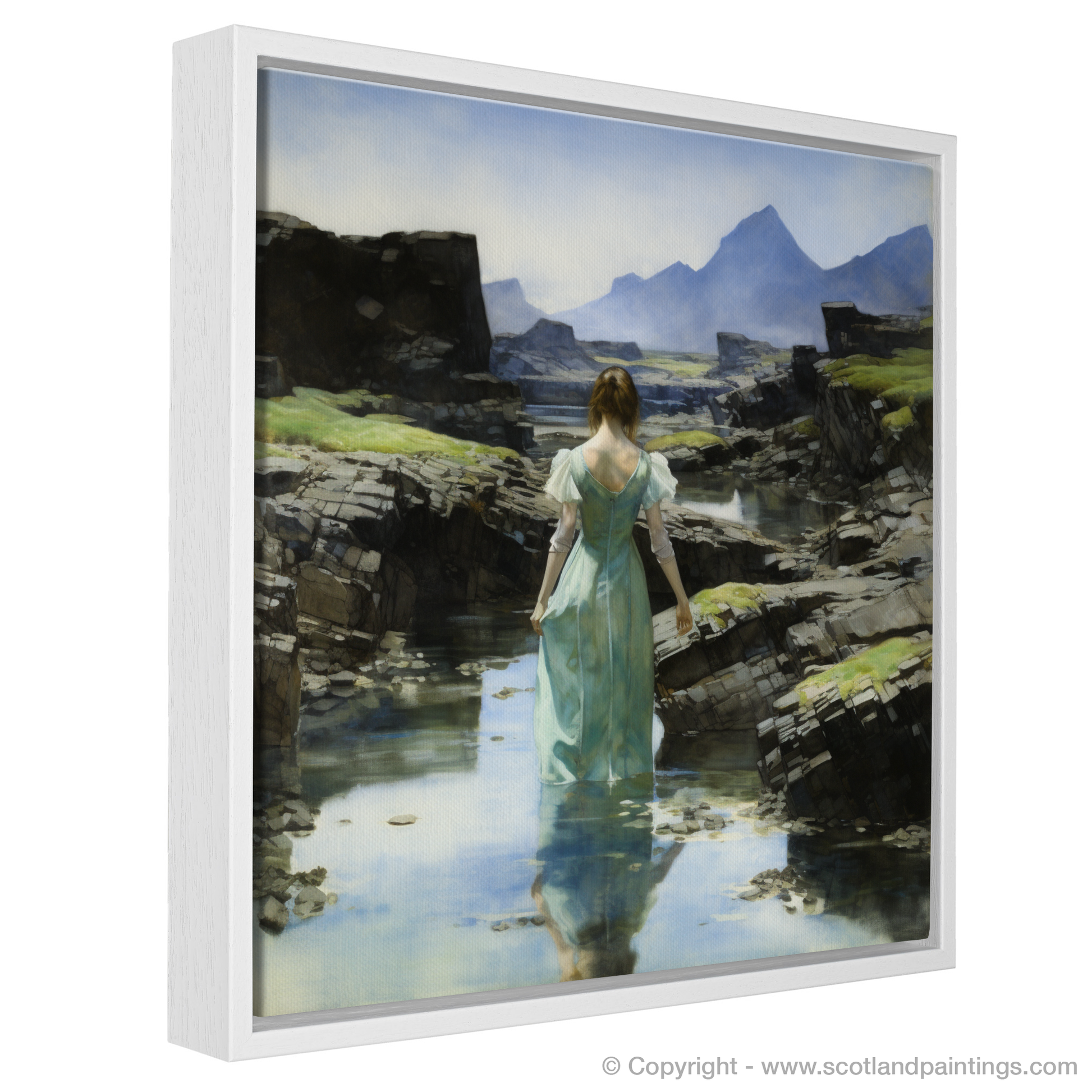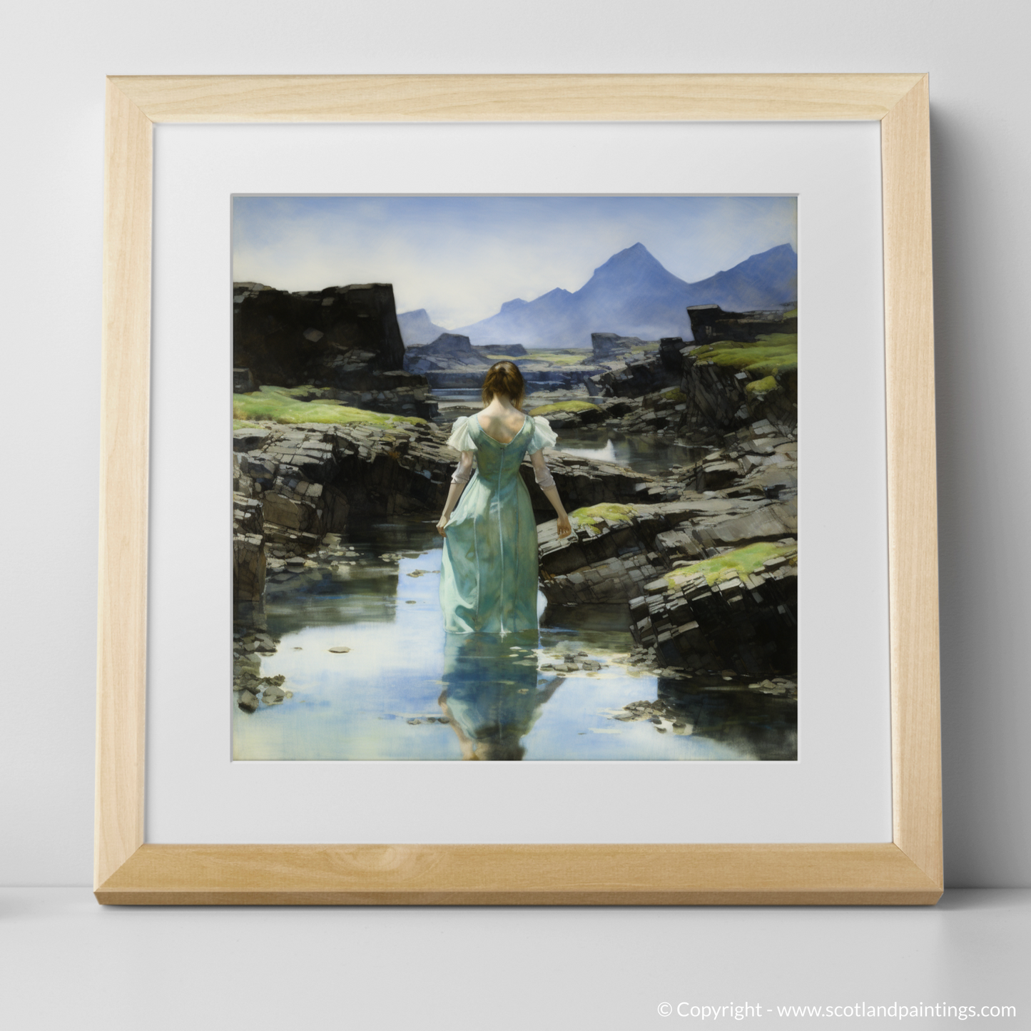 Captured with exquisite attention to detail, this mesmerising print invites the viewer into a scene of tranquil beauty and timeless elegance. A solitary woman, dressed in an ethereal white dress that gently skims the serene water, stands as a graceful figure amidst the rugged splendour of the Fairy Pools. The cool, pastel hue of her garment contrasts with the warm tones of the rocks and the rich greens of the moss that adorns them, creating a harmonious palette that soothes the senses.