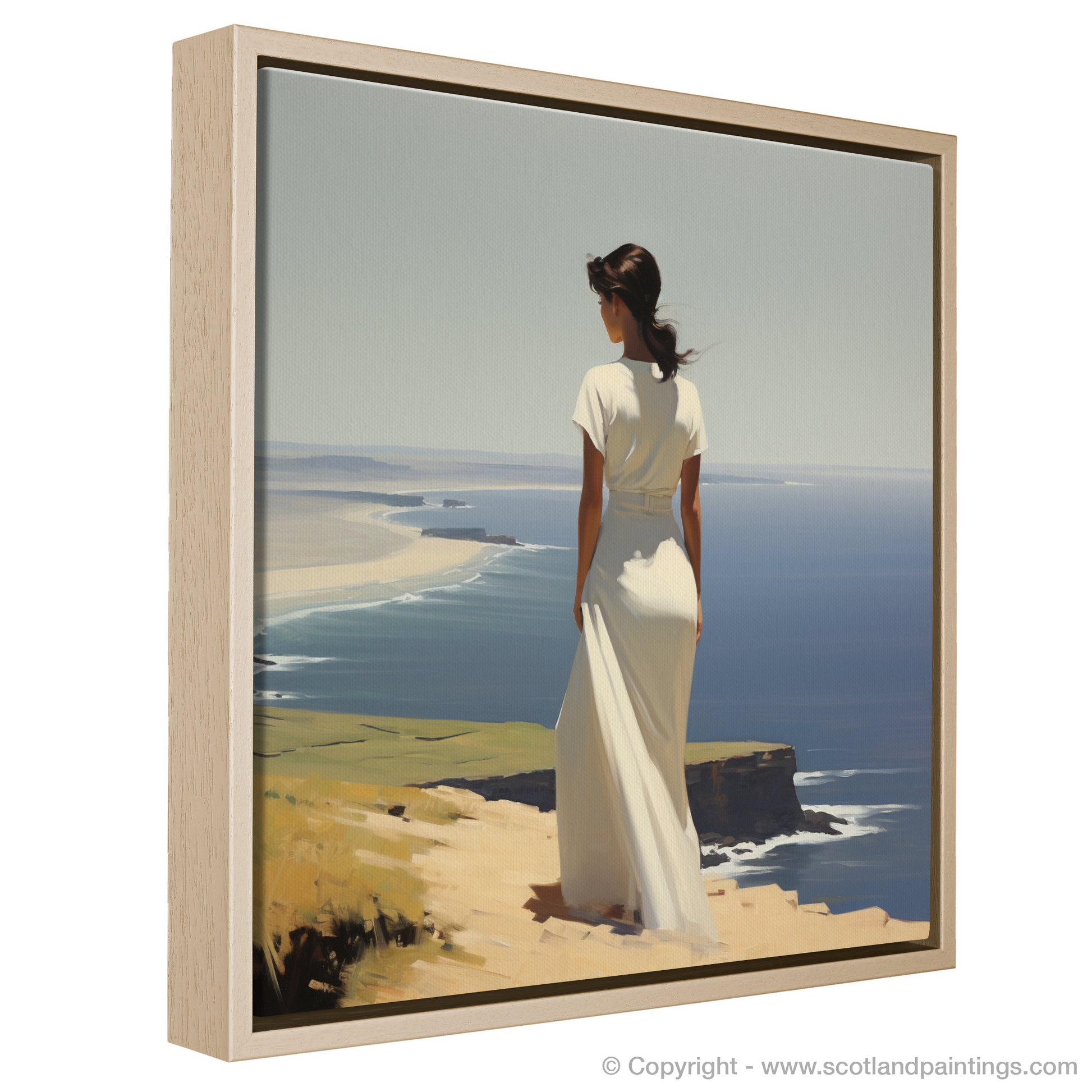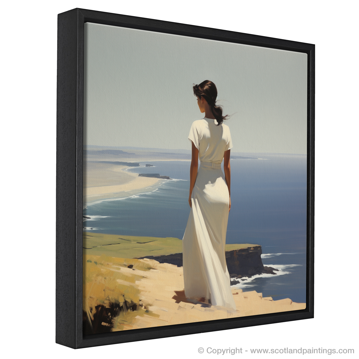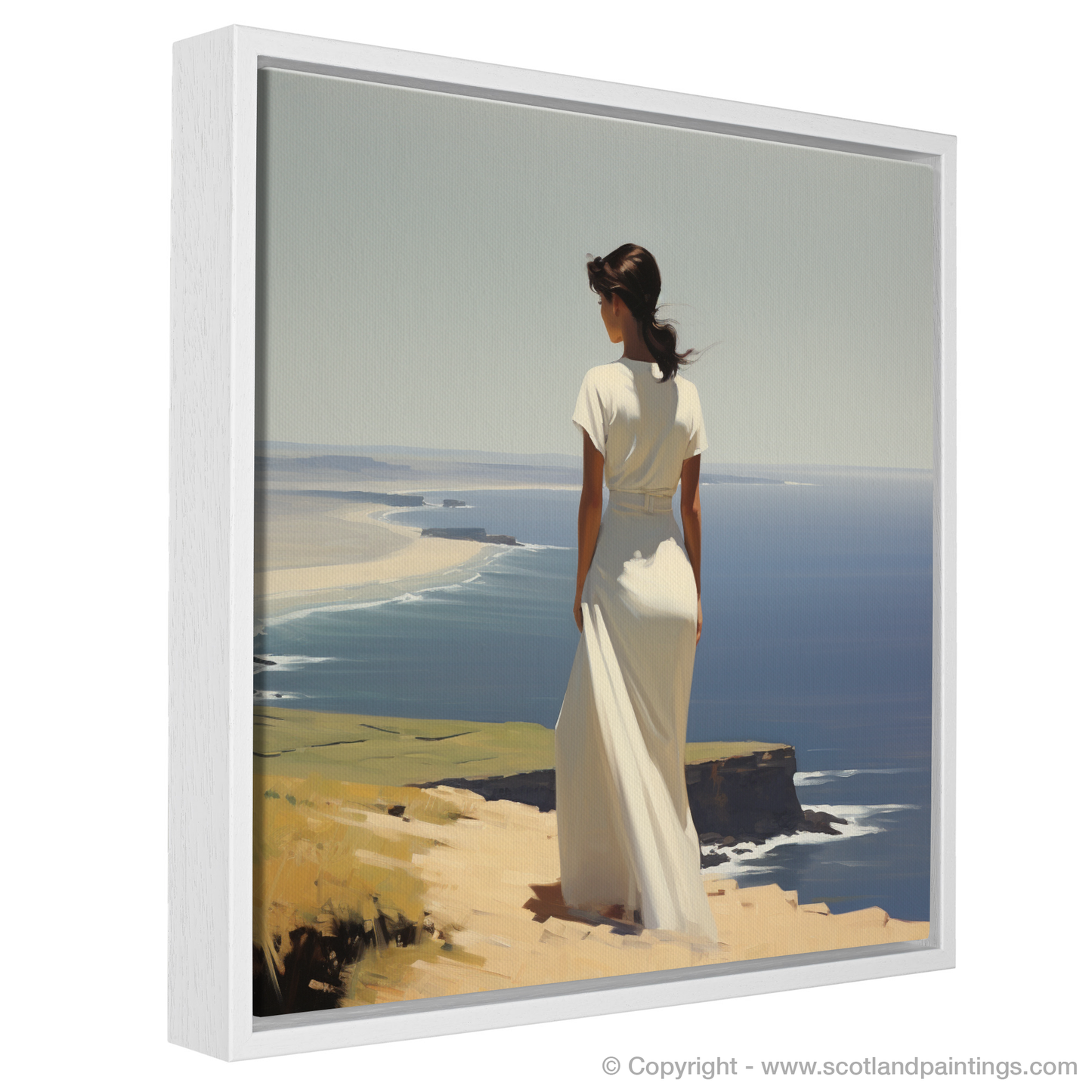 Gazing upon the untouched splendour of Orkney's rugged coastline, the central figure in this evocative print stands poised with an air of serene contemplation. Clad in an ethereal white dress that gently clings to her form, the woman exudes an aura of grace and poise. The gentle undulations of the fabric, captured with meticulous attention to detail, suggest a soft breeze playing over the landscape.